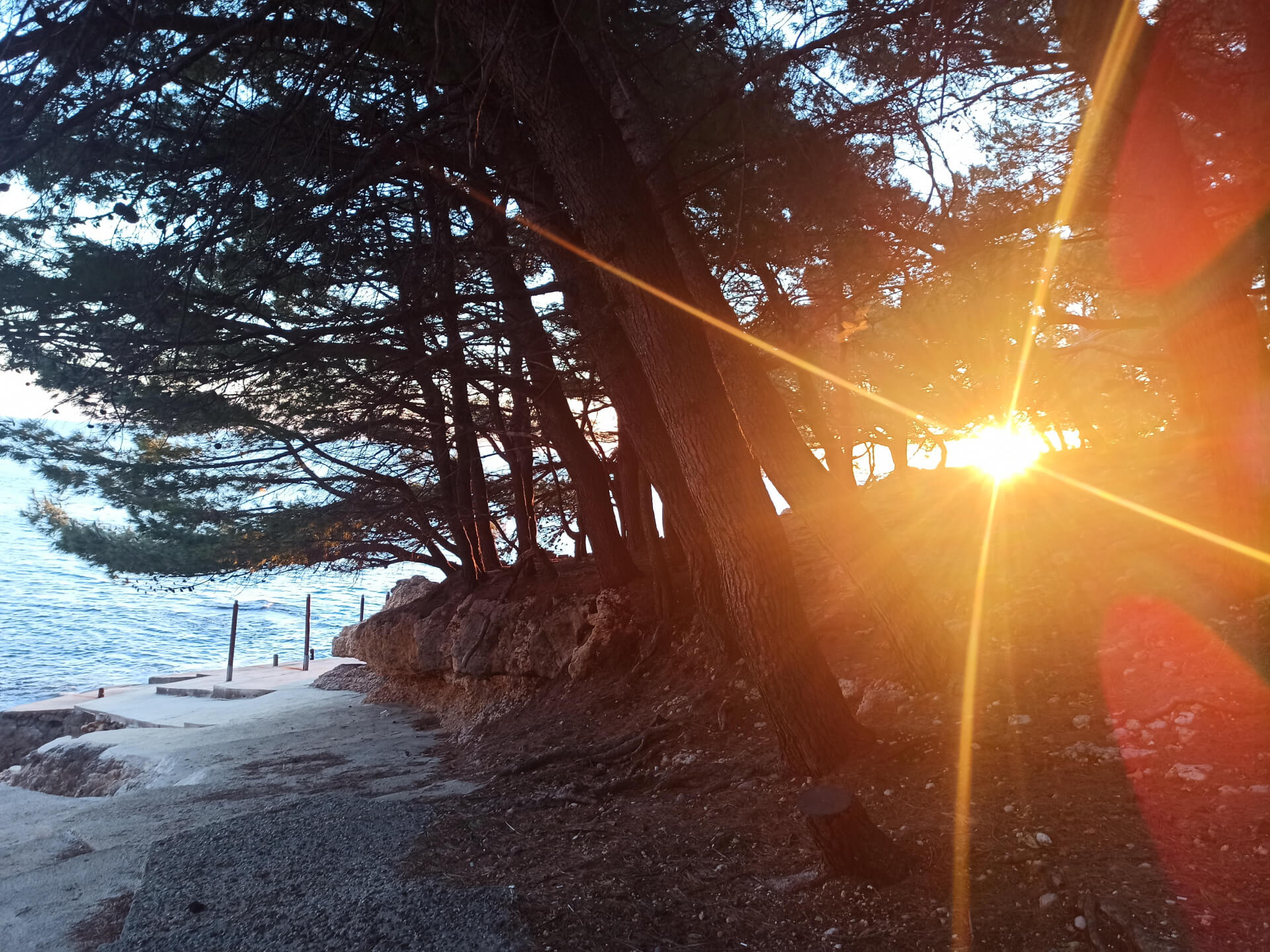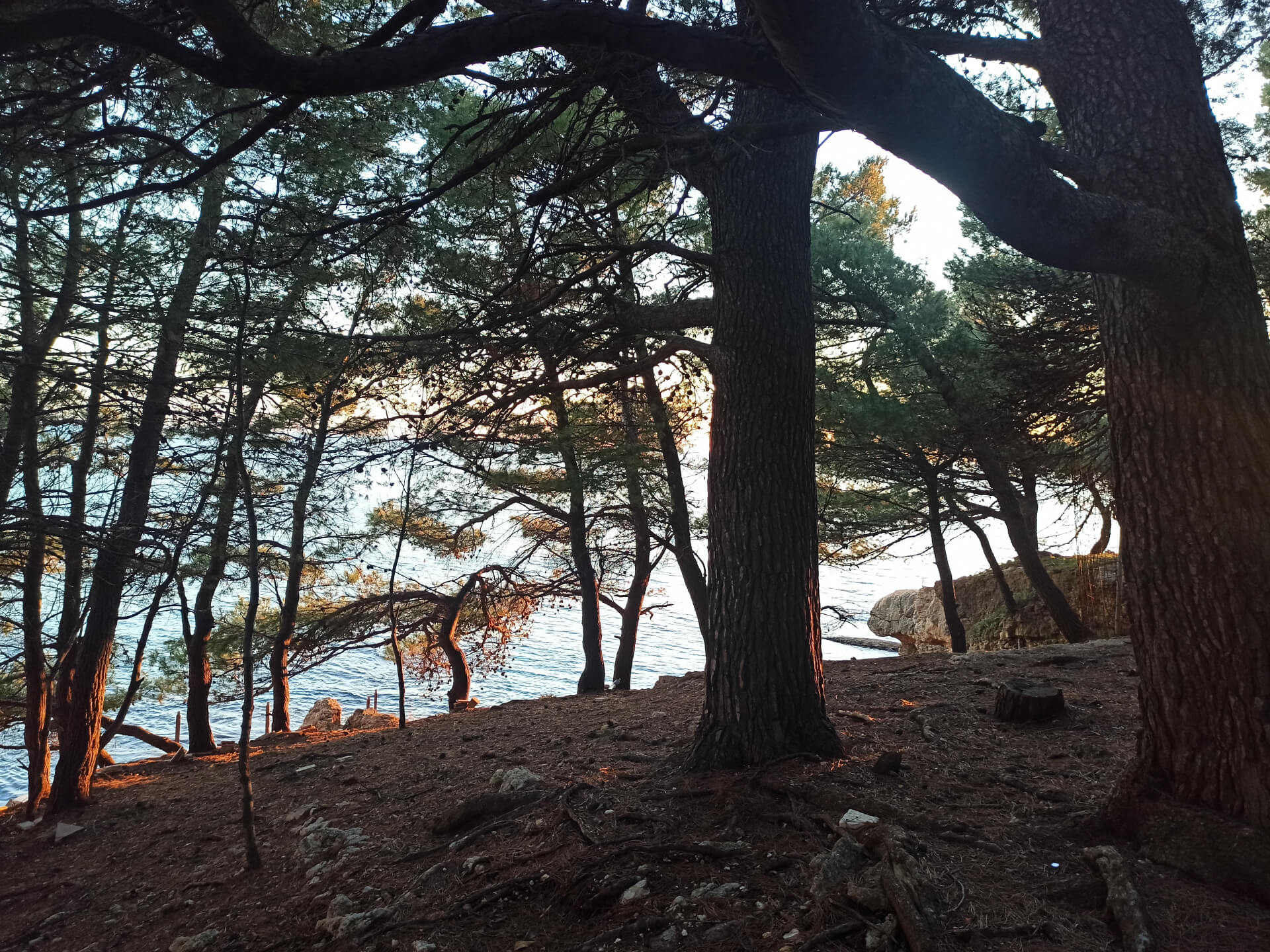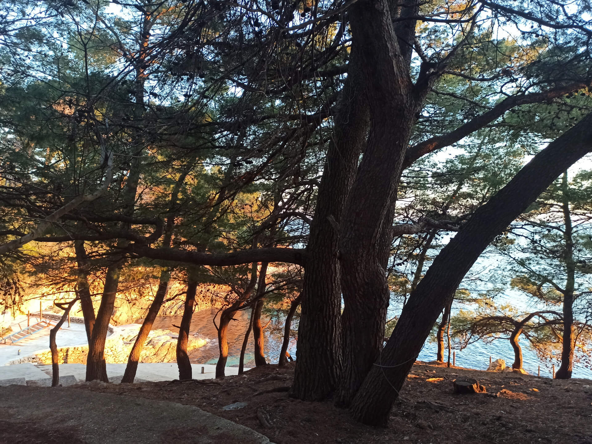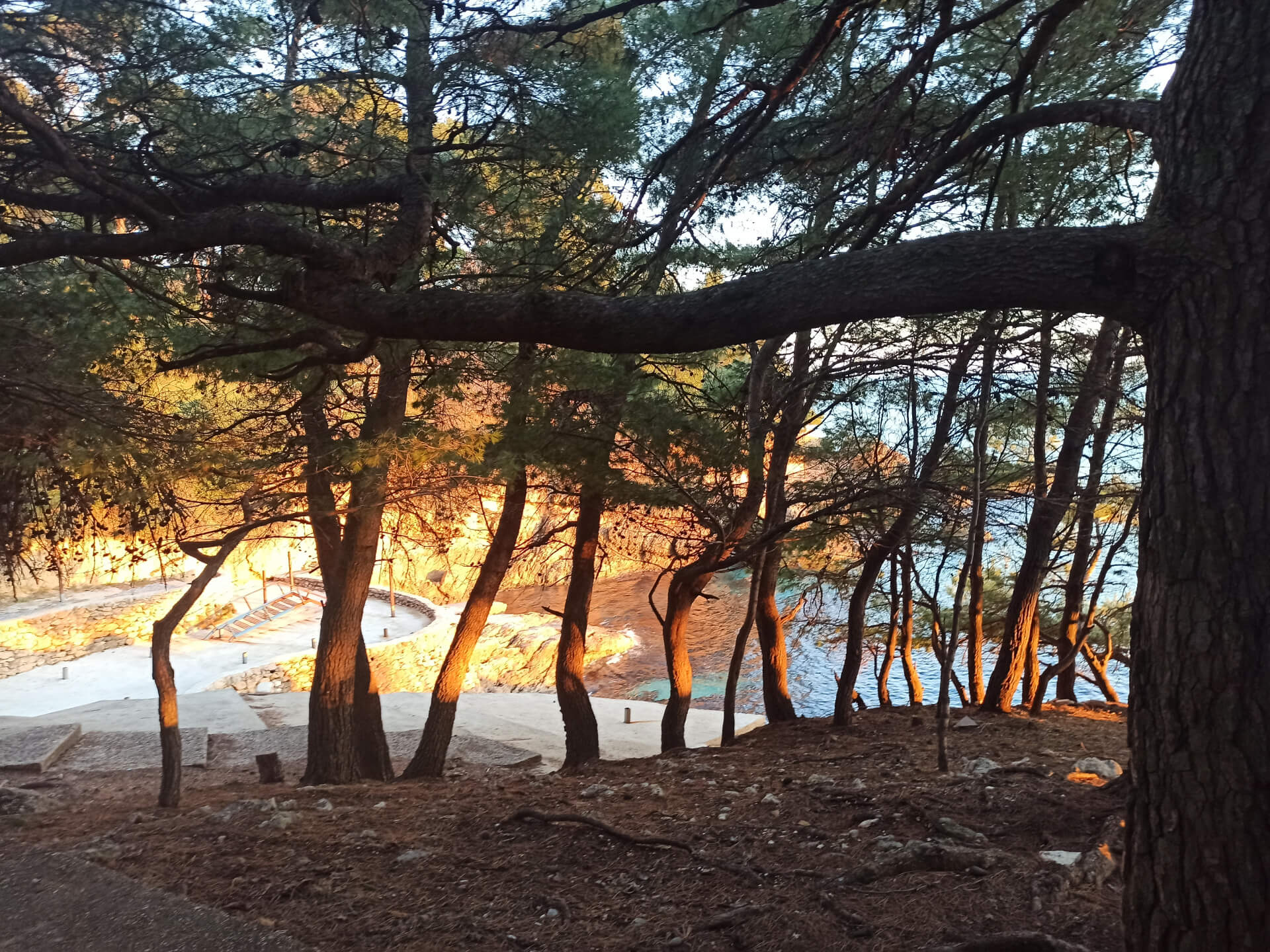 • Highlighted Albatros Nudist Beach with sunset light through the trees