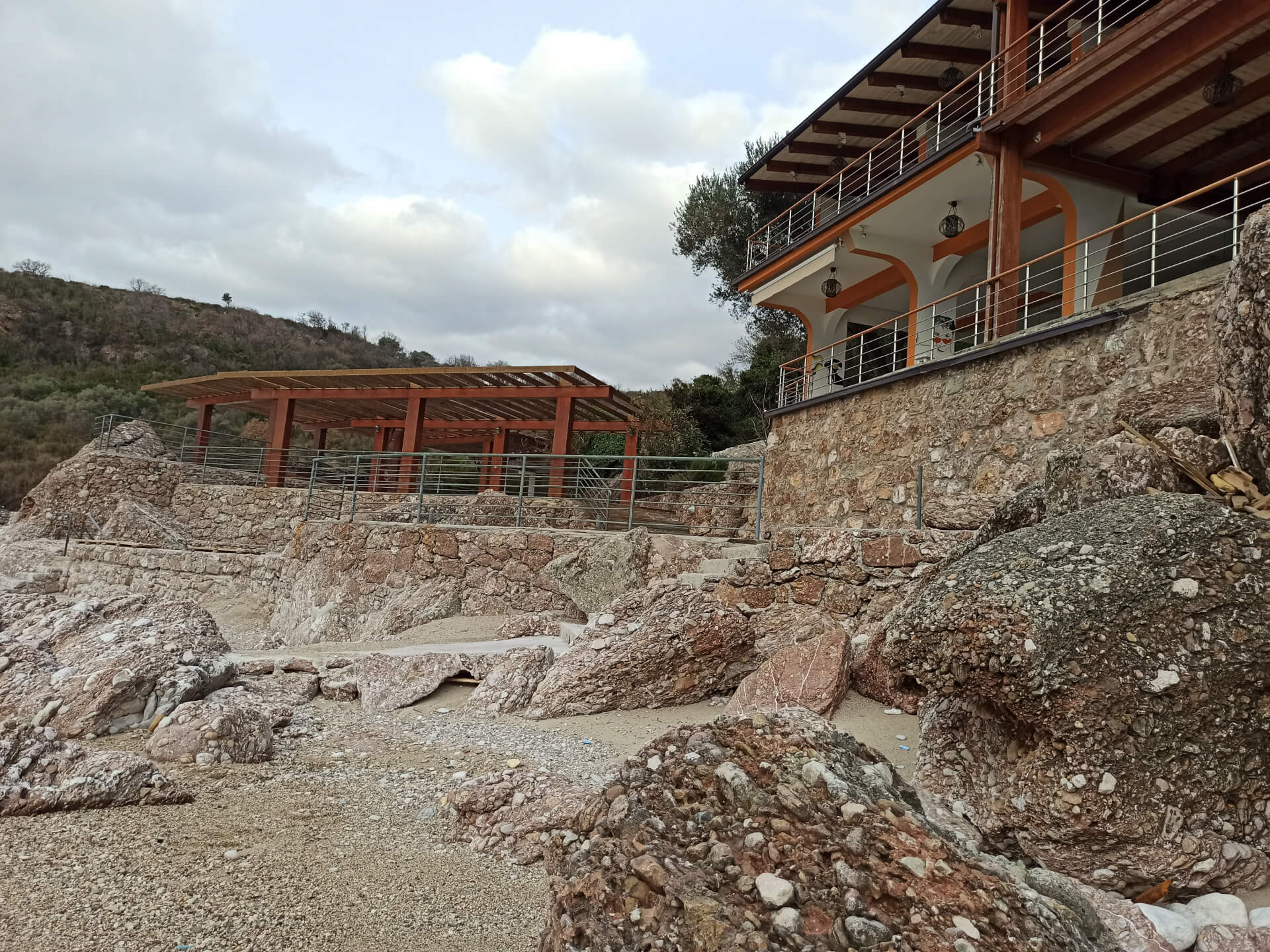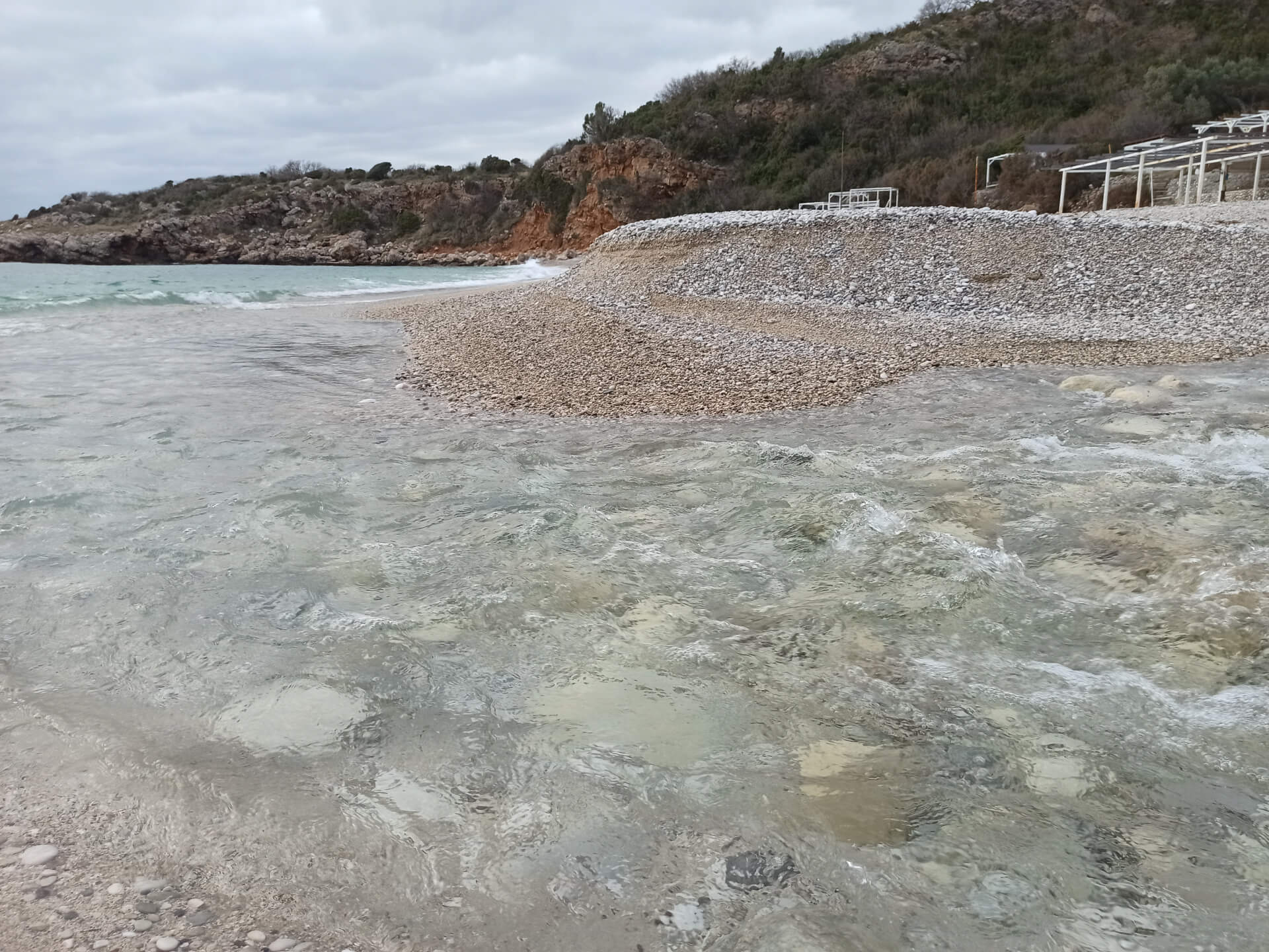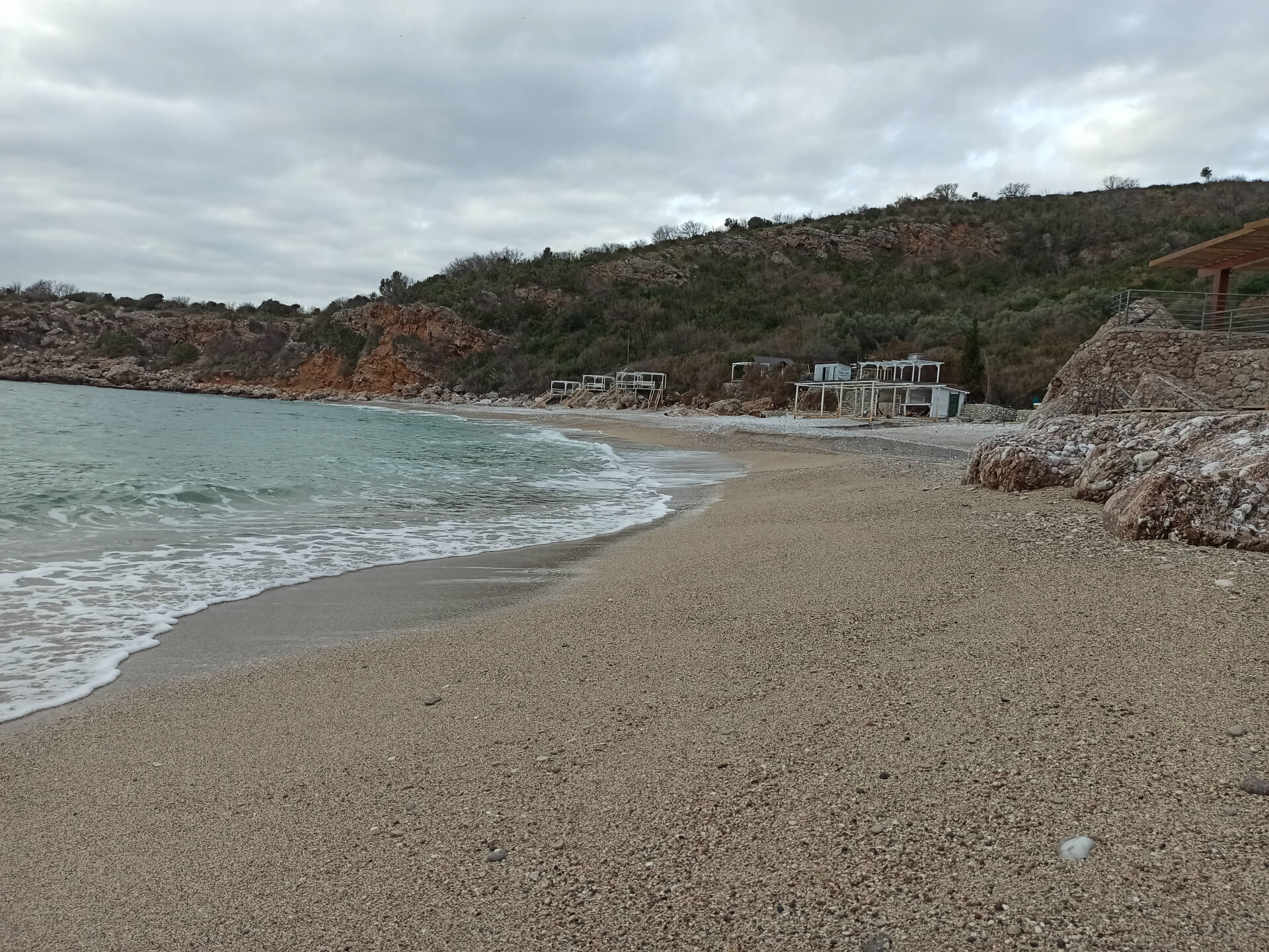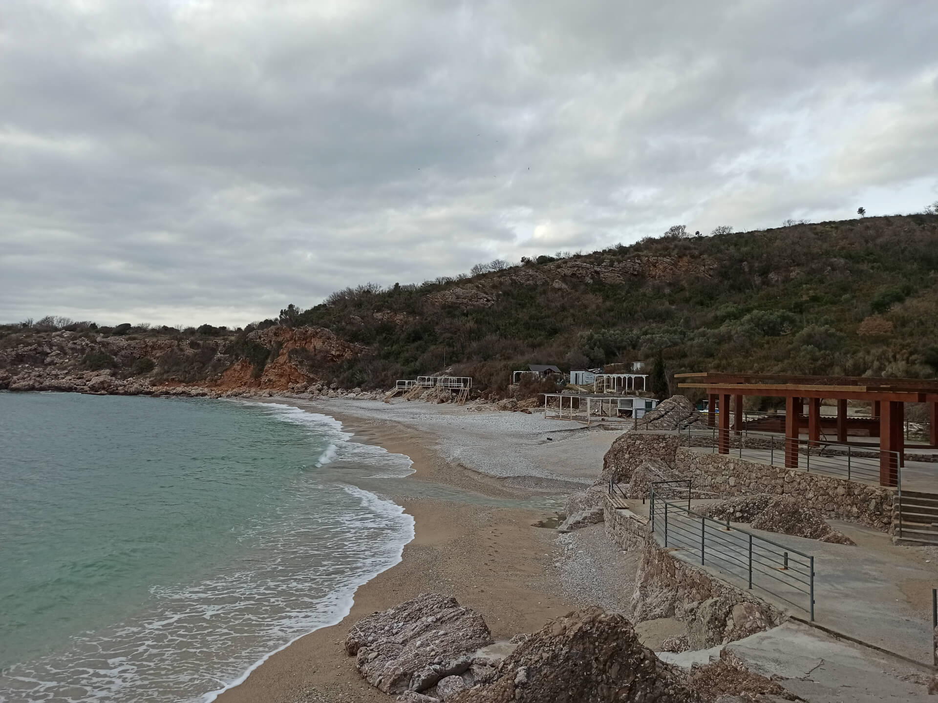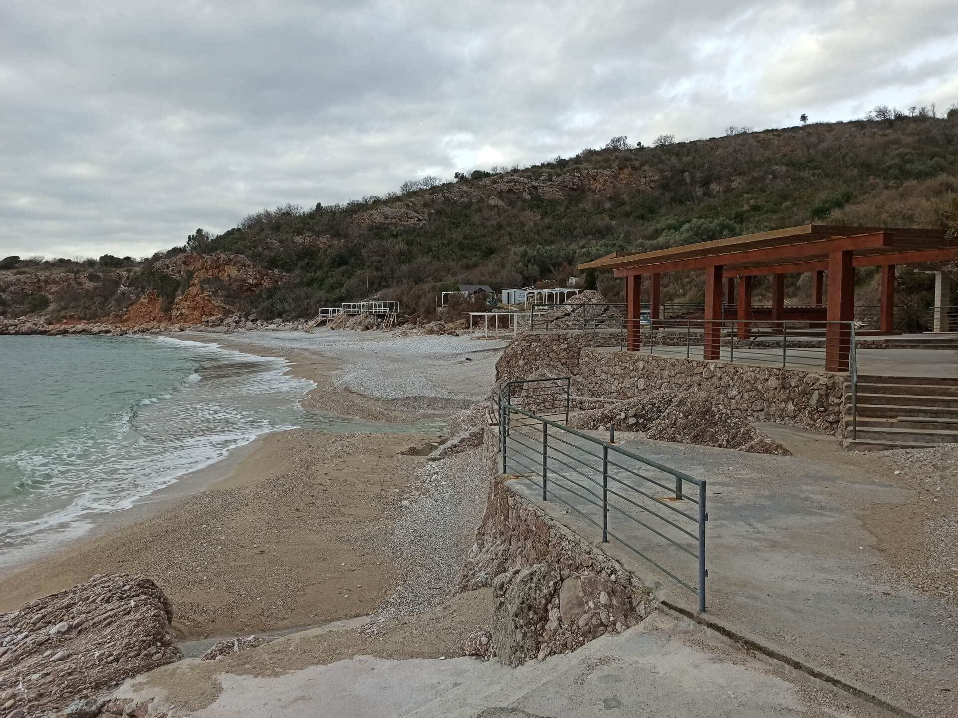 There is a restaurant and cafe that work in a high season. The beach has cascading entrance and own parking. You can see the beach from the hill and enjoy the view to the surrounding olive grove. At the season you can rent umbrellas and sunbeds as well as take your own sunbed with you.