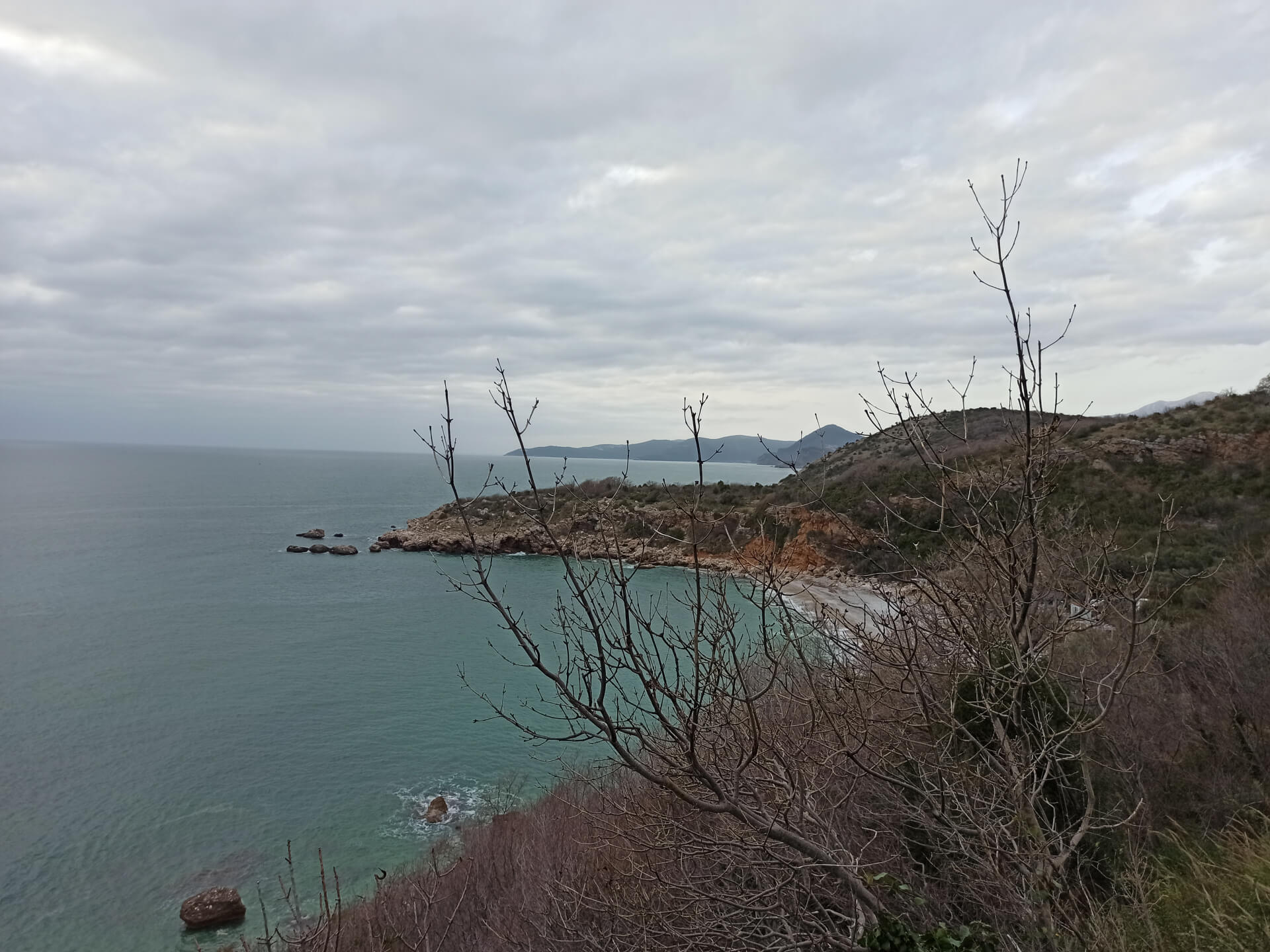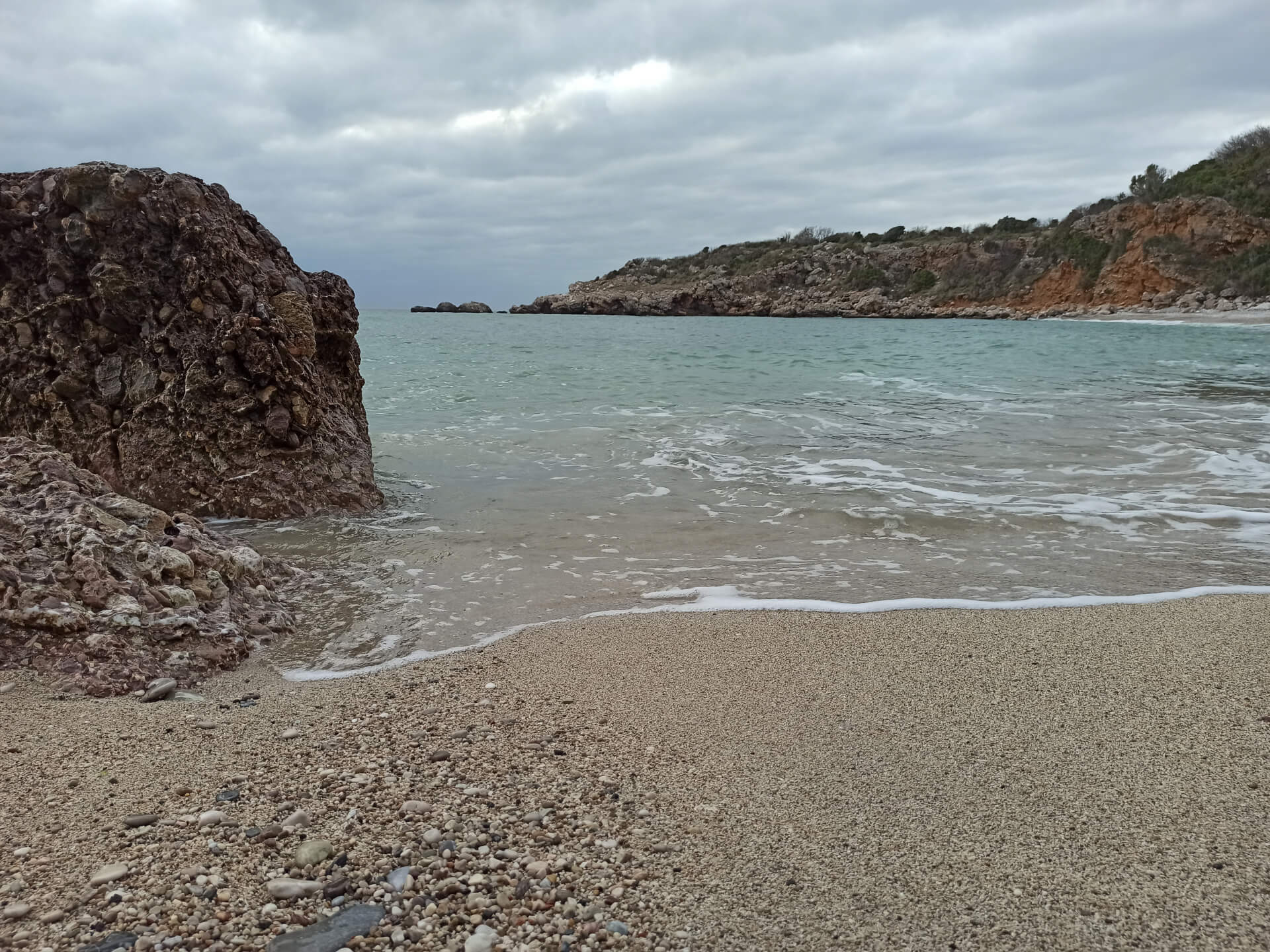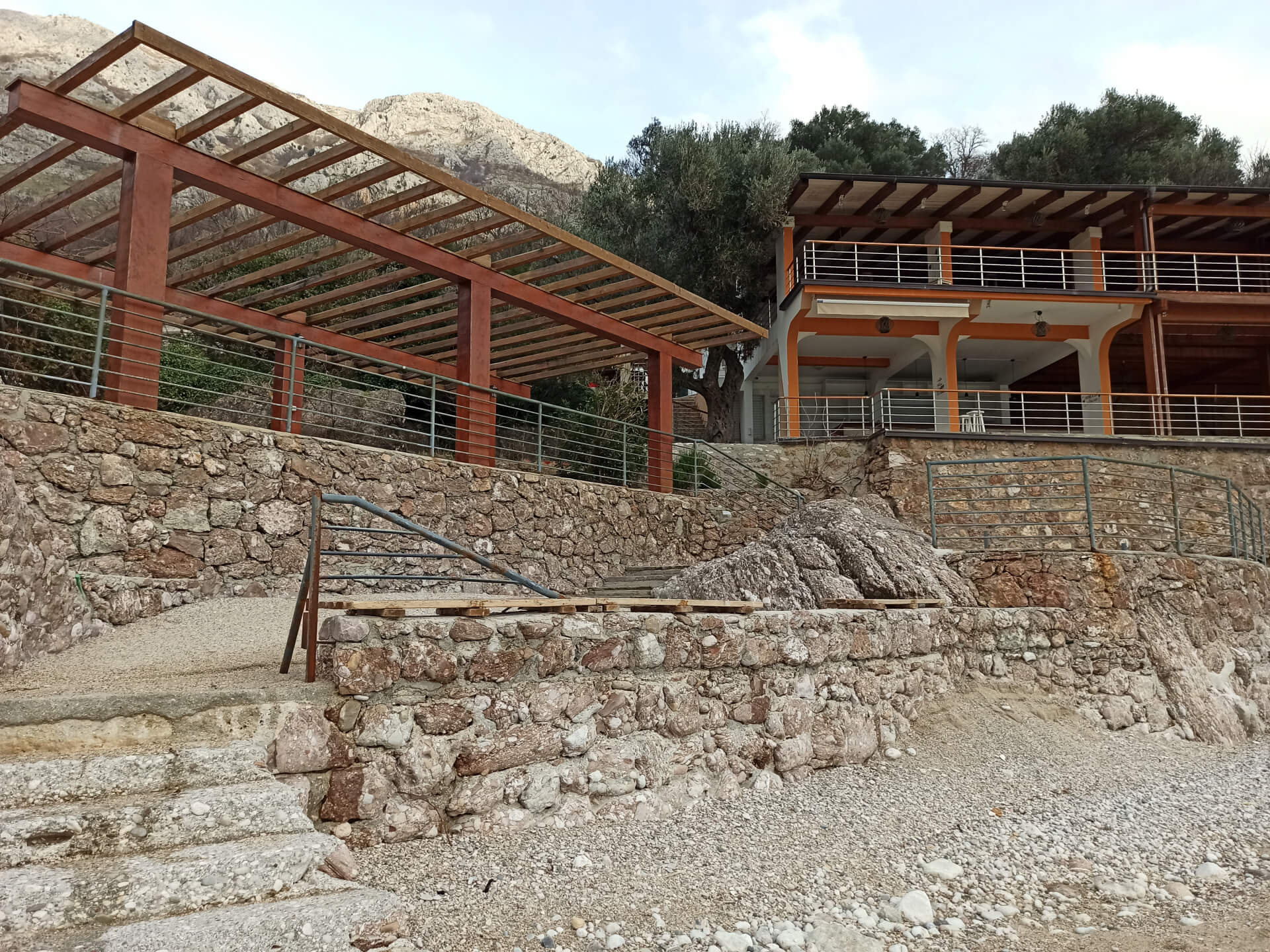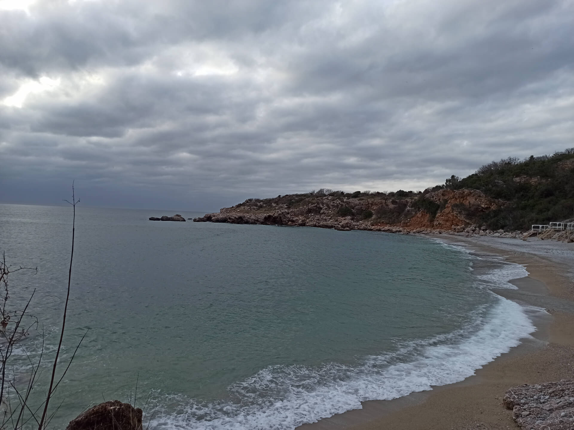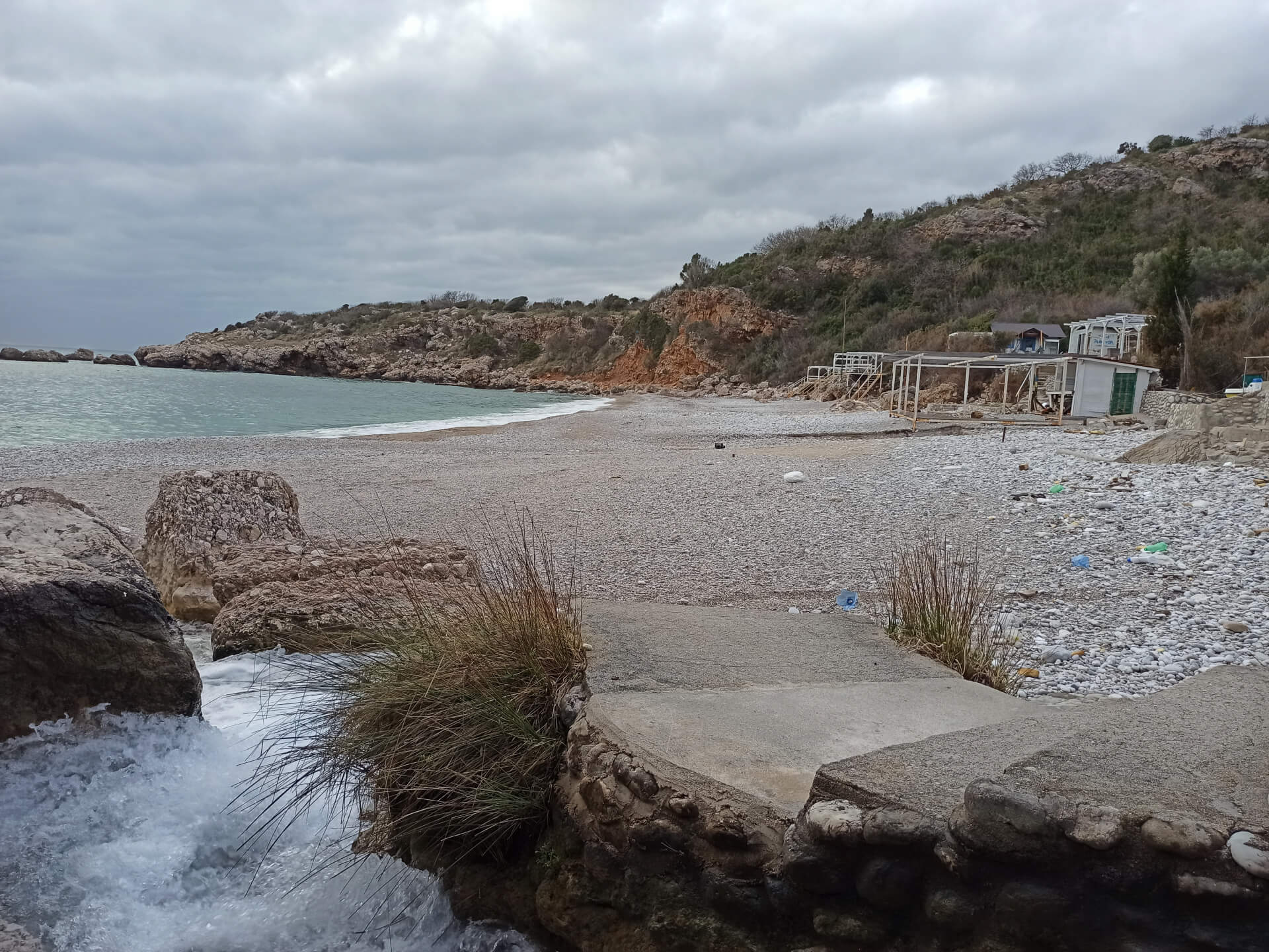 There is a restaurant and cafe that work in a high season. The beach has cascading entrance and own parking. You can see the beach from the hill and enjoy the view to the surrounding olive grove. At the season you can rent umbrellas and sunbeds as well as take your own sunbed with you.