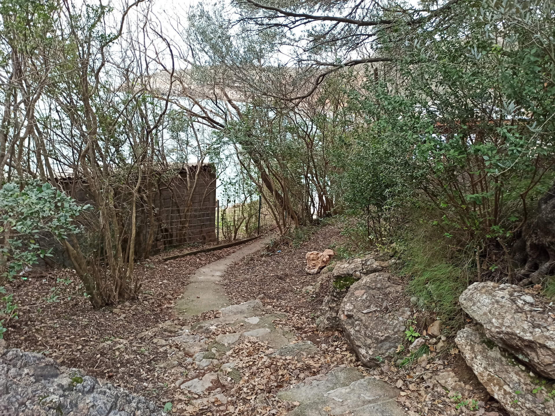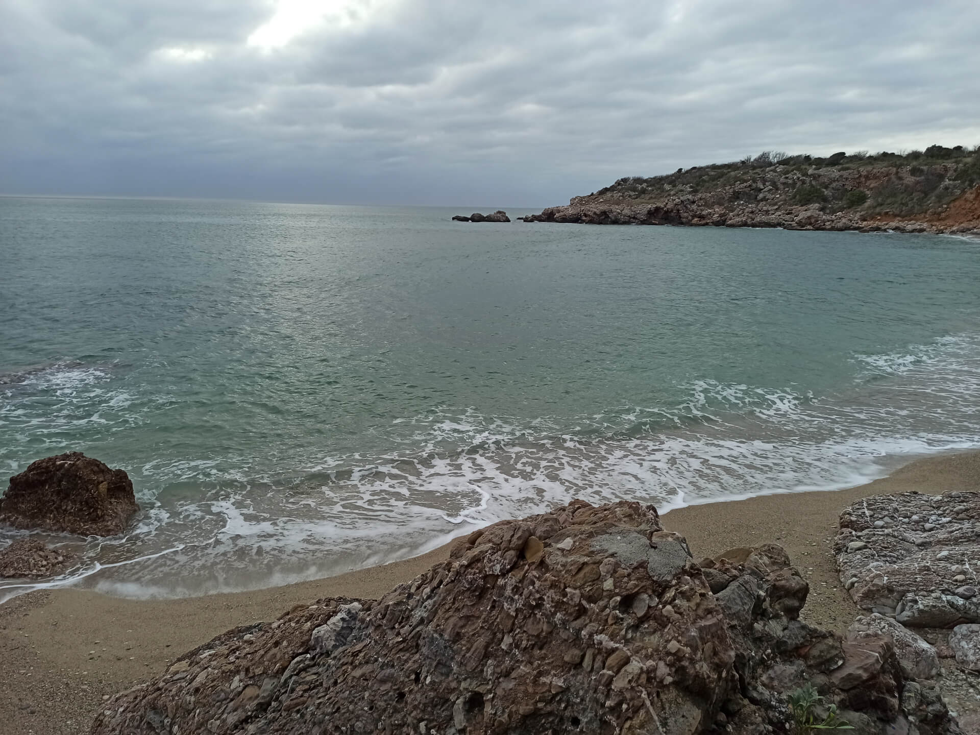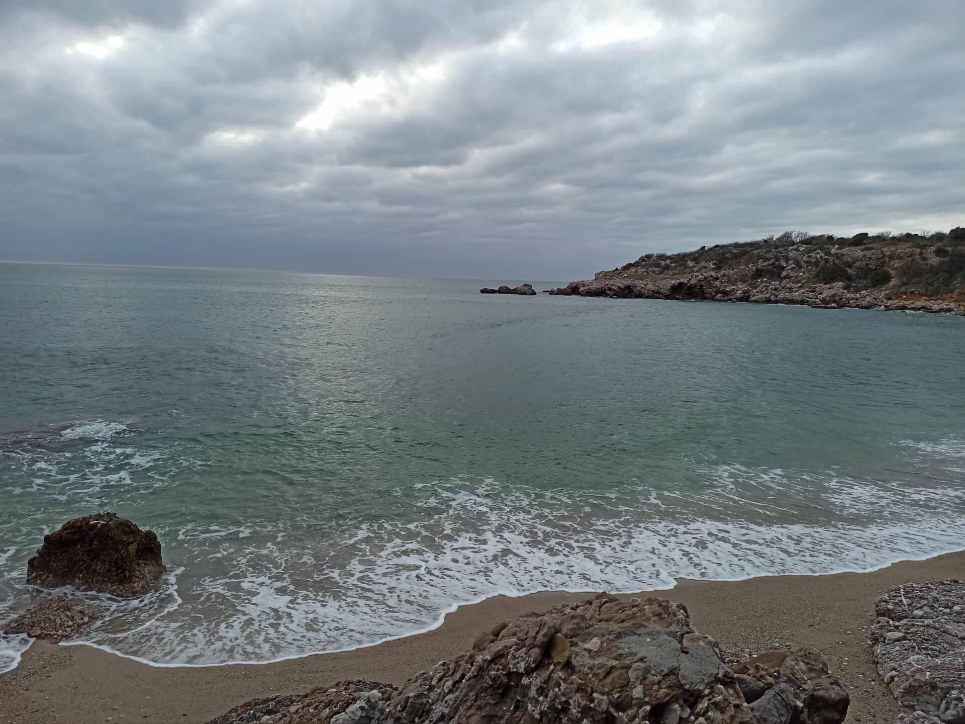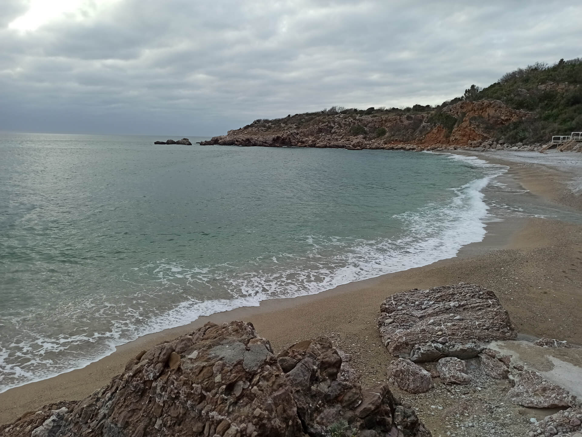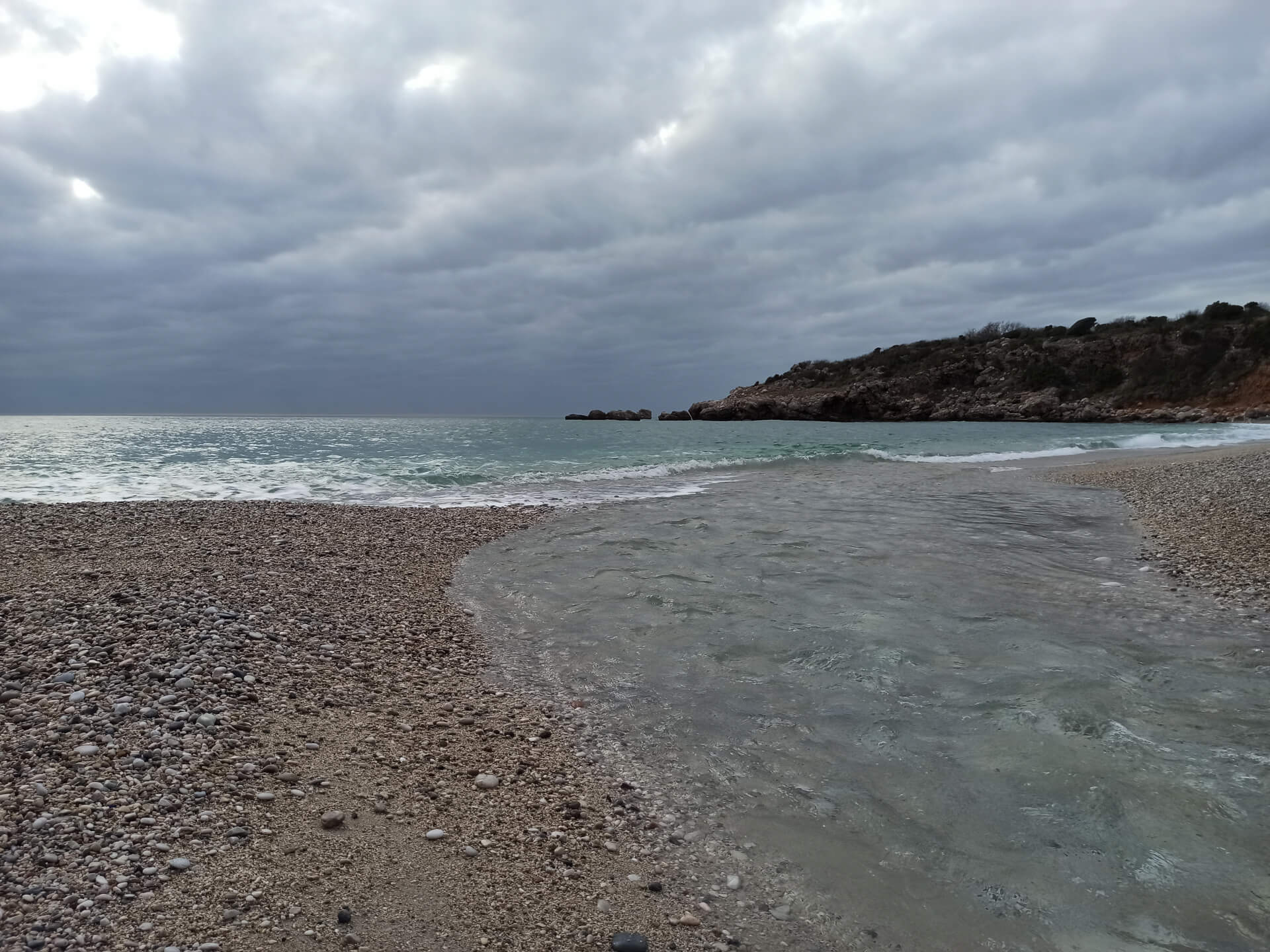 There is a restaurant and cafe that work in a high season. The beach has cascading entrance and own parking. You can see the beach from the hill and enjoy the view to the surrounding olive grove. At the season you can rent umbrellas and sunbeds as well as take your own sunbed with you.