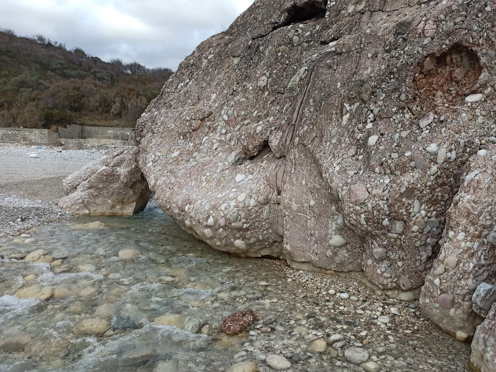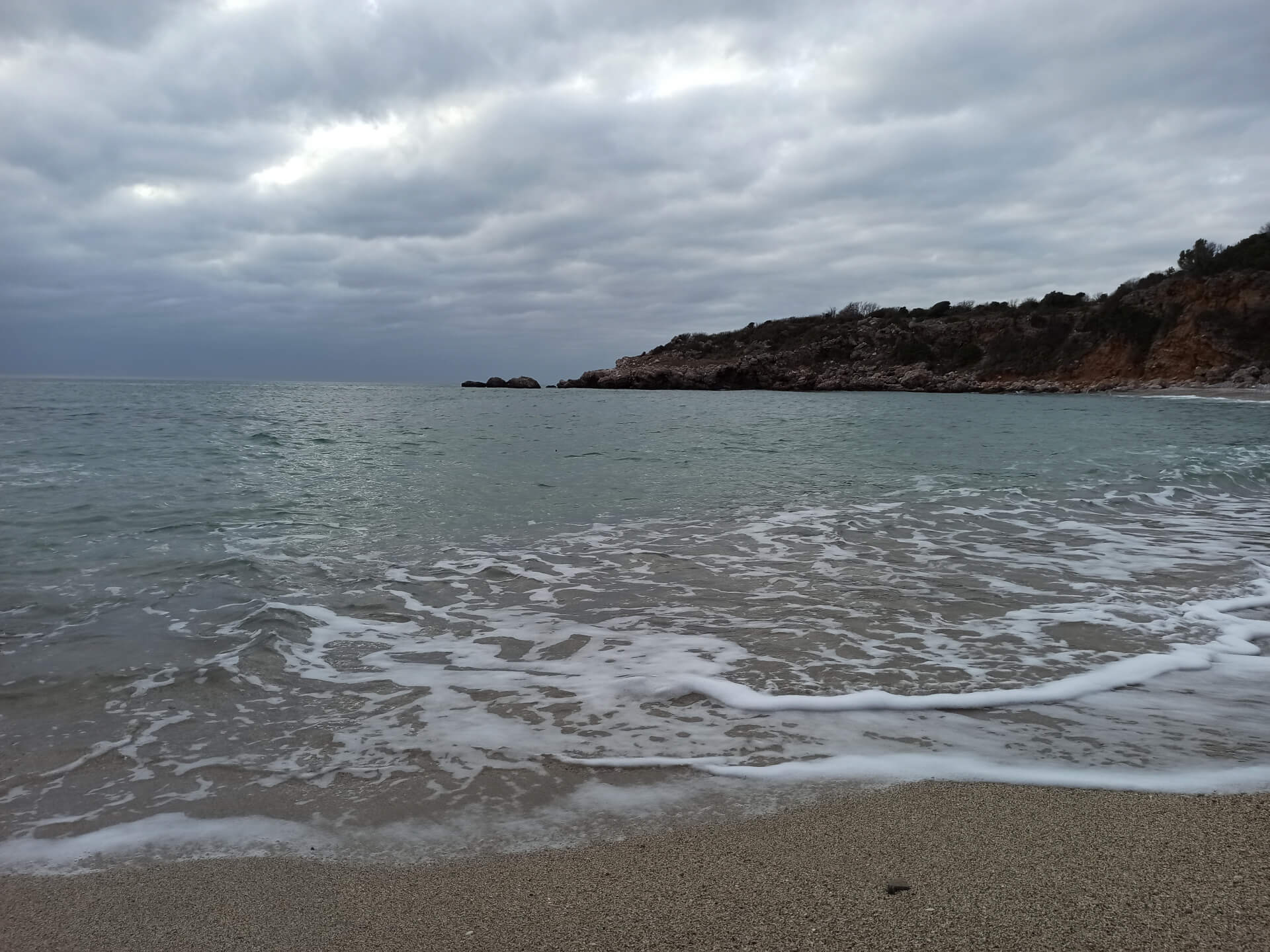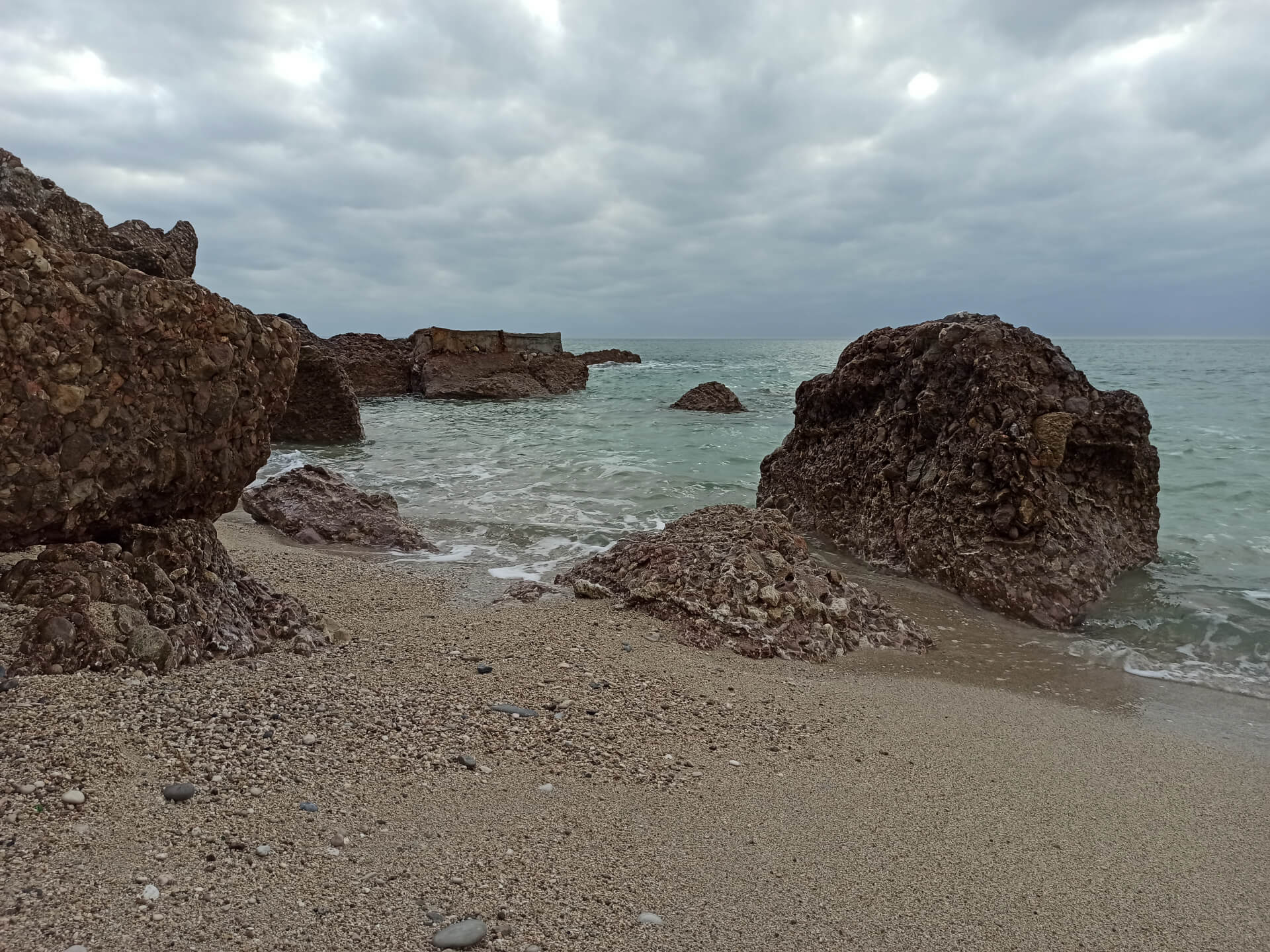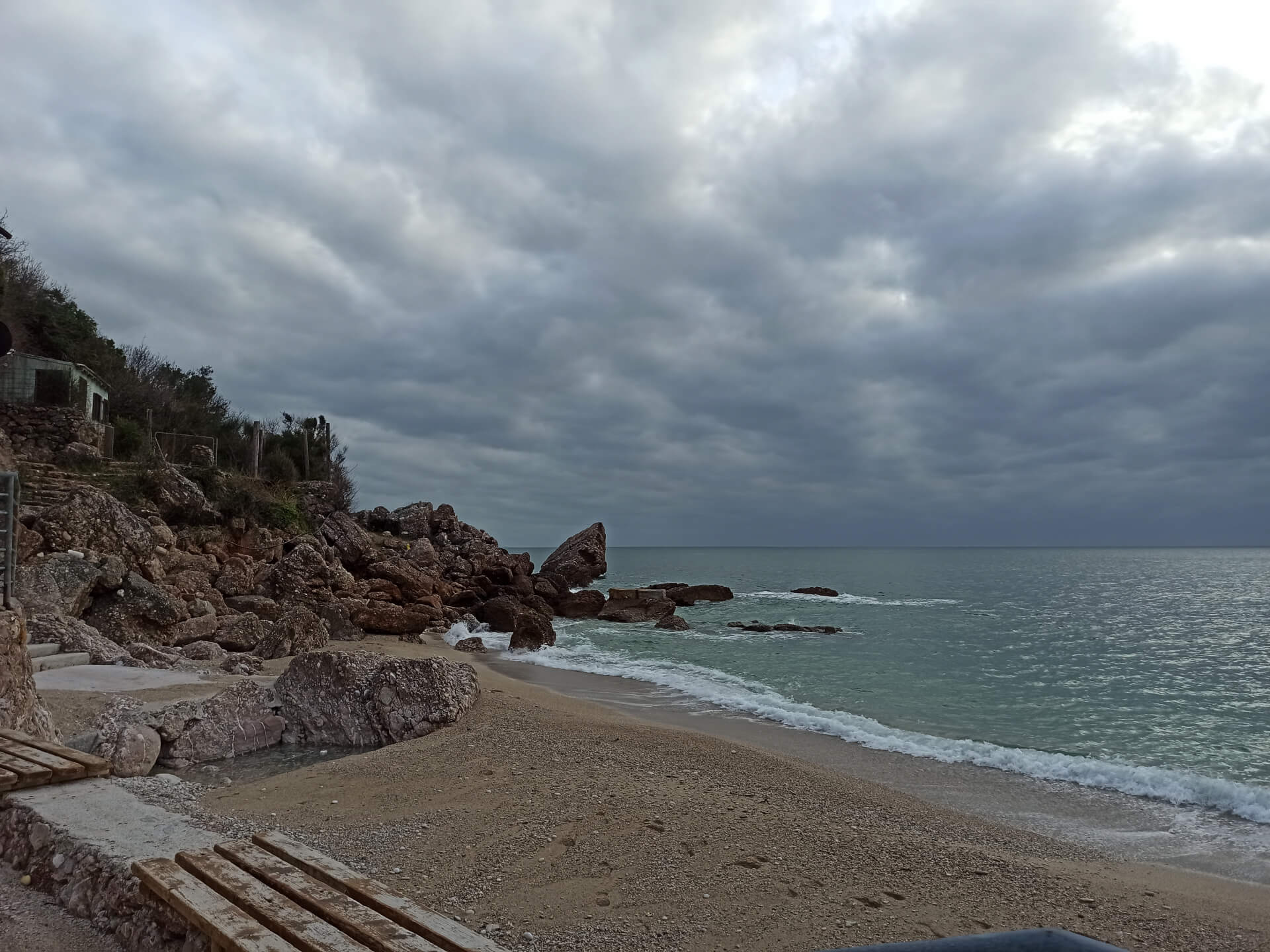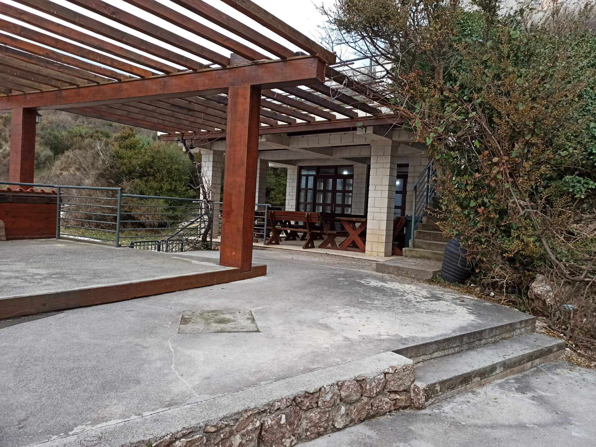 There is a restaurant and cafe that work in a high season. The beach has cascading entrance and own parking. You can see the beach from the hill and enjoy the view to the surrounding olive grove. At the season you can rent umbrellas and sunbeds as well as take your own sunbed with you.