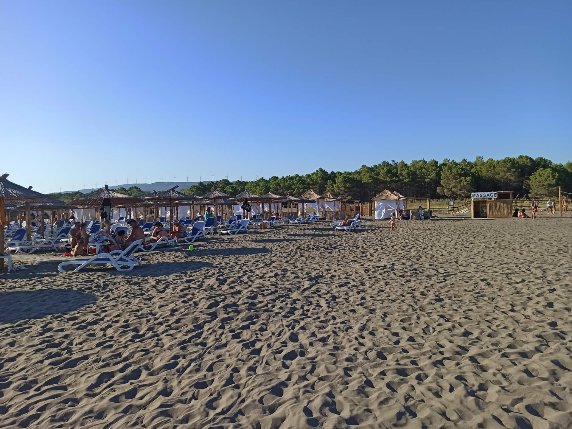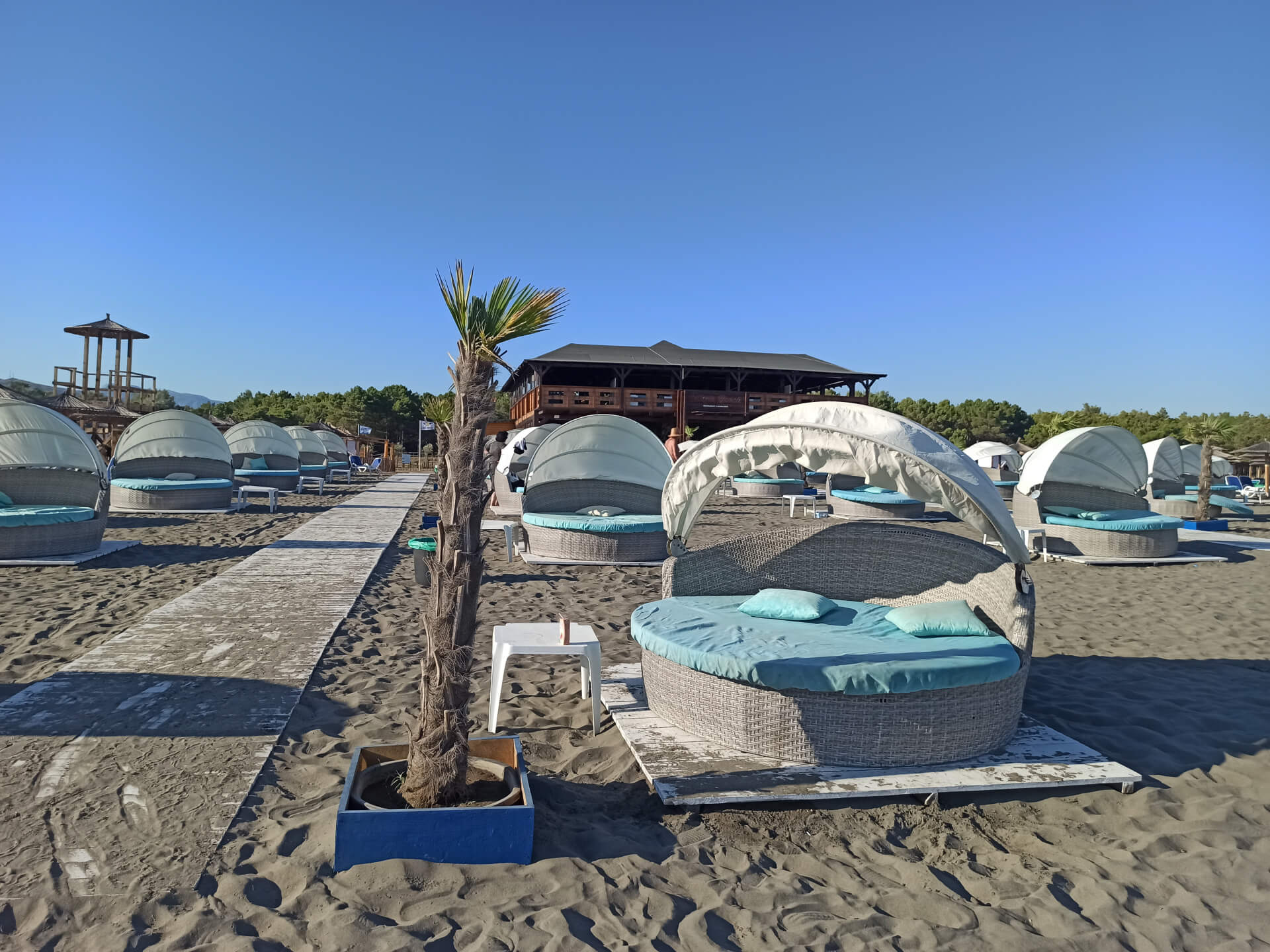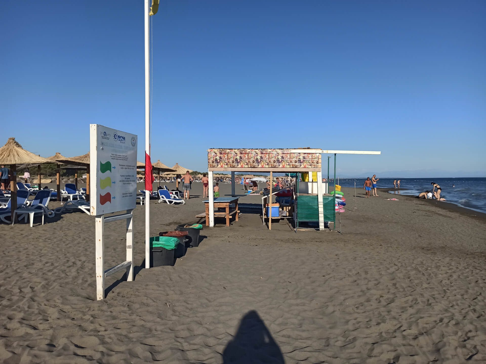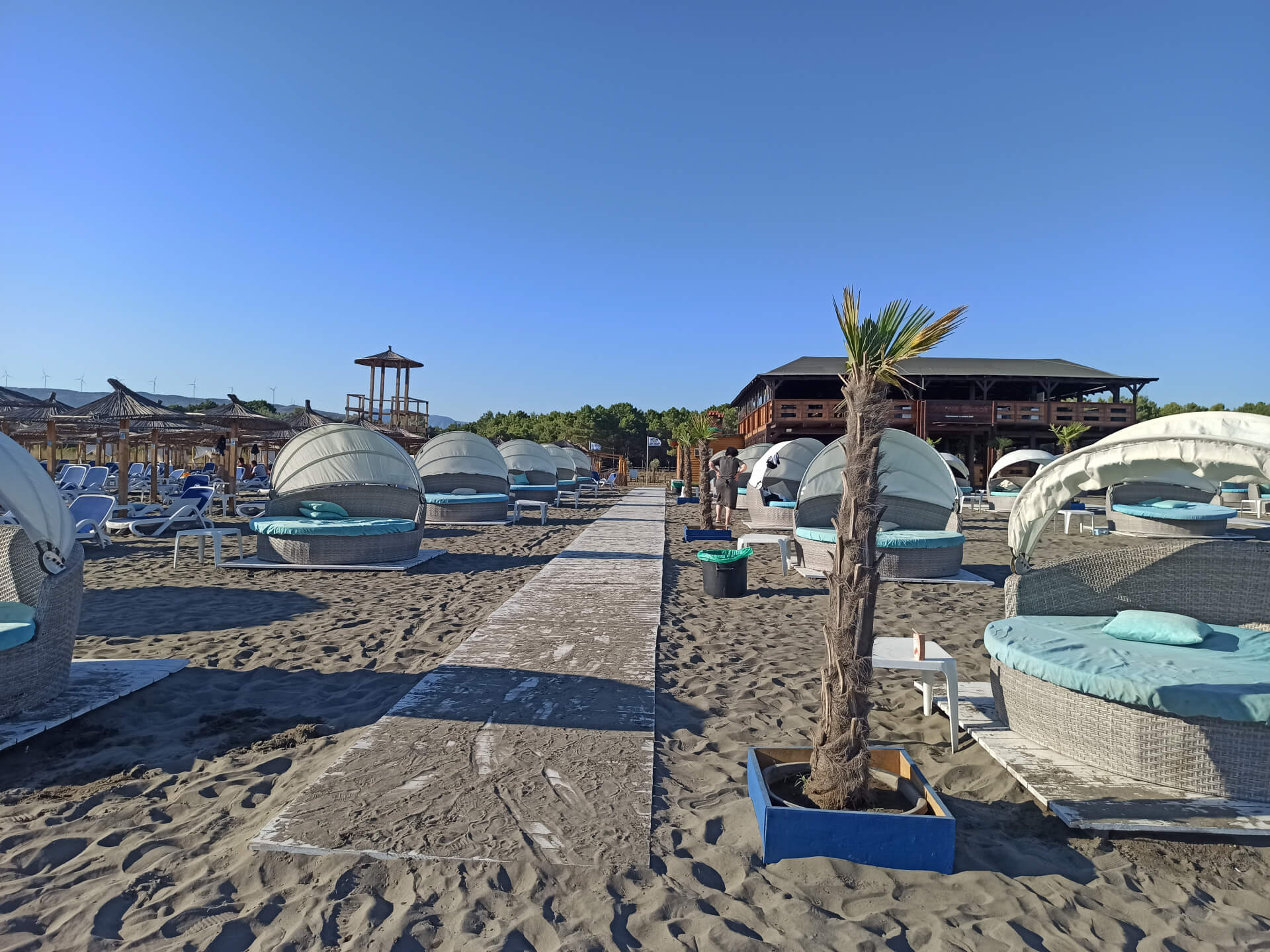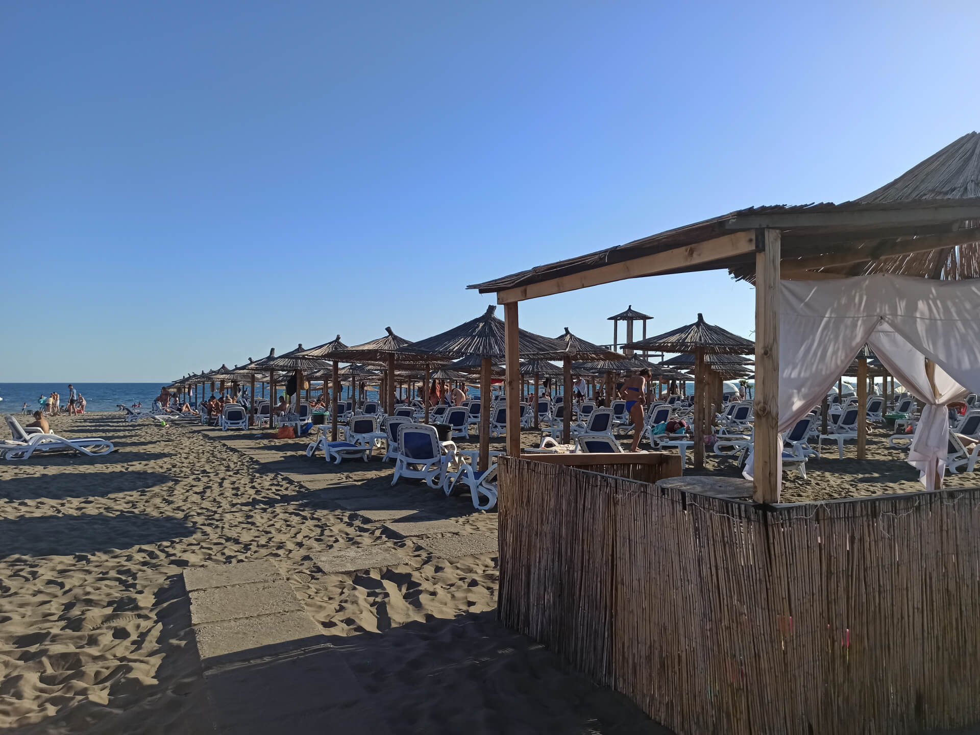 Blue Flag. This award is a sign of a great clean beach with great services. The beach has beautiful sunbeds, loungers with umbrellas and VIP beds that you can rent. There is all the needed for a great rest - showers, toilets, changing rooms. There is a lot of space for beach volley and other games on the sand, there is great playground for kids. The beach is decorated with beautiful flowers along the trails to the beach from the parking that they offer for free. Beach bar a lot of tasty dishes and drinks that you can order while chilling at the beach.