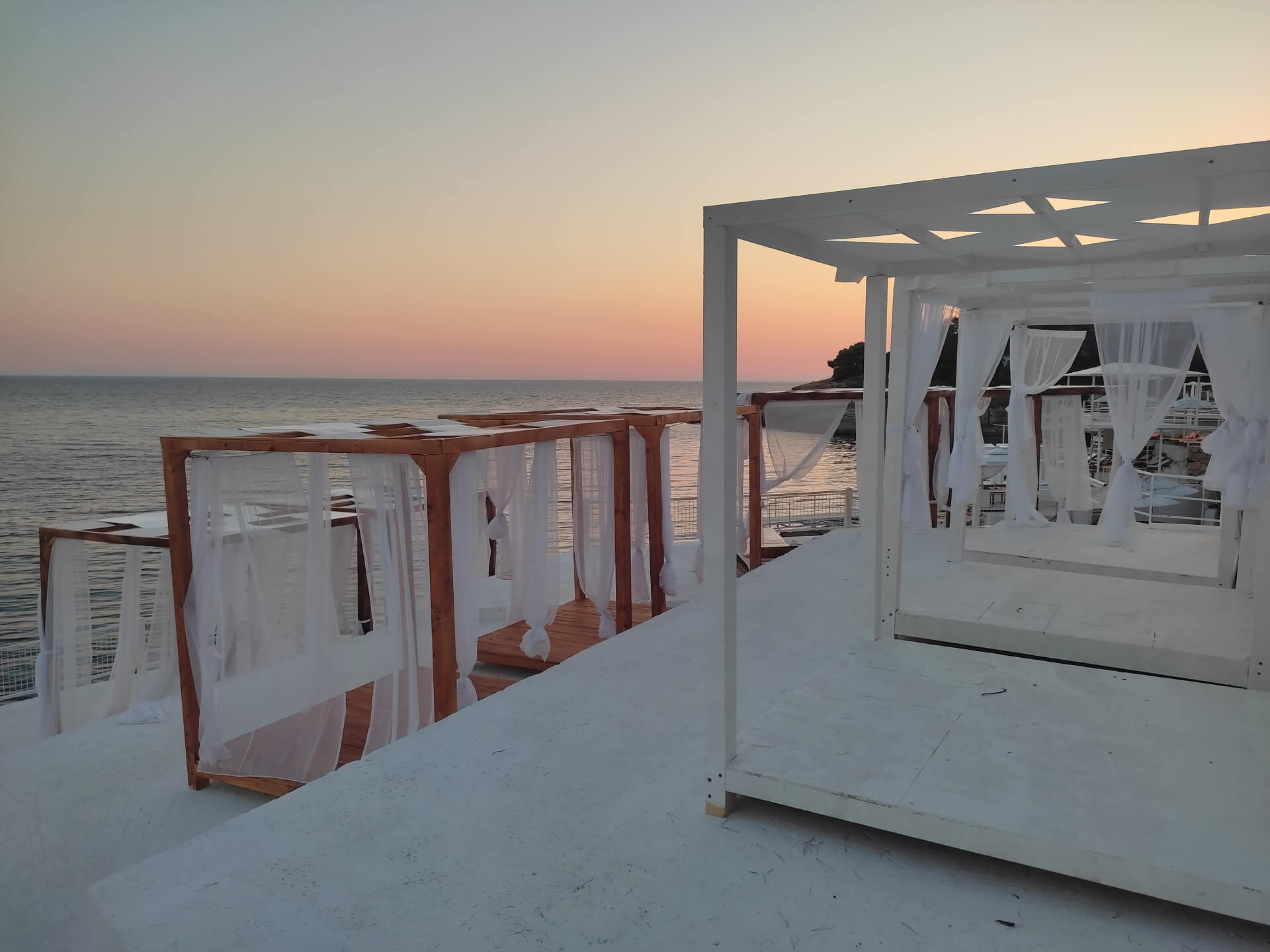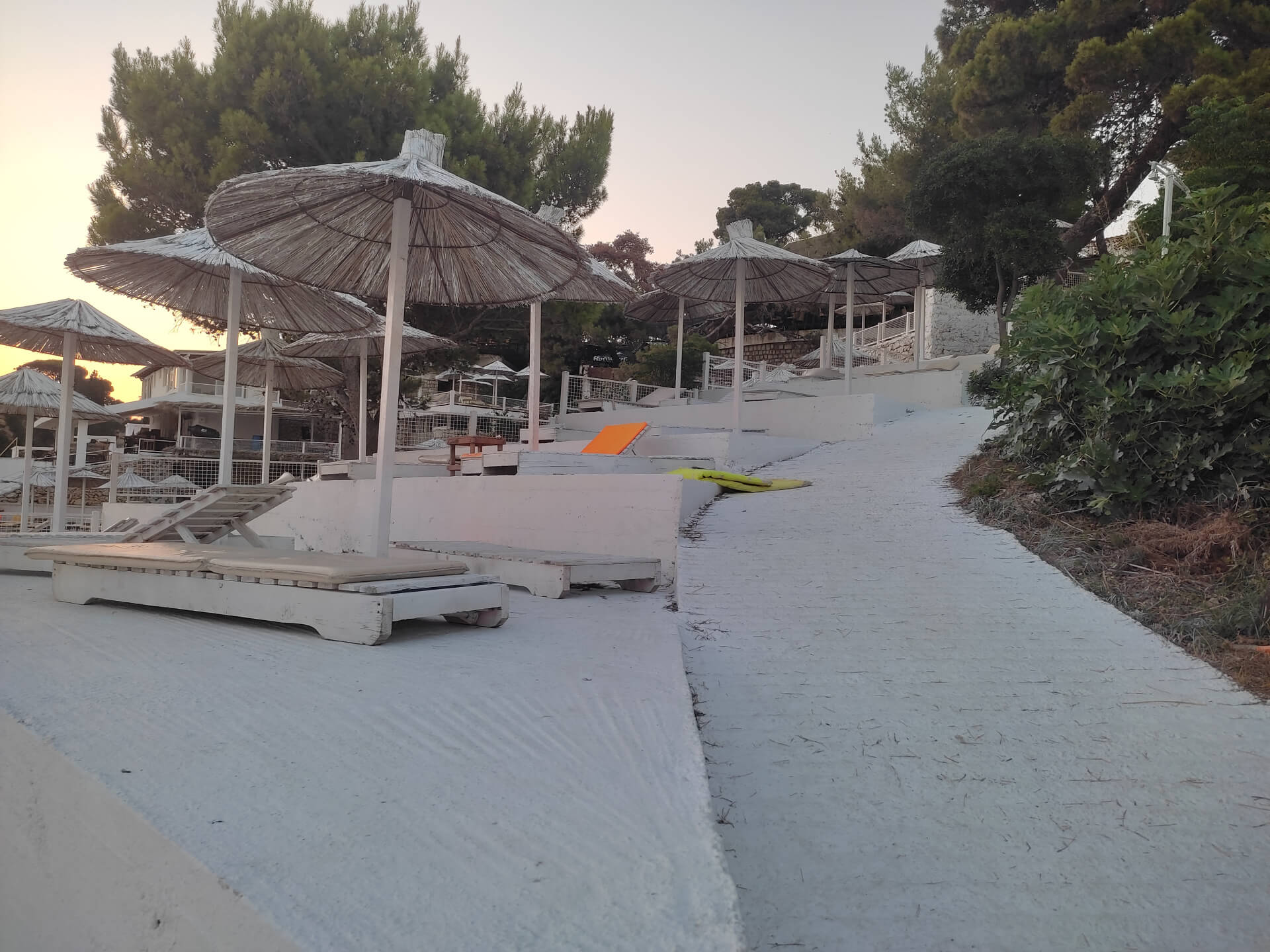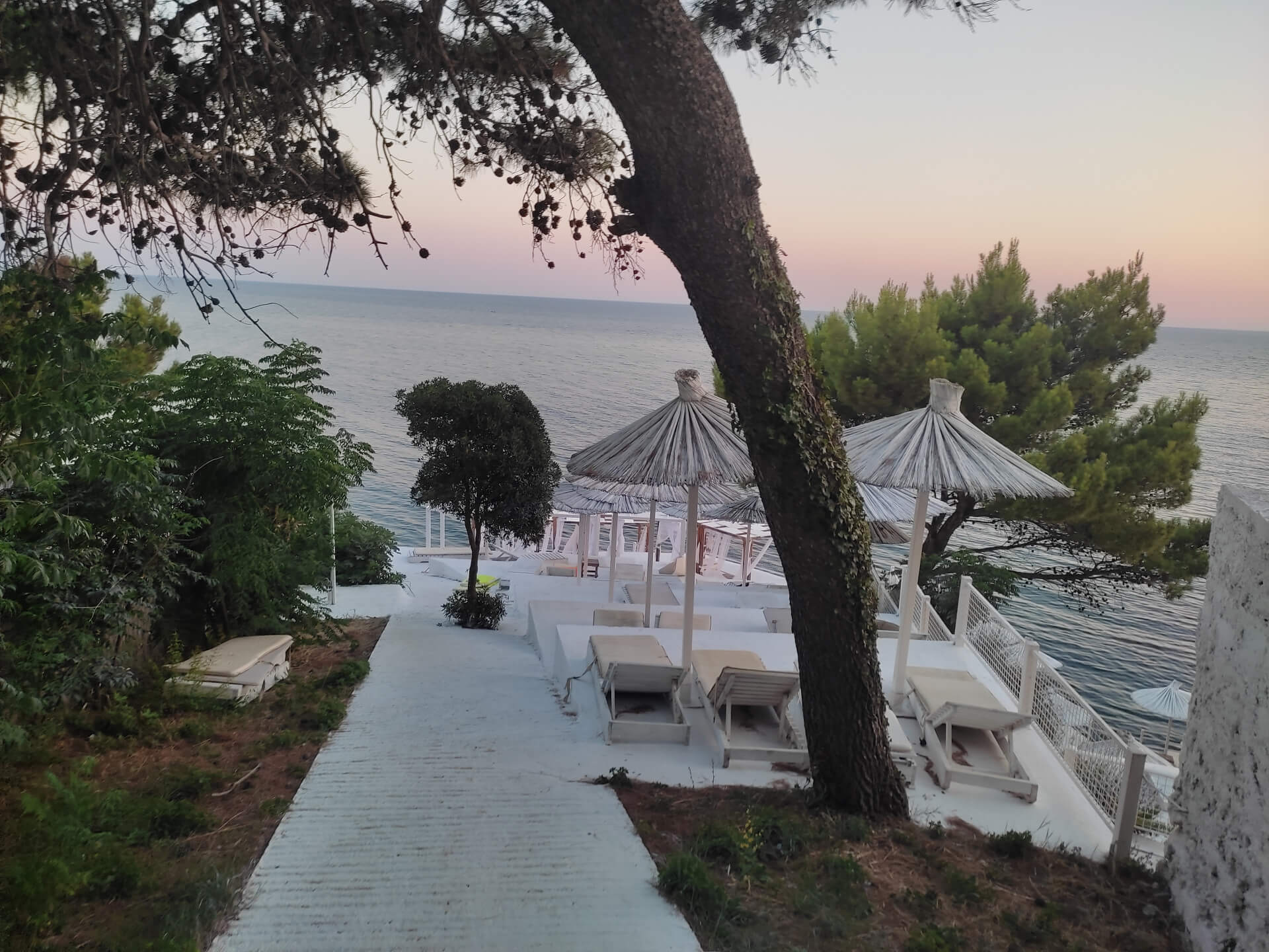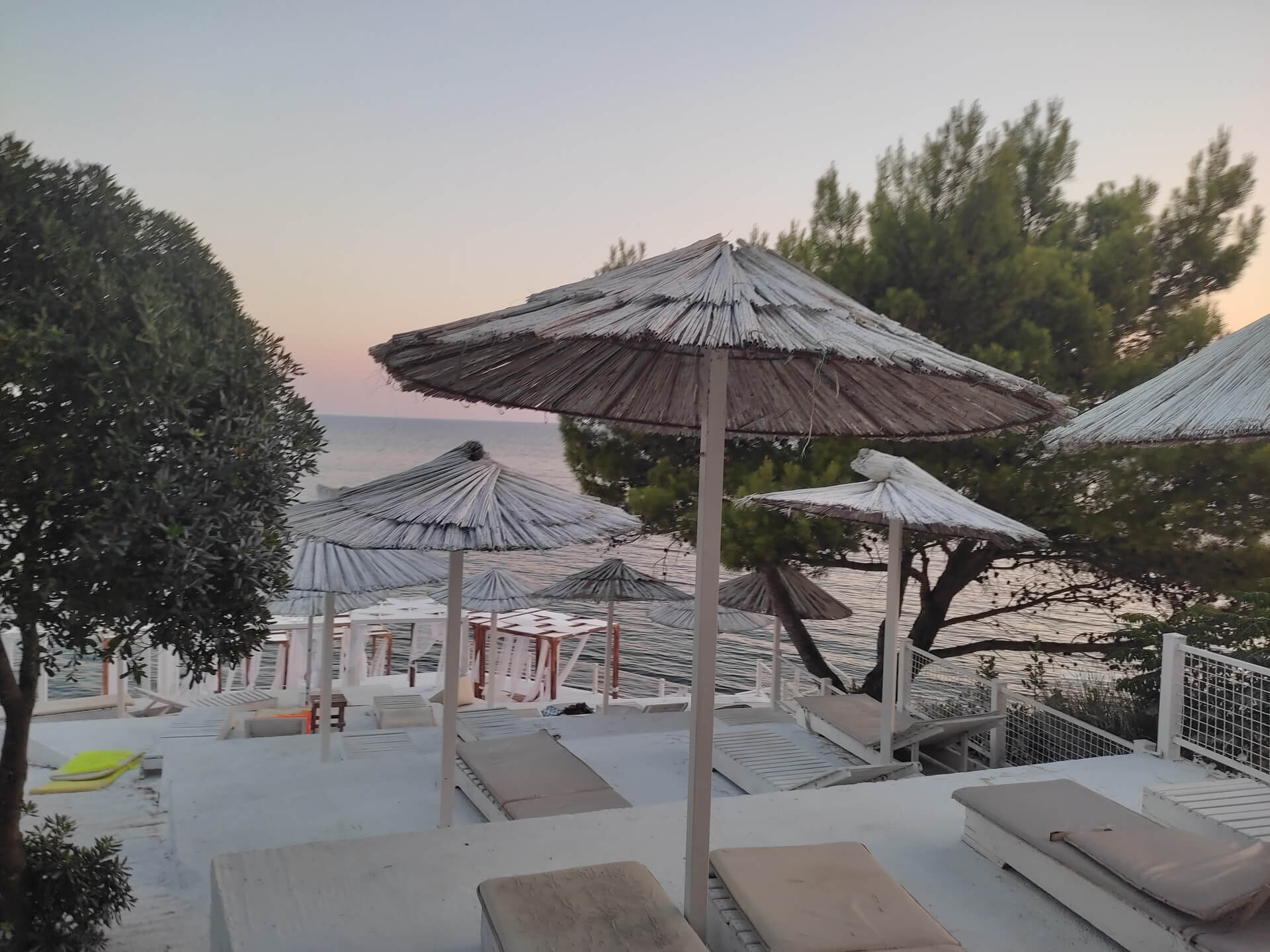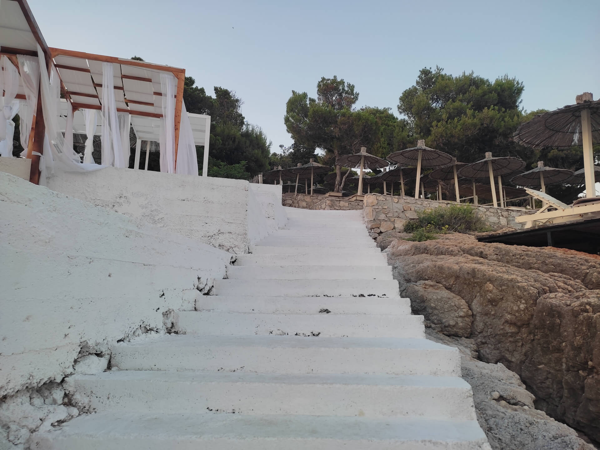 Ulcinj coast. The beach has a wonderful area on different levels. Great bar and restaurant cover its services providing with beach furniture - cozy loungers and romantic sunbeds by the sea. The entrance to the sea is rocky from the stairs. But the sea is clean and transparent, the coastline is beautiful.