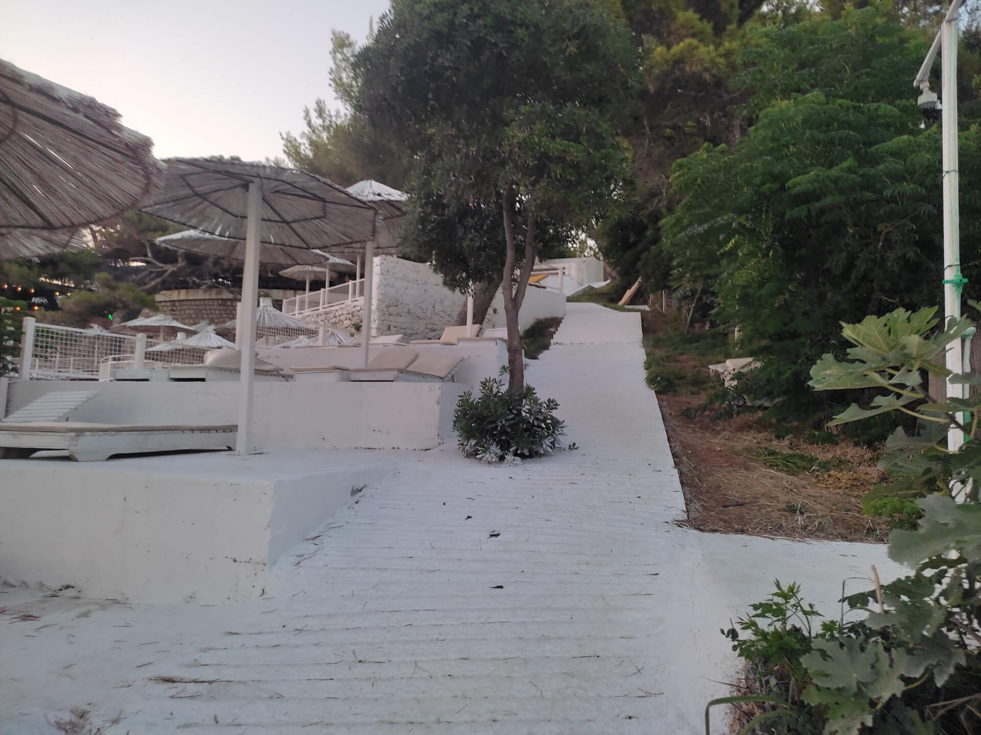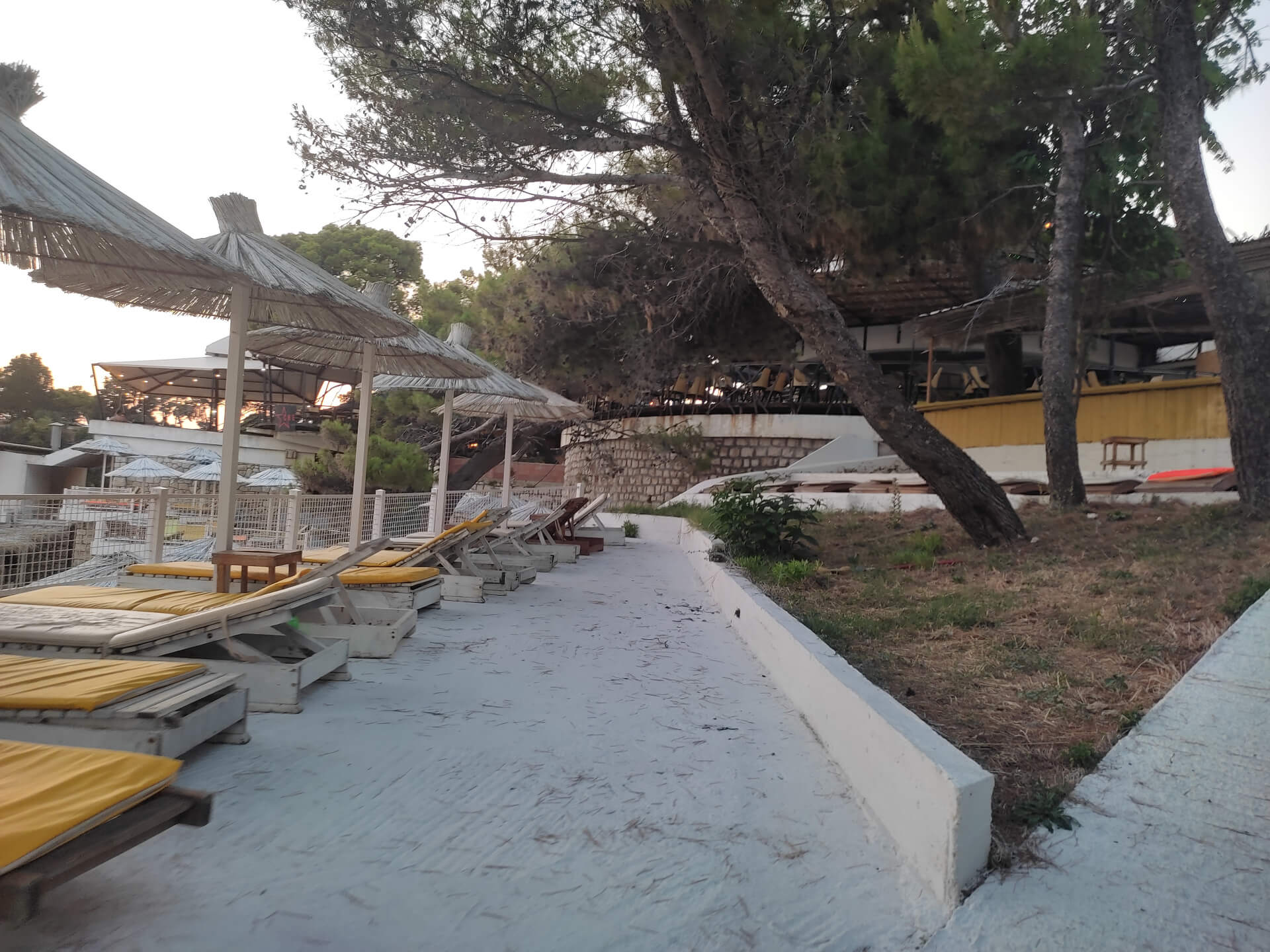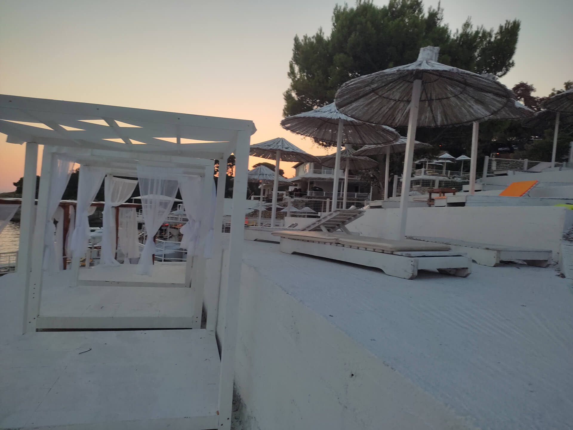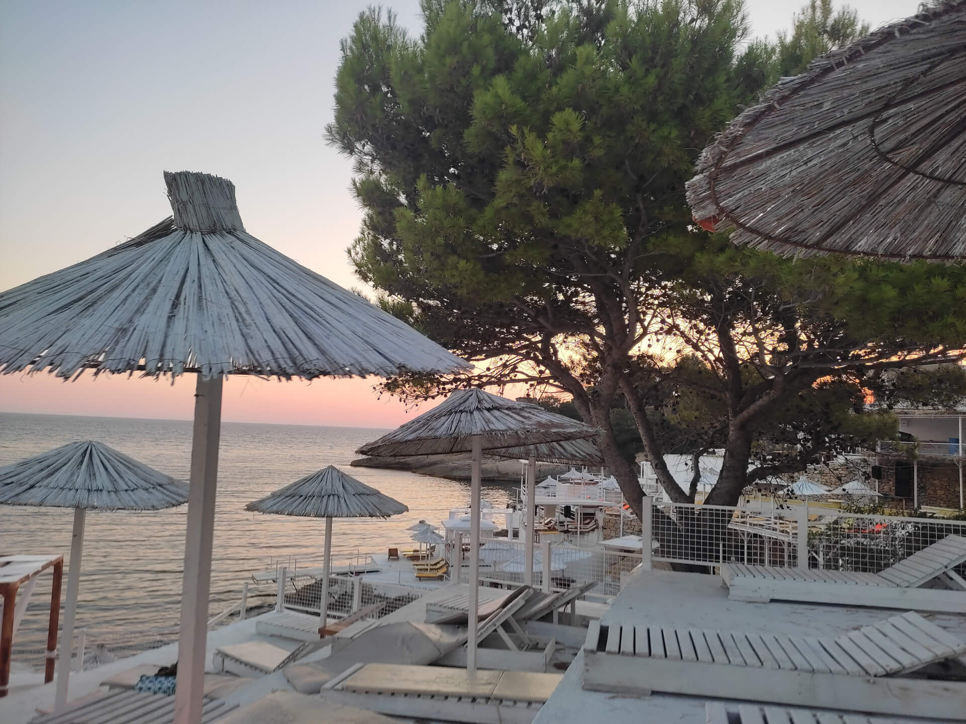 Ulcinj coast. The beach has a wonderful area on different levels. Great bar and restaurant cover its services providing with beach furniture - cozy loungers and romantic sunbeds by the sea. The entrance to the sea is rocky from the stairs. But the sea is clean and transparent, the coastline is beautiful.