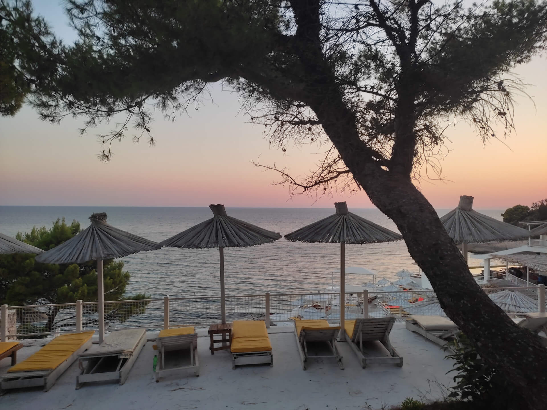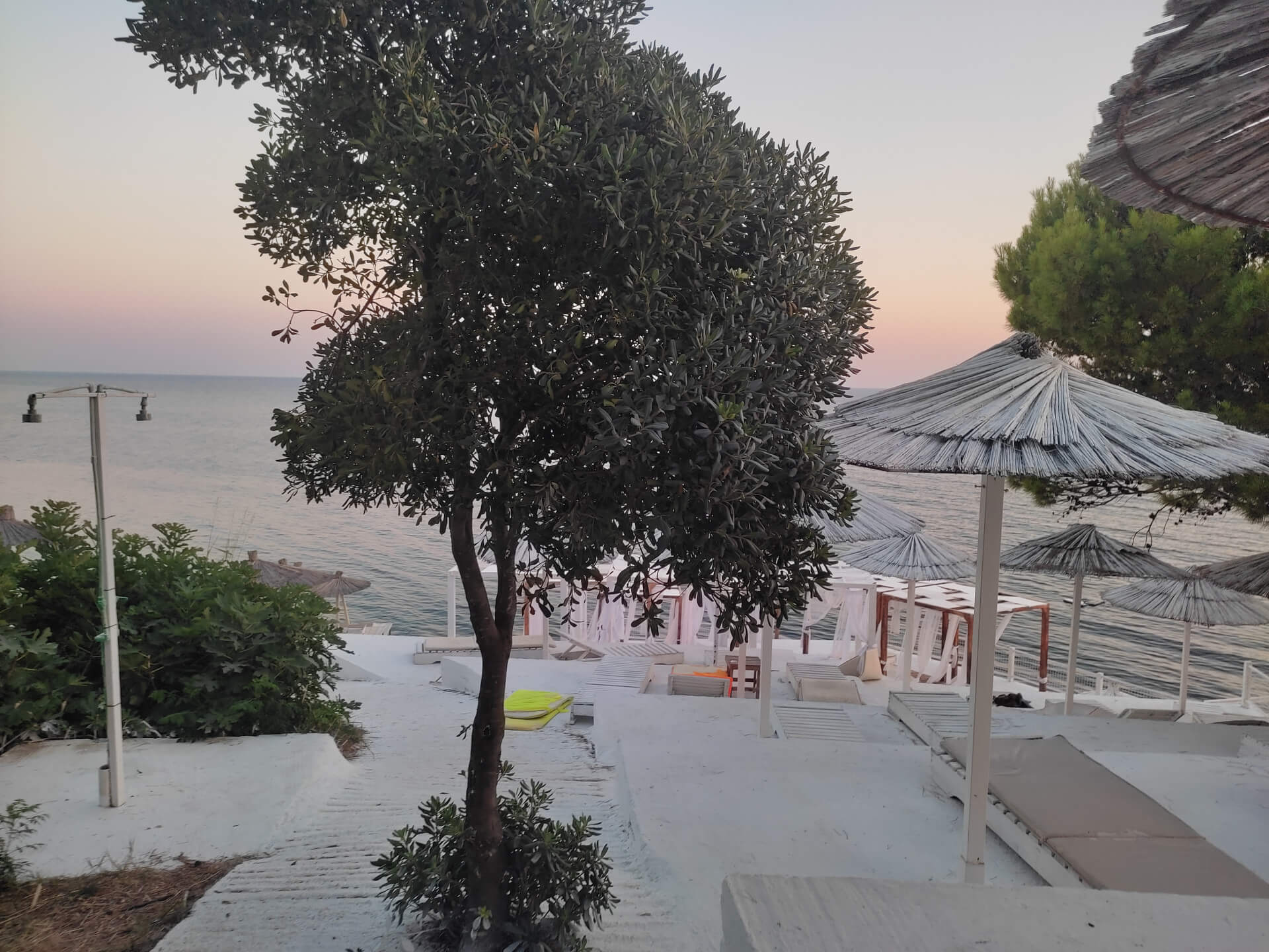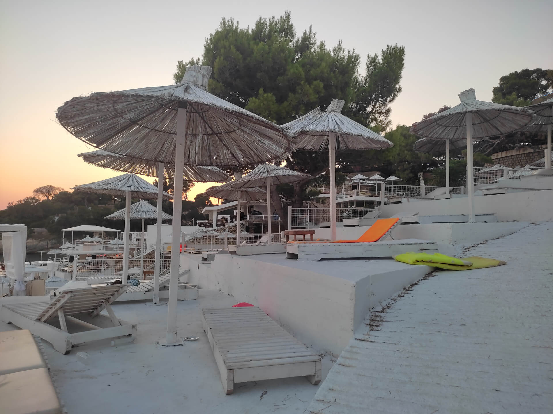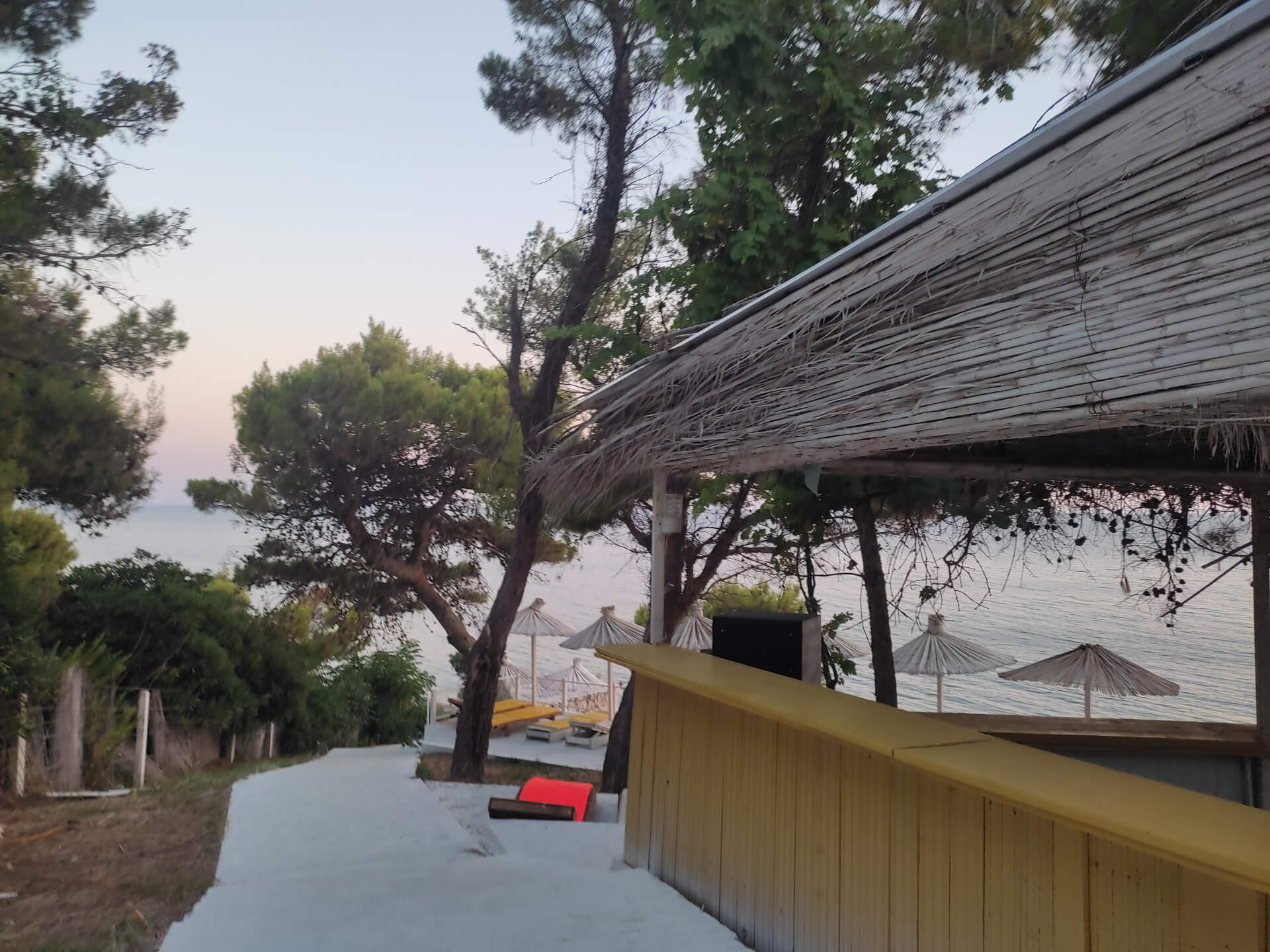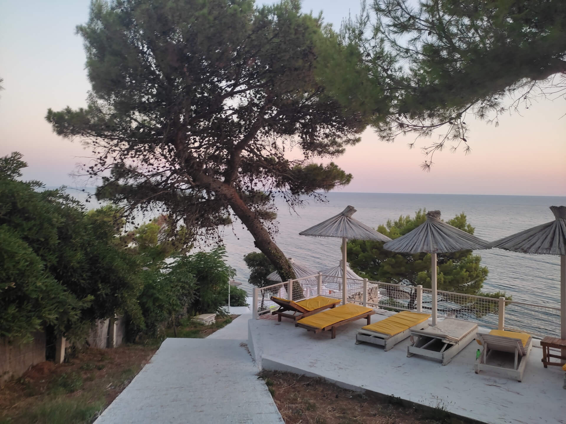 Ulcinj coast. The beach has a wonderful area on different levels. Great bar and restaurant cover its services providing with beach furniture - cozy loungers and romantic sunbeds by the sea. The entrance to the sea is rocky from the stairs. But the sea is clean and transparent, the coastline is beautiful.