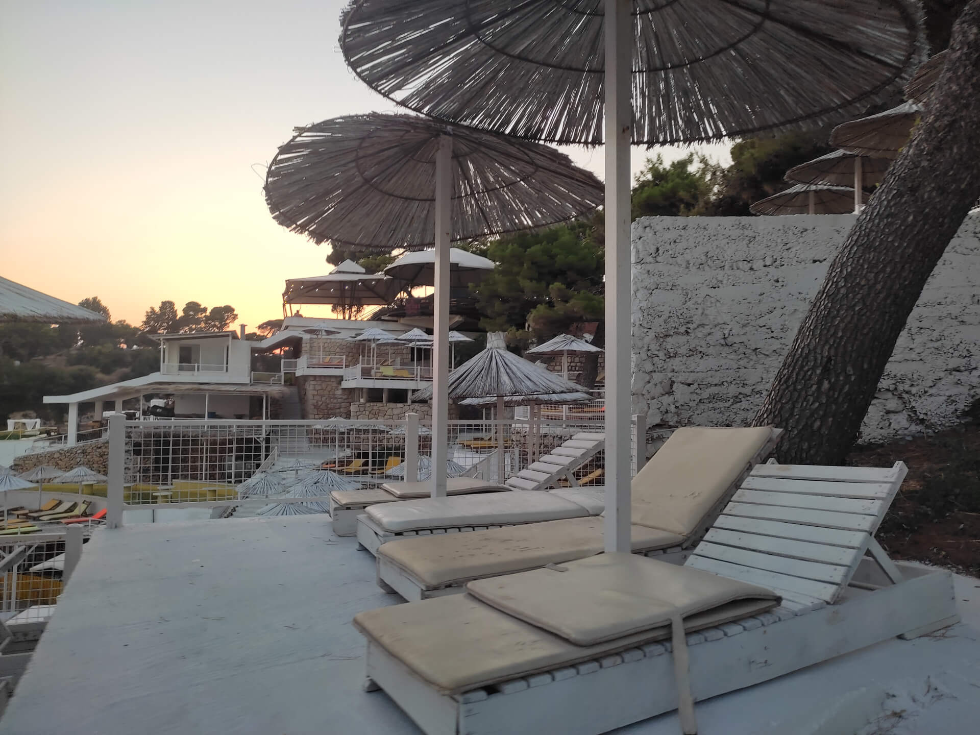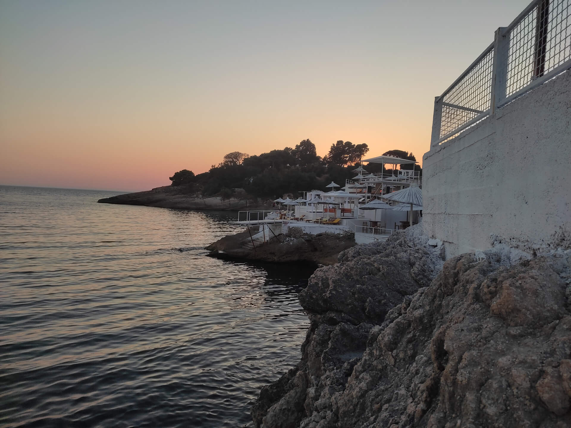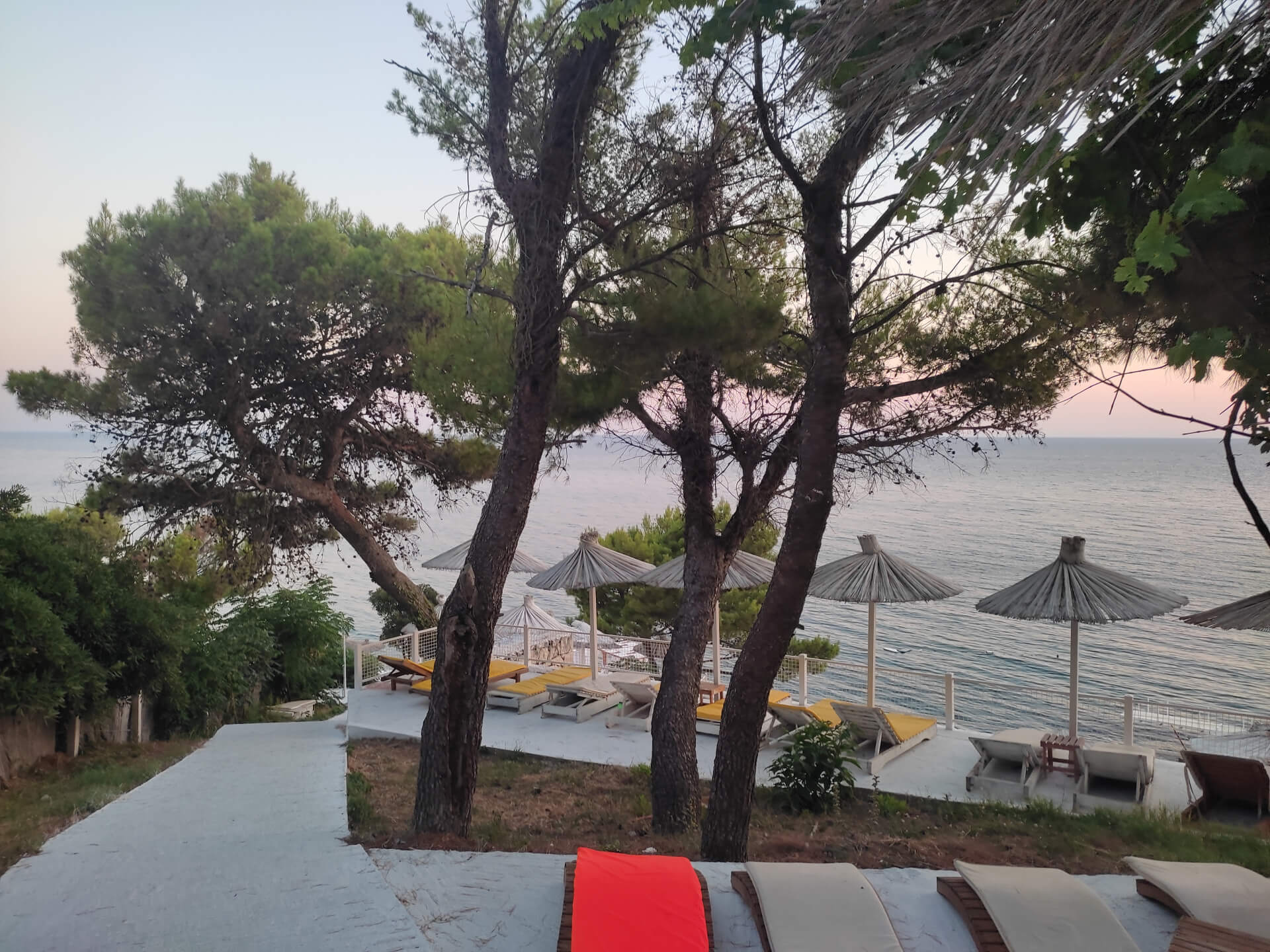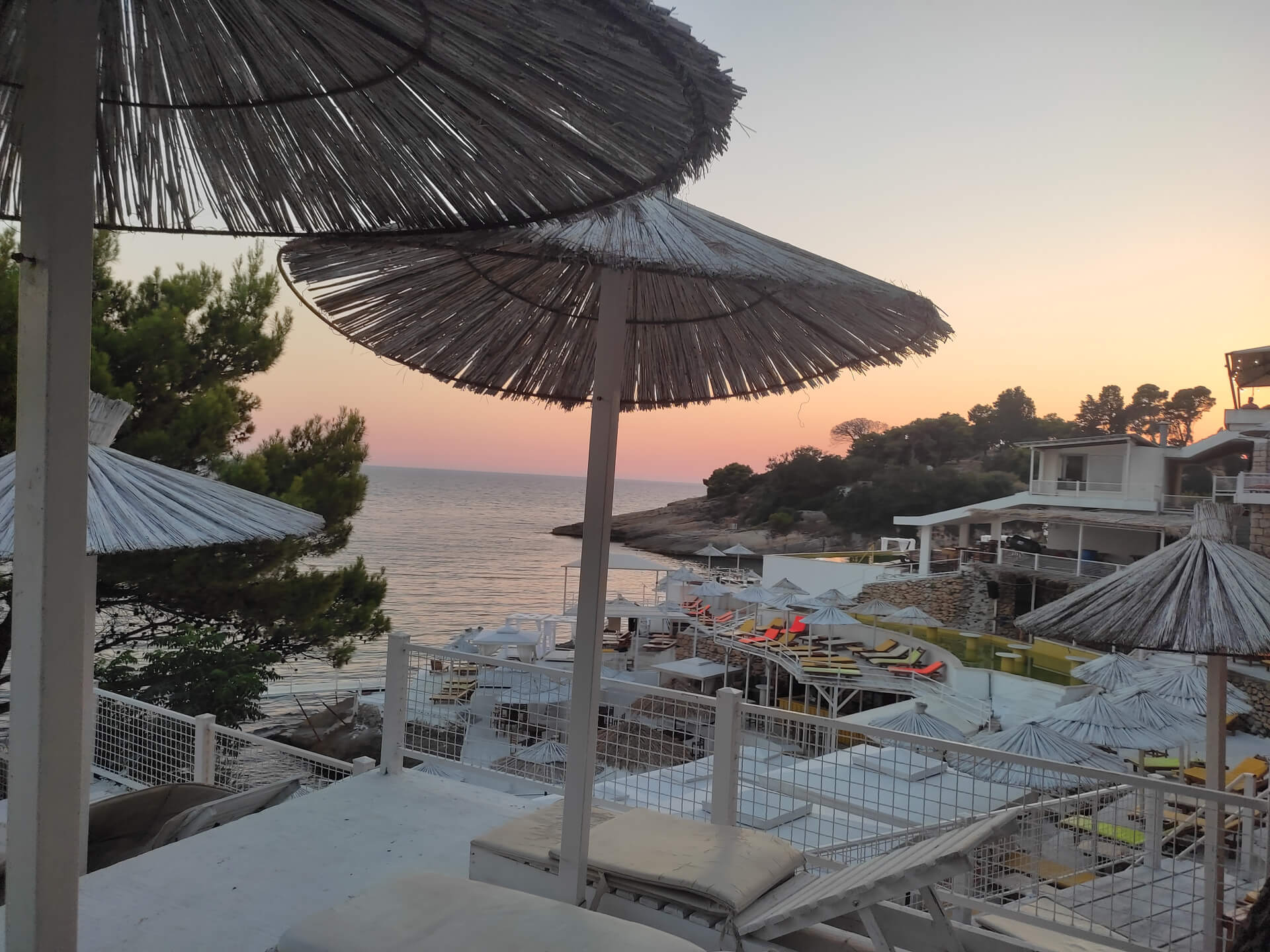 Ulcinj coast. The beach has a wonderful area on different levels. Great bar and restaurant cover its services providing with beach furniture - cozy loungers and romantic sunbeds by the sea. The entrance to the sea is rocky from the stairs. But the sea is clean and transparent, the coastline is beautiful.