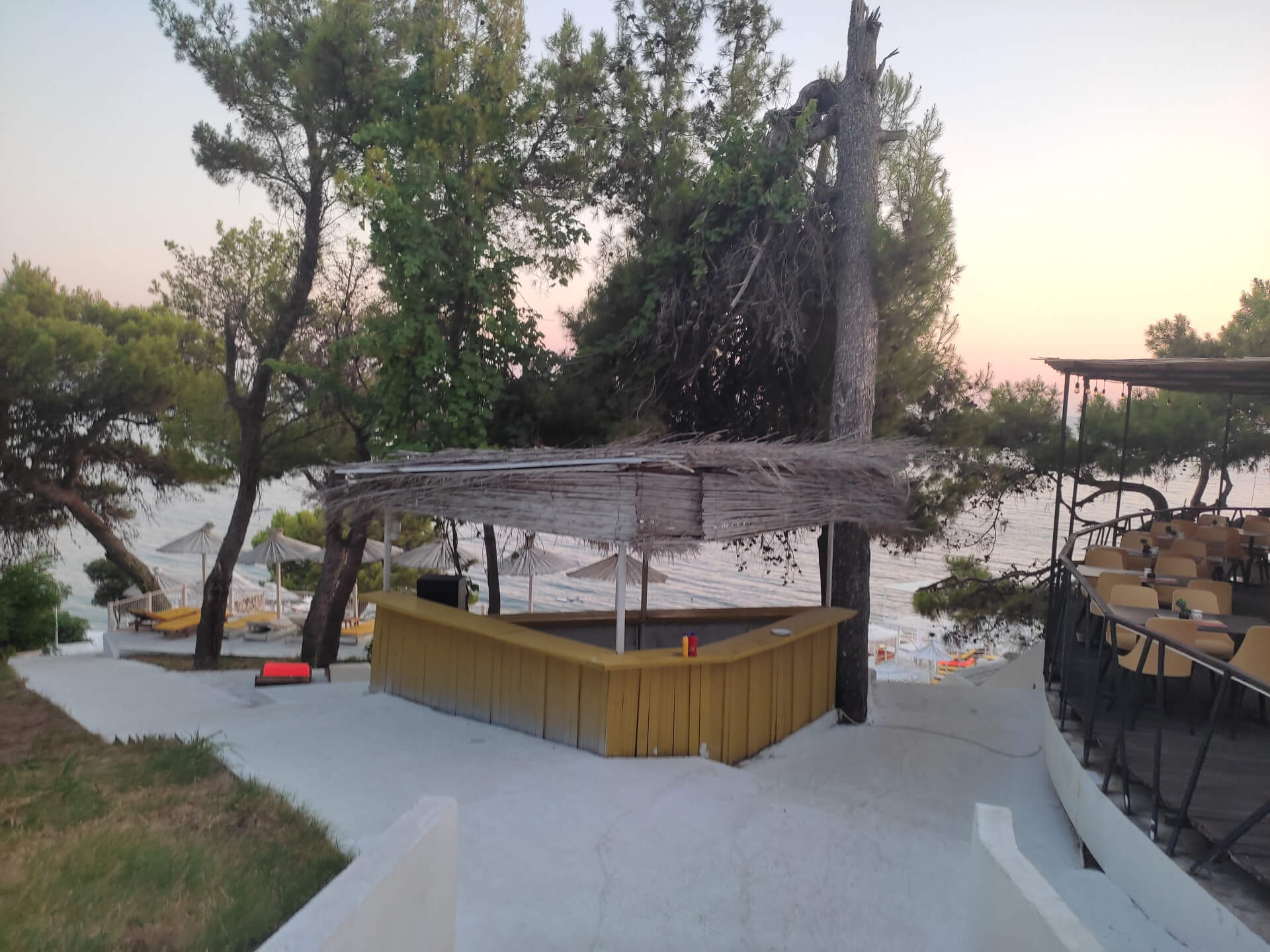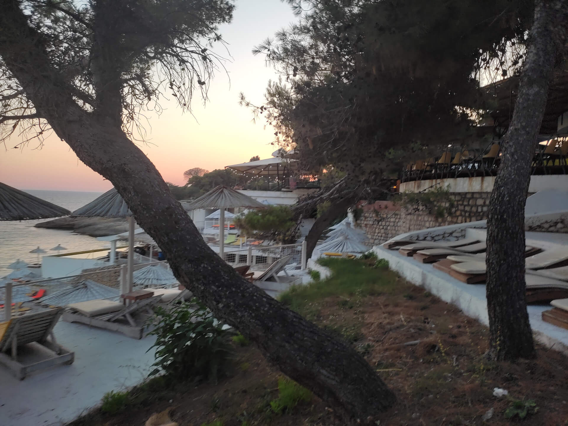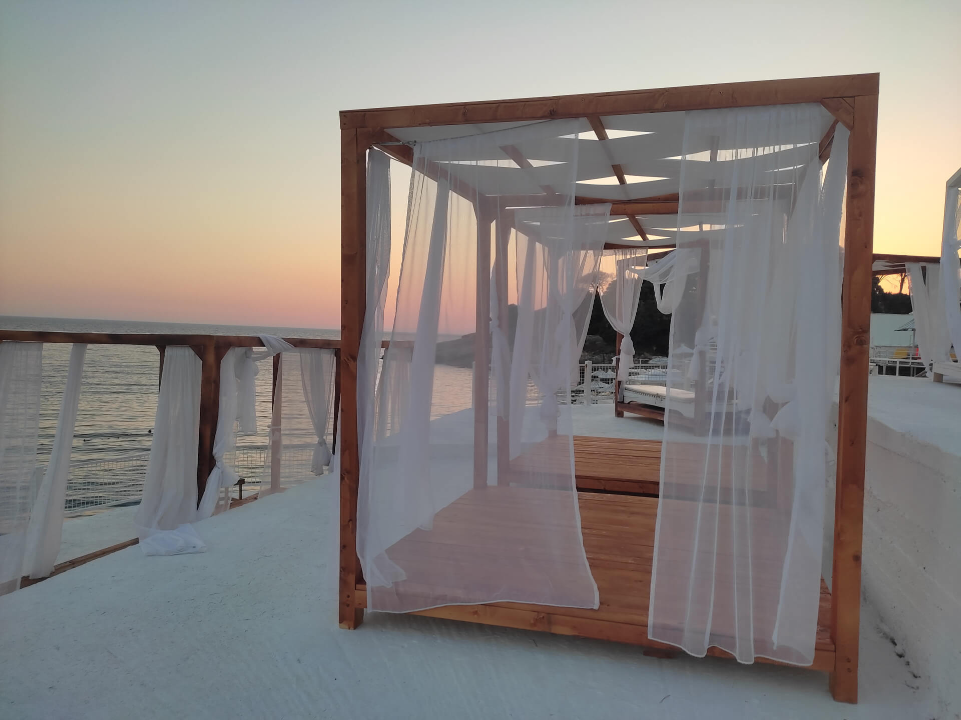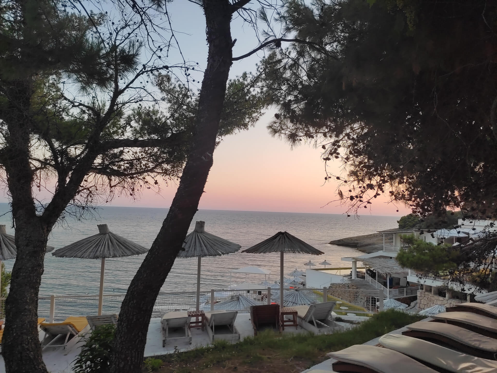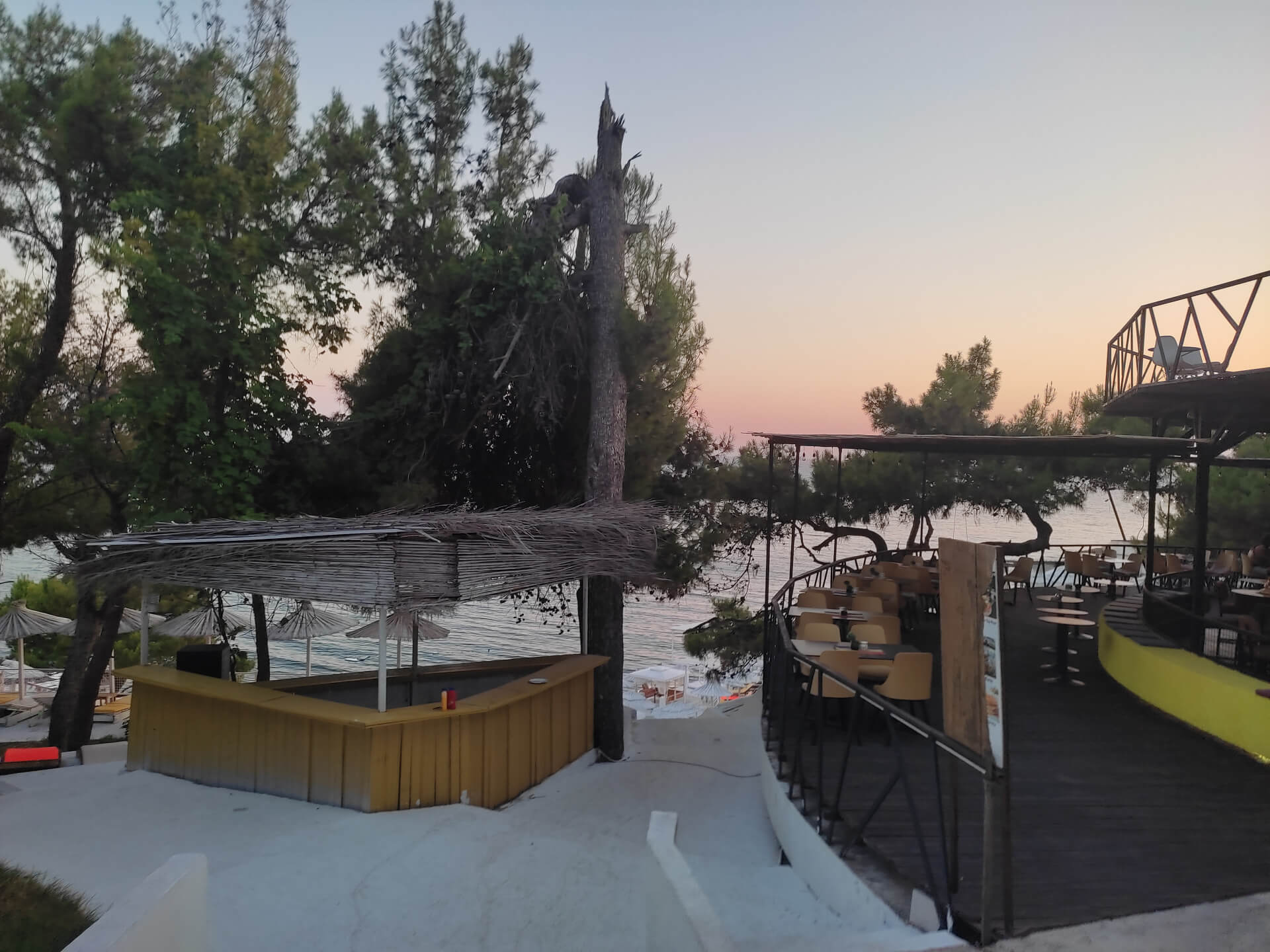 Ulcinj coast. The beach has a wonderful area on different levels. Great bar and restaurant cover its services providing with beach furniture - cozy loungers and romantic sunbeds by the sea. The entrance to the sea is rocky from the stairs. But the sea is clean and transparent, the coastline is beautiful.