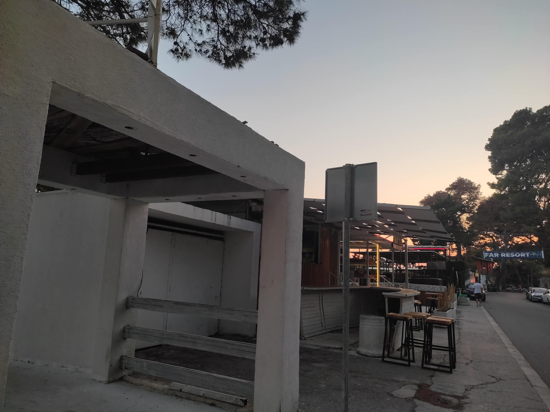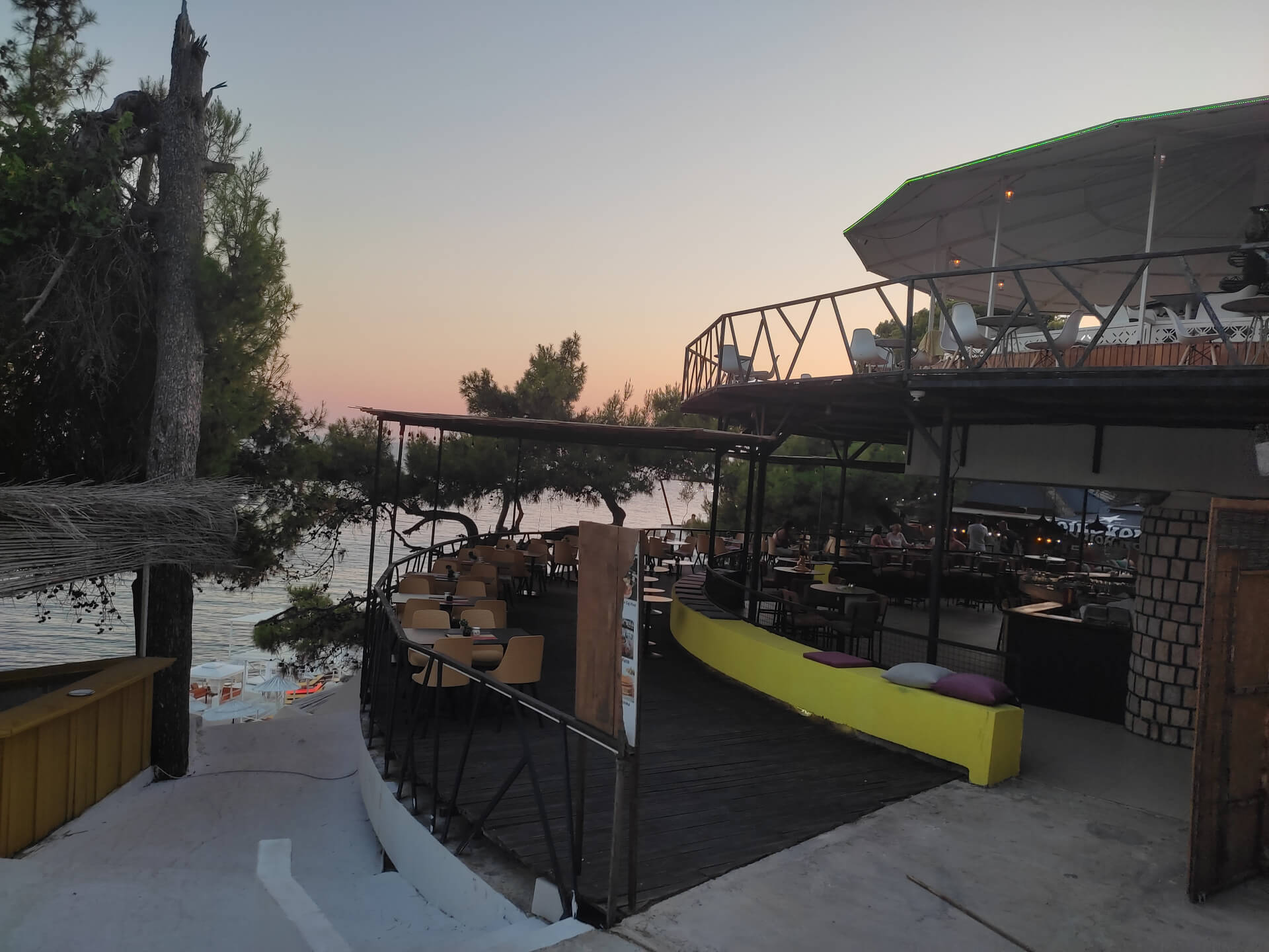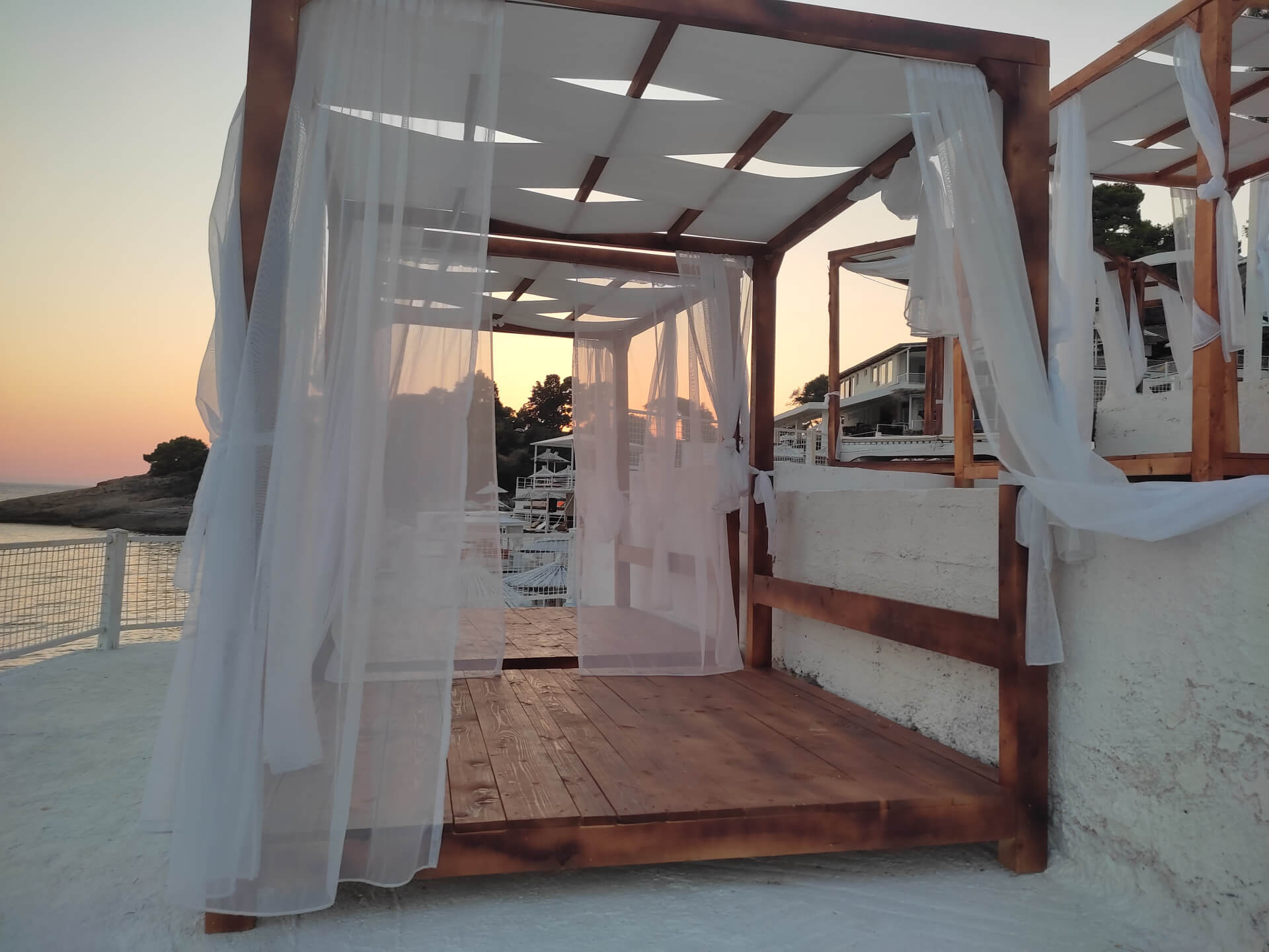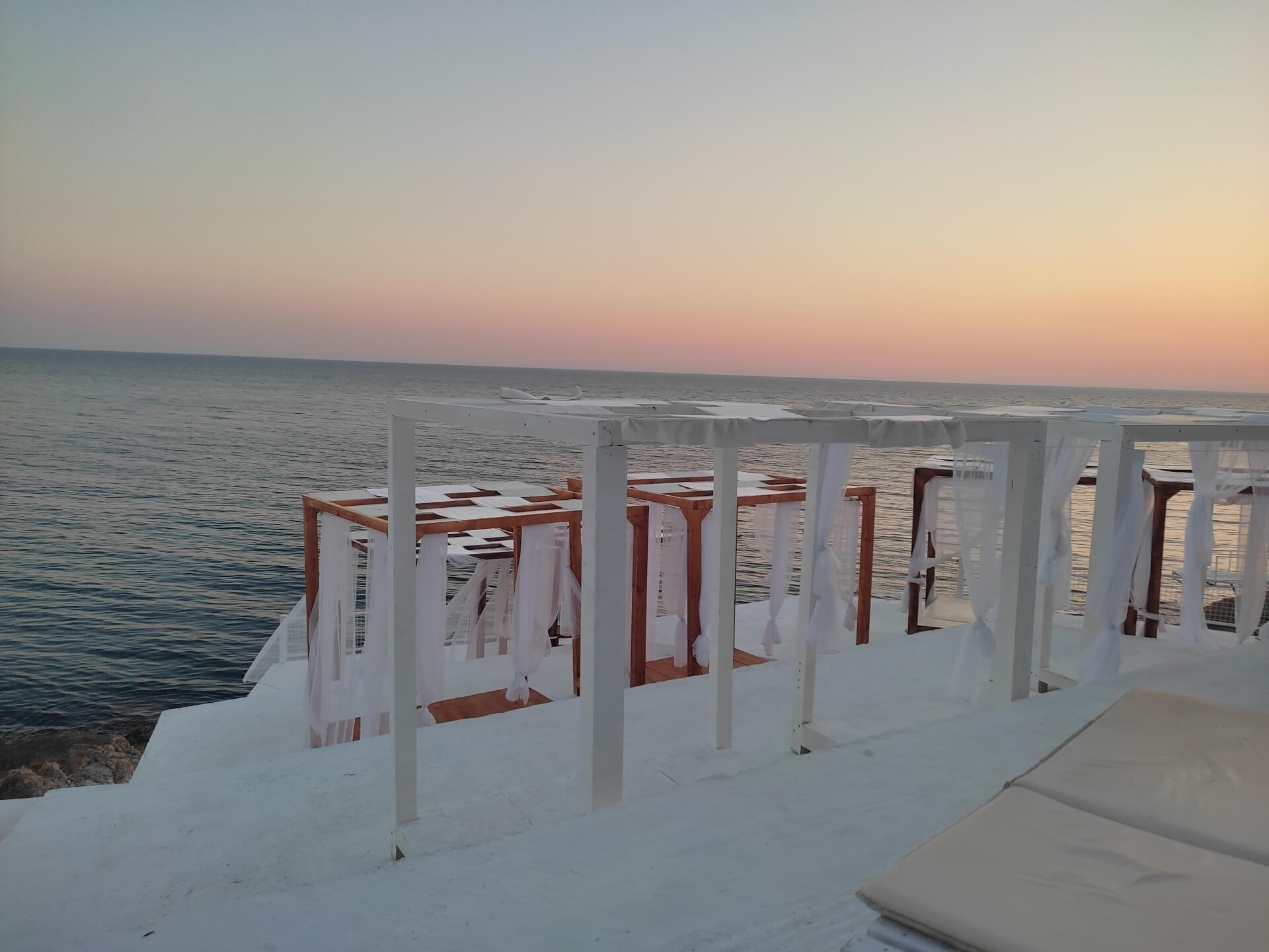 Ulcinj coast. The beach has a wonderful area on different levels. Great bar and restaurant cover its services providing with beach furniture - cozy loungers and romantic sunbeds by the sea. The entrance to the sea is rocky from the stairs. But the sea is clean and transparent, the coastline is beautiful.