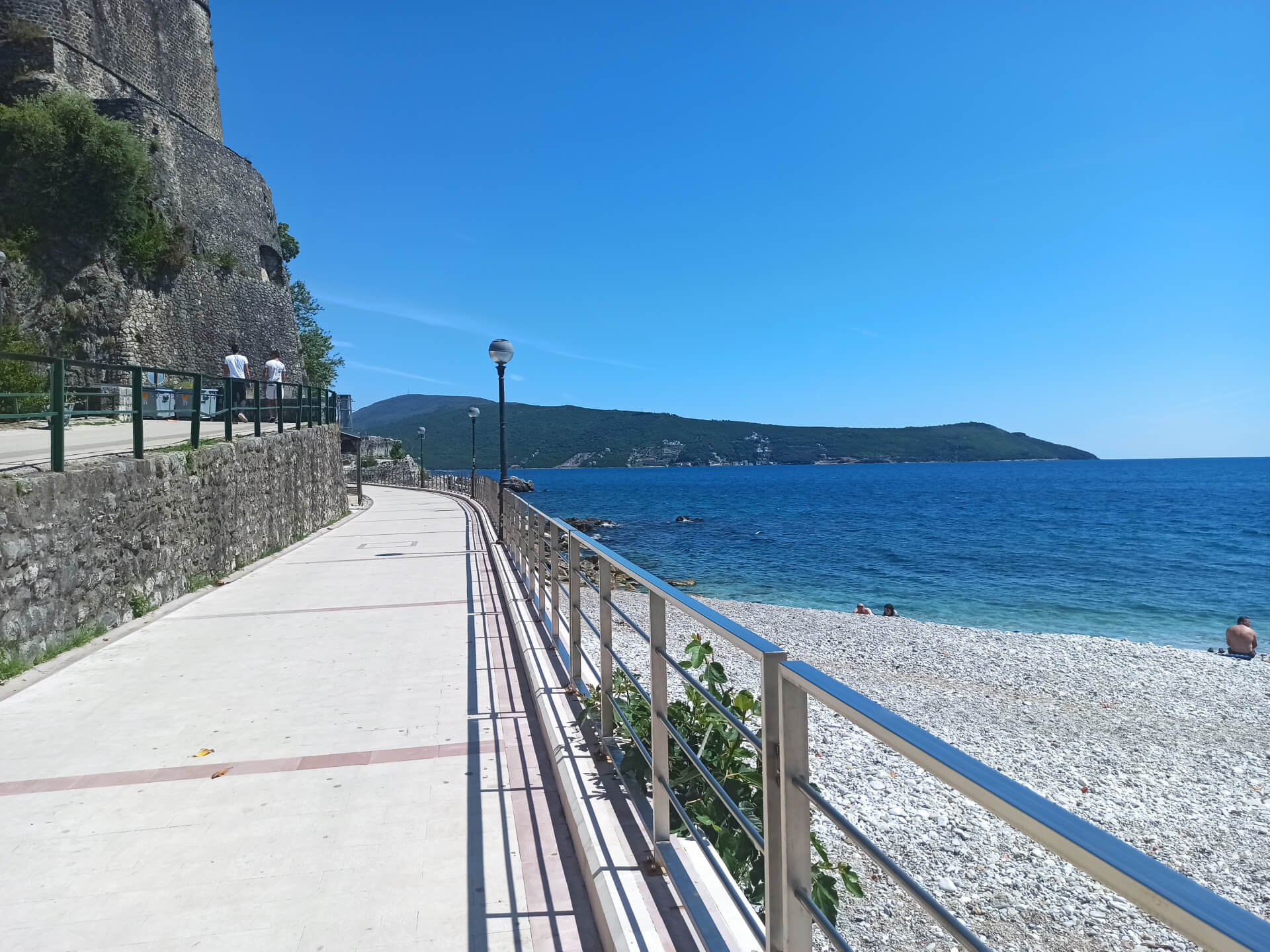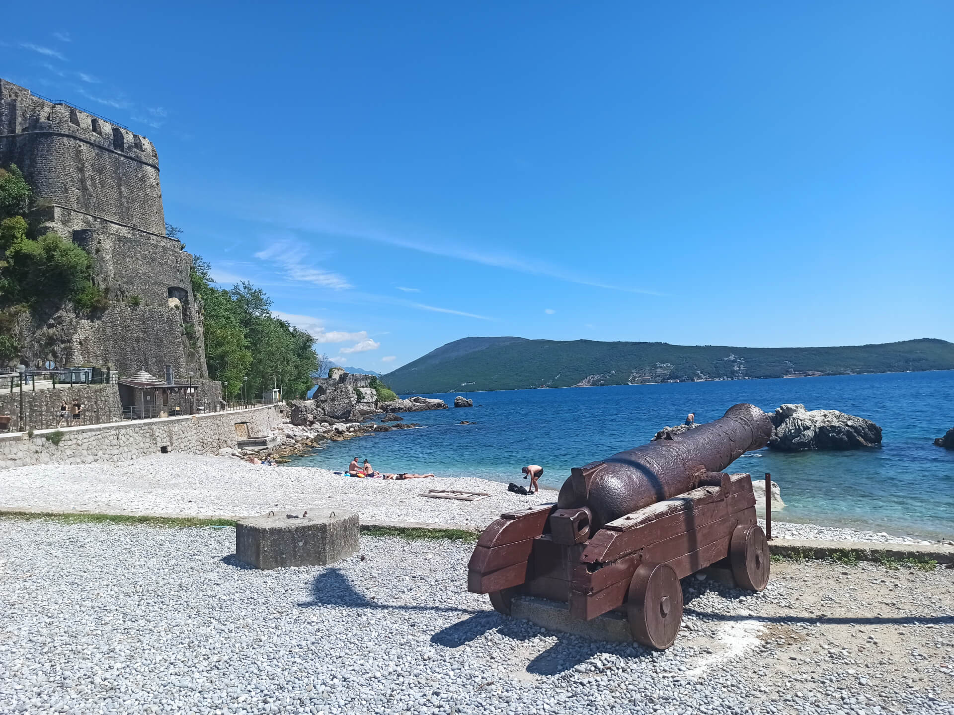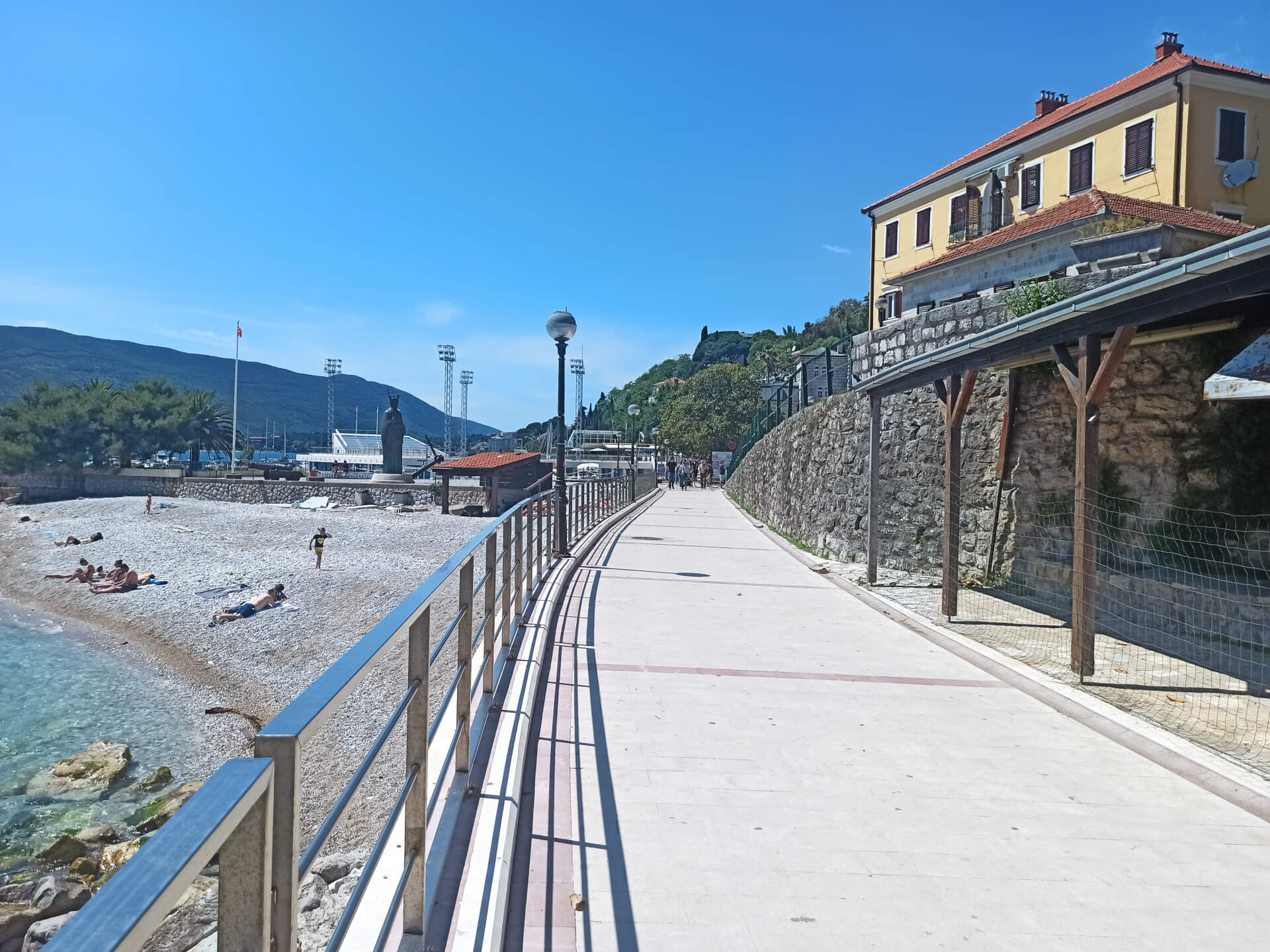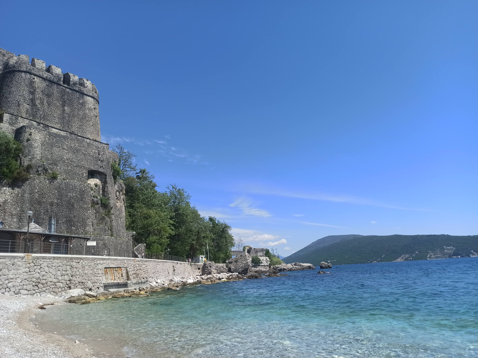 Herceg Novi Beach is a city main beach. It's a very small narrow stony beach located between main attractions of the city - old town's fortress and the king's statue. The location of the beach is perfect - the beach is located in the center of the city, near the port and main promenade. The beach is separated from the port with the long pier that ends with the lighthouse, that's why the water is very clear and clean.