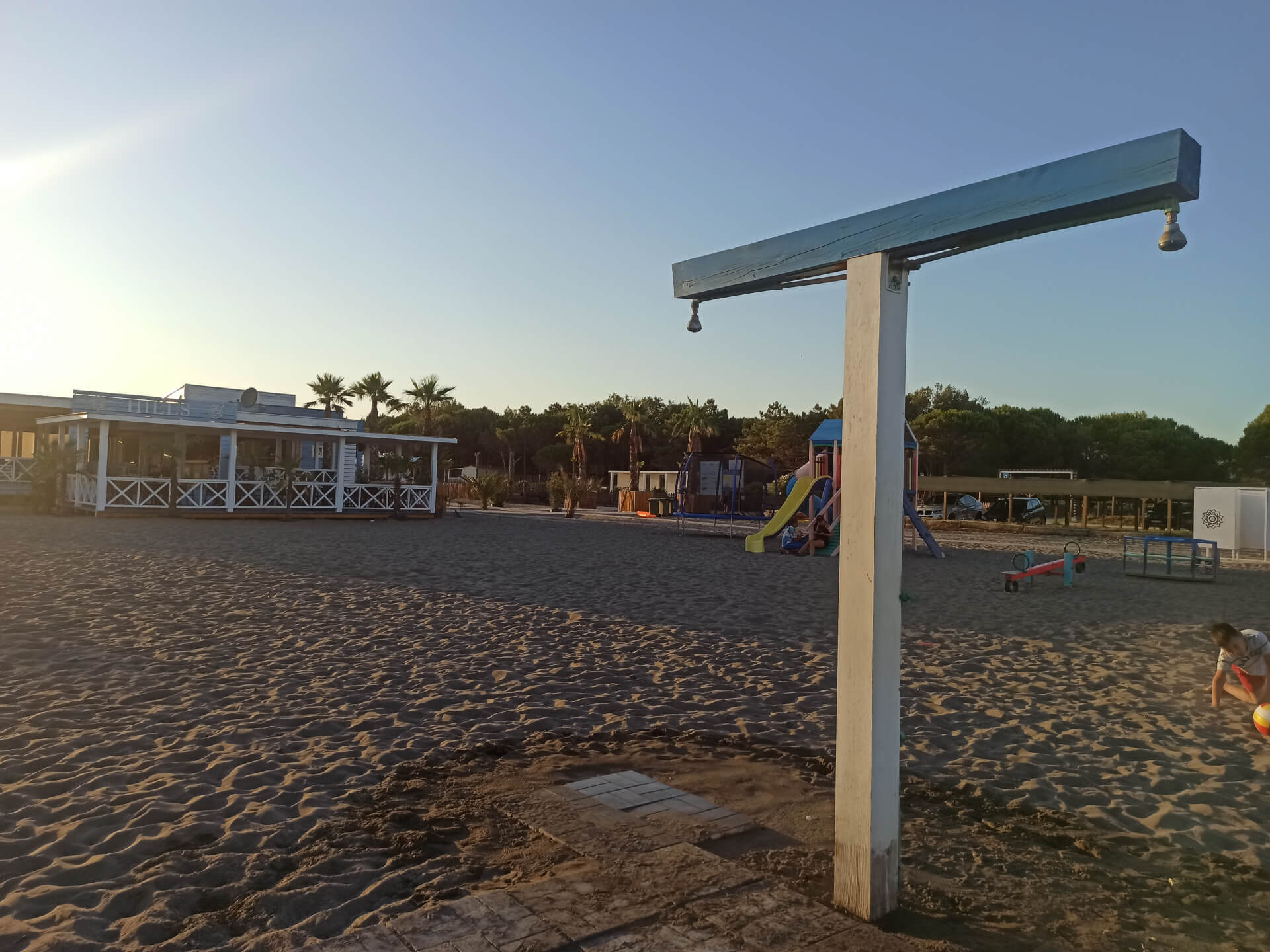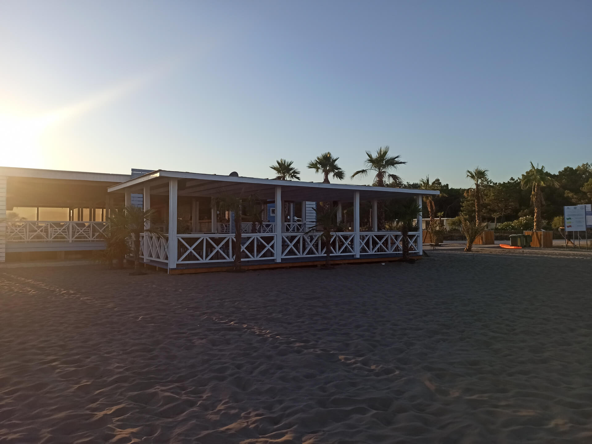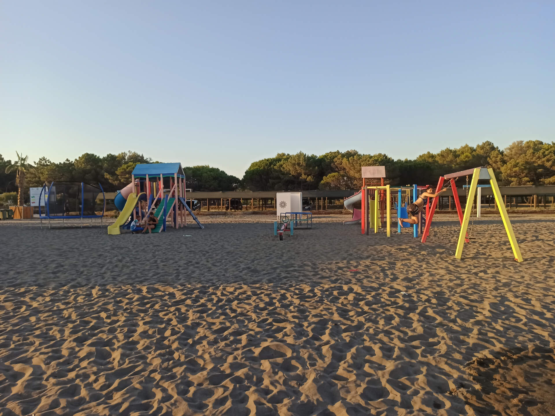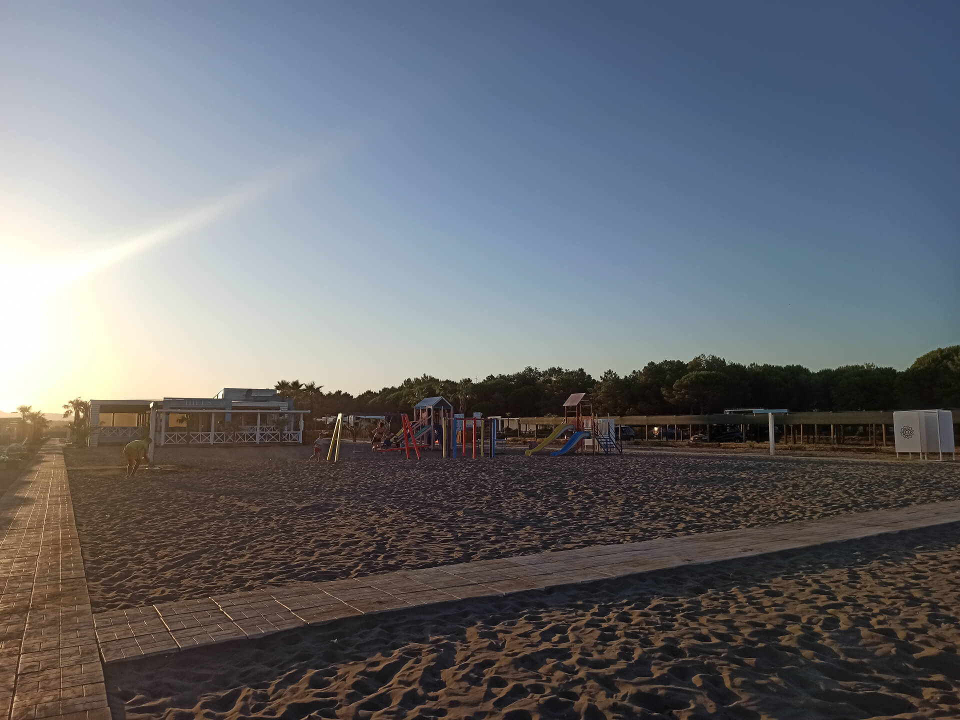 As other beaches along the long beach, there is big comfortable free parking and all the needed facilities - changing rooms, showers, sunbeds, loungers, swings, umbrellas. For families with kids there is a nice playground. Beach bar offers numerous drinks and dishes. There beach is clean and cozy. The territory is well-groomed.