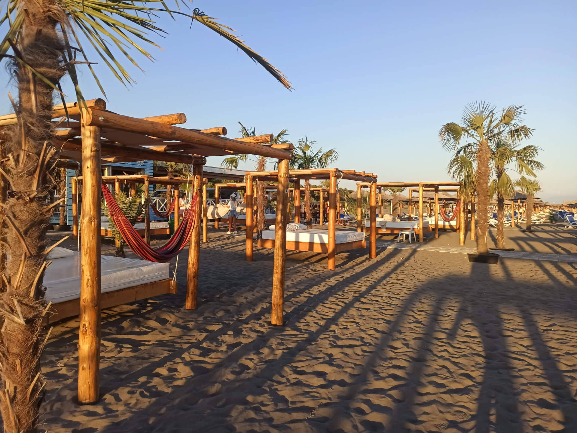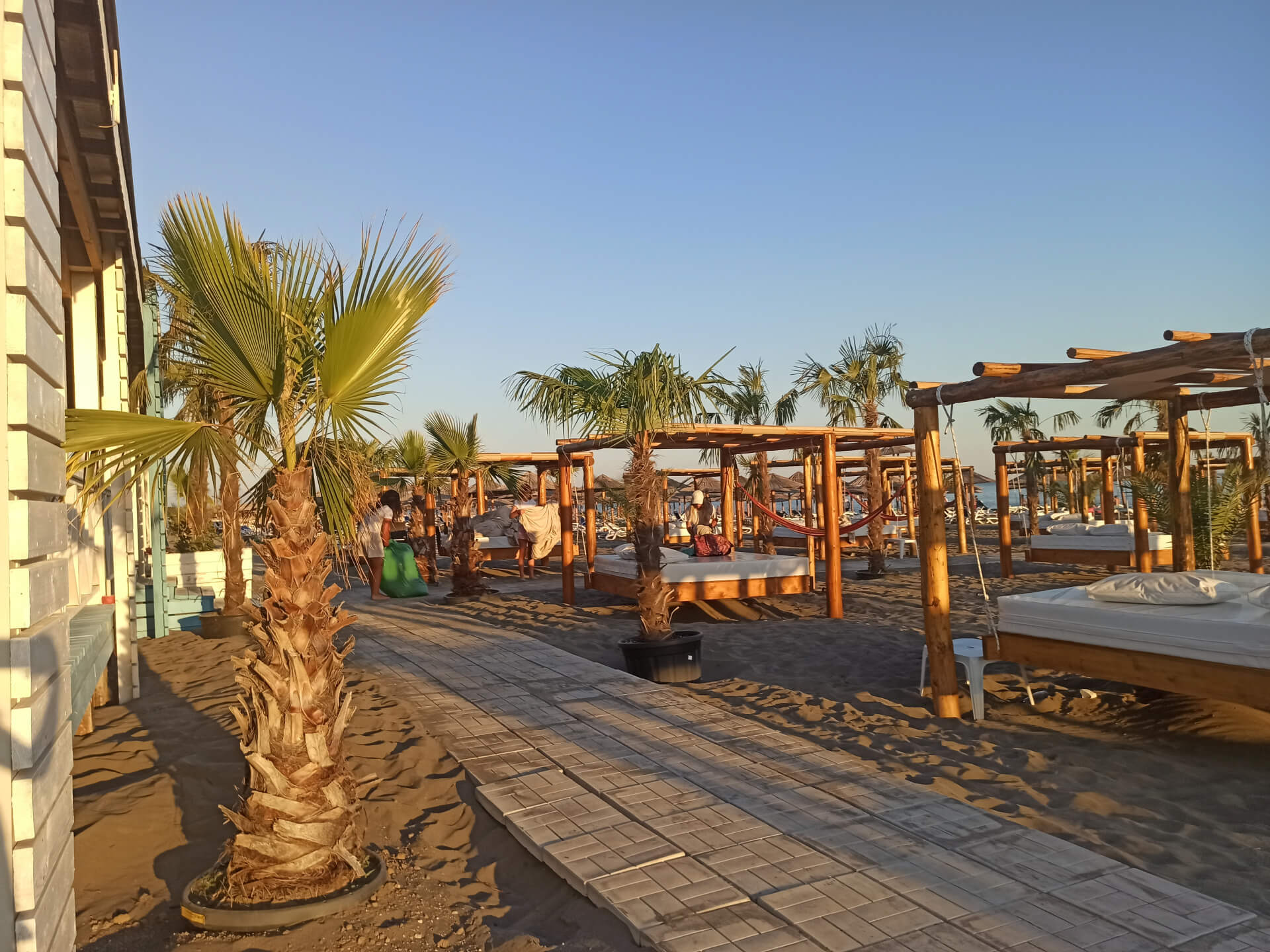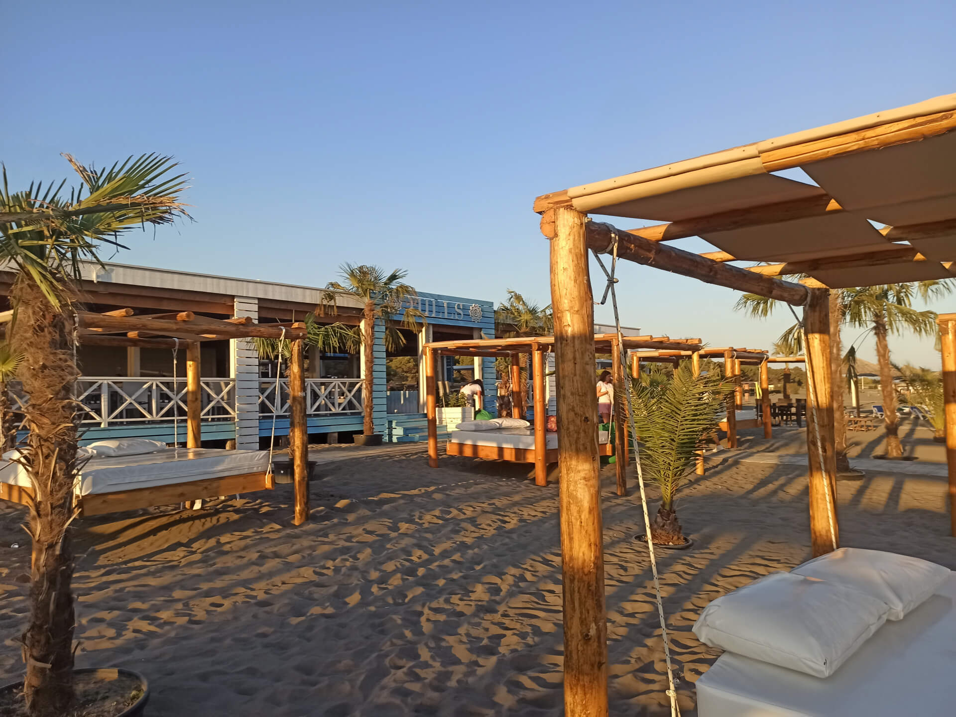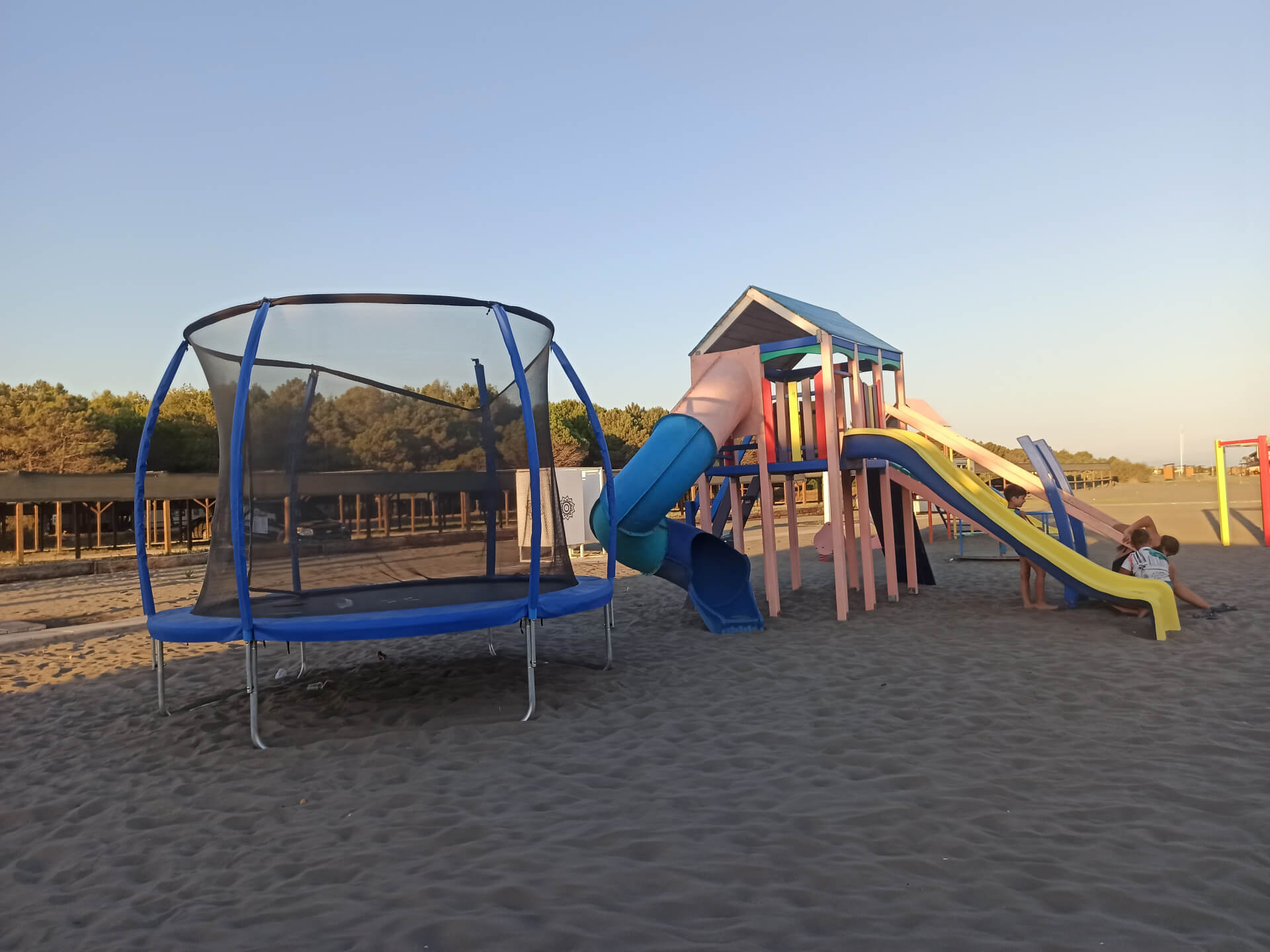 As other beaches along the long beach, there is big comfortable free parking and all the needed facilities - changing rooms, showers, sunbeds, loungers, swings, umbrellas. For families with kids there is a nice playground. Beach bar offers numerous drinks and dishes. There beach is clean and cozy. The territory is well-groomed.