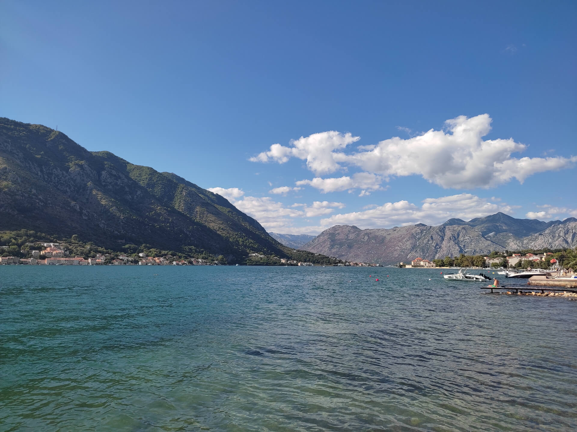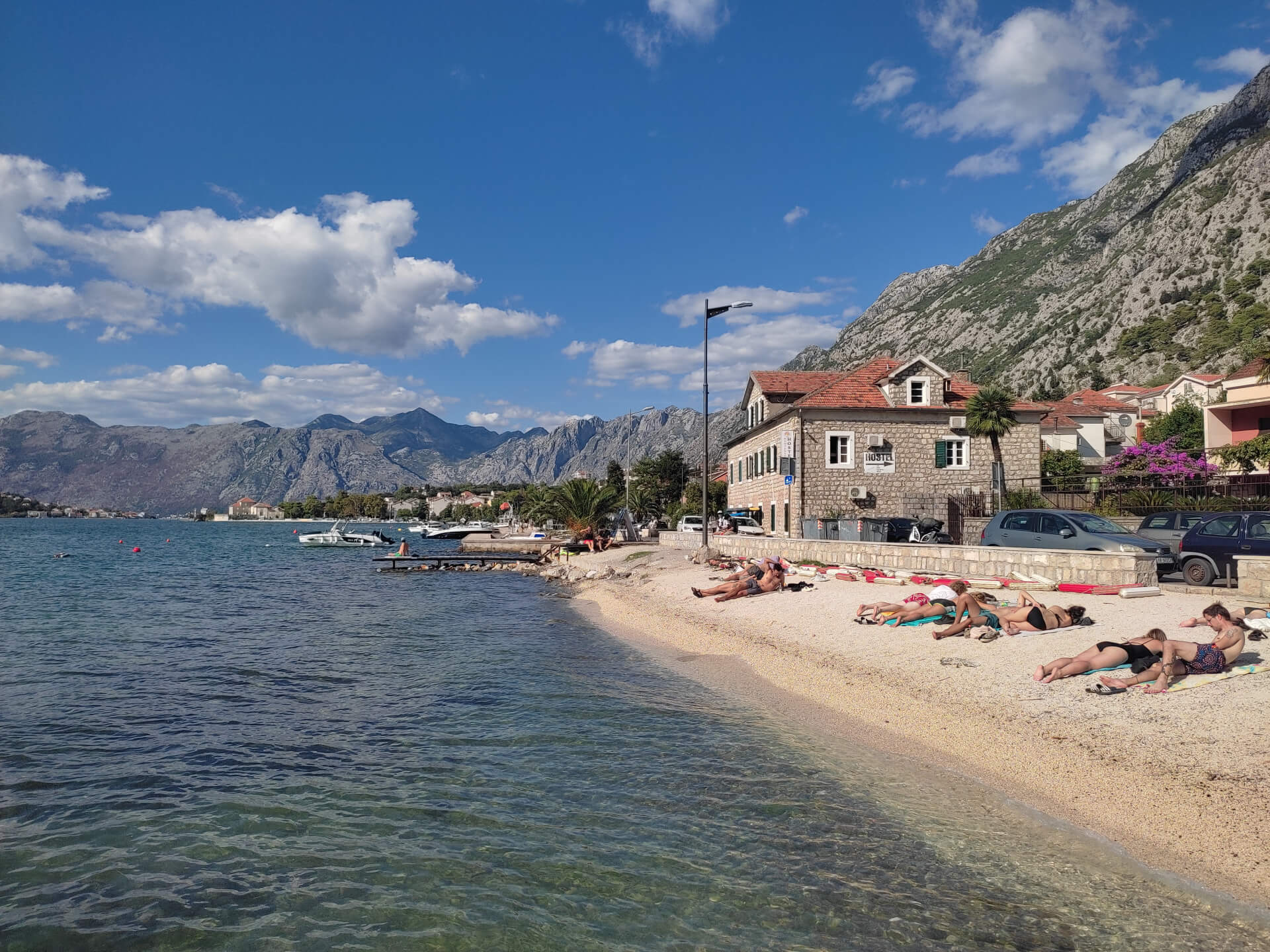 Kotor. It's pebble beach with incredible views to the whole bay of Kotor. The water is pretty transparent and beautiful but if there are a lot of cruise ships and boats sailing in the bay, the water could be a bit polluted. But the main landscape won't leave you indifferent.