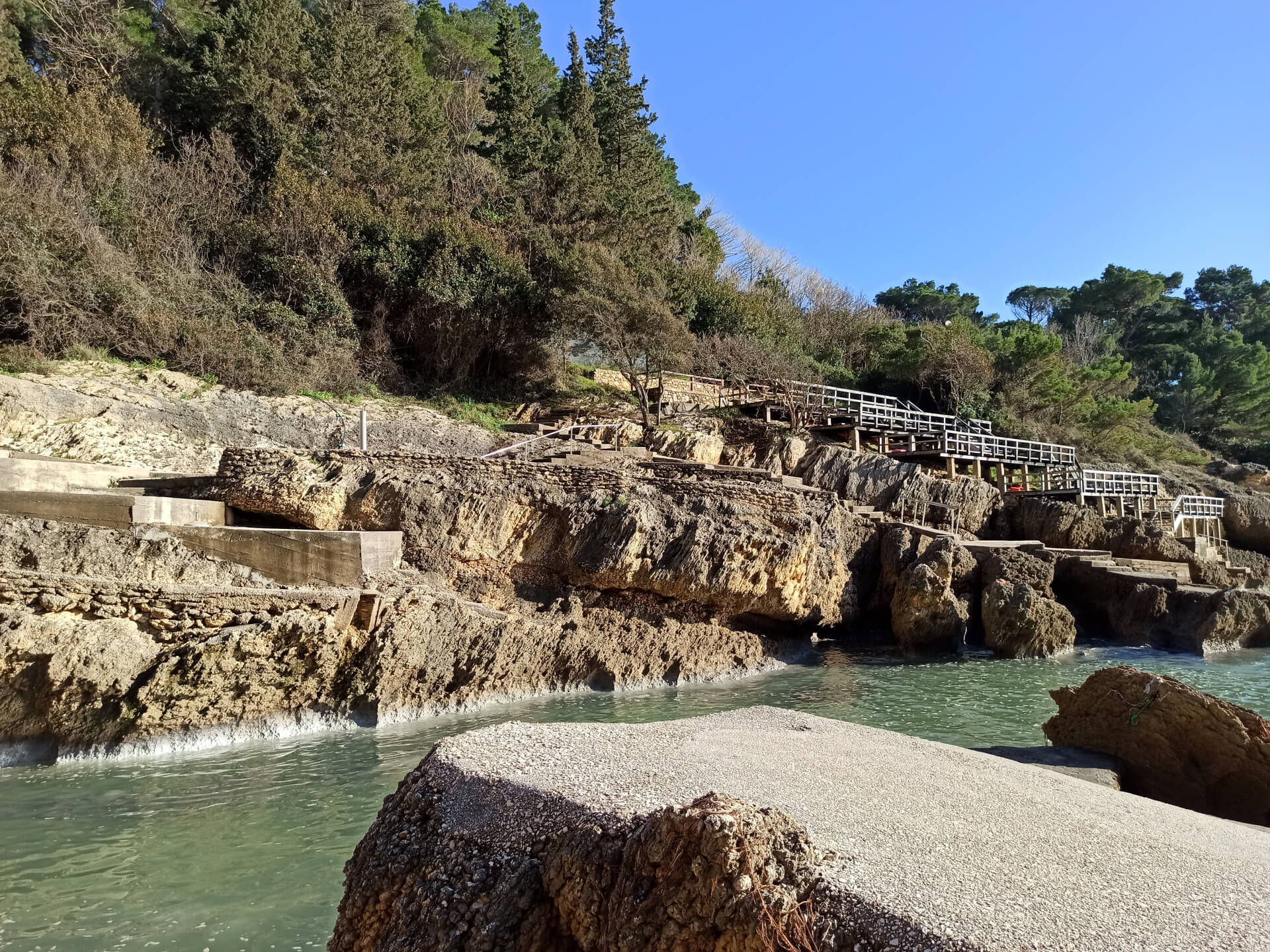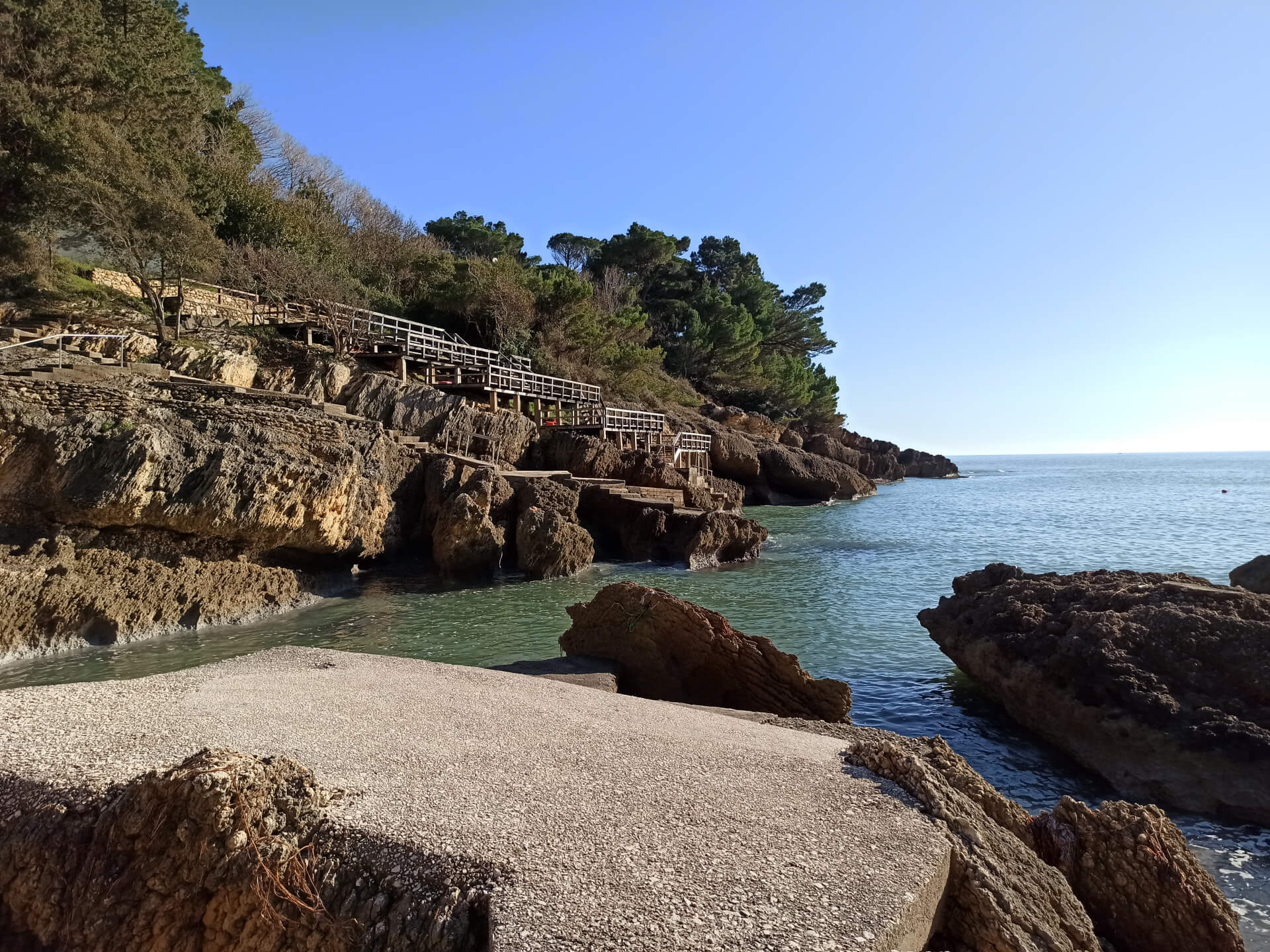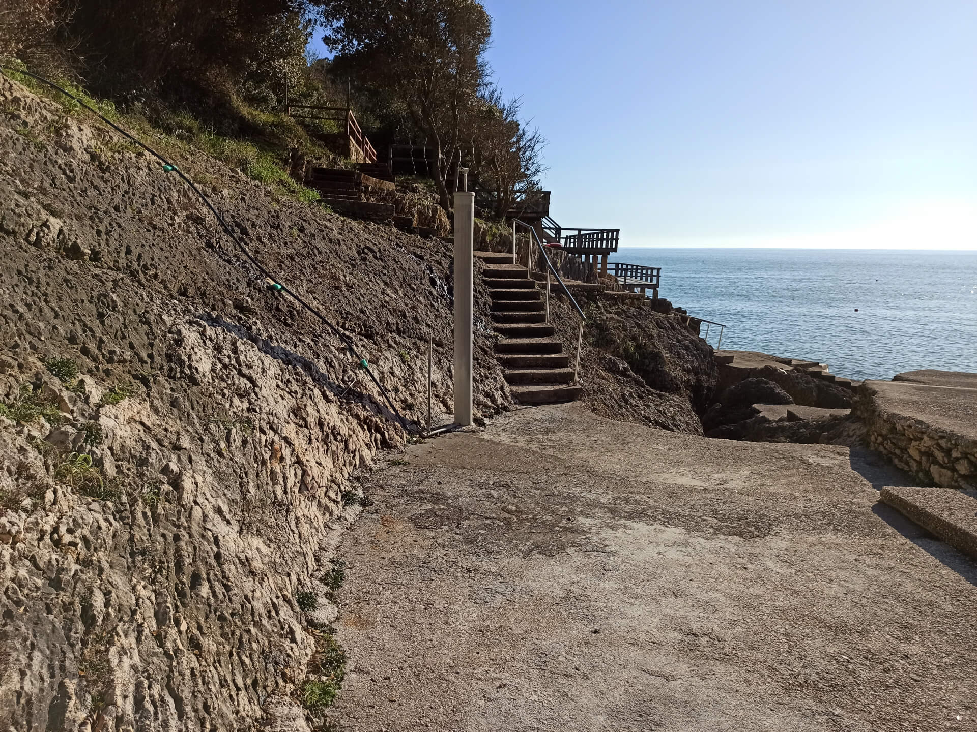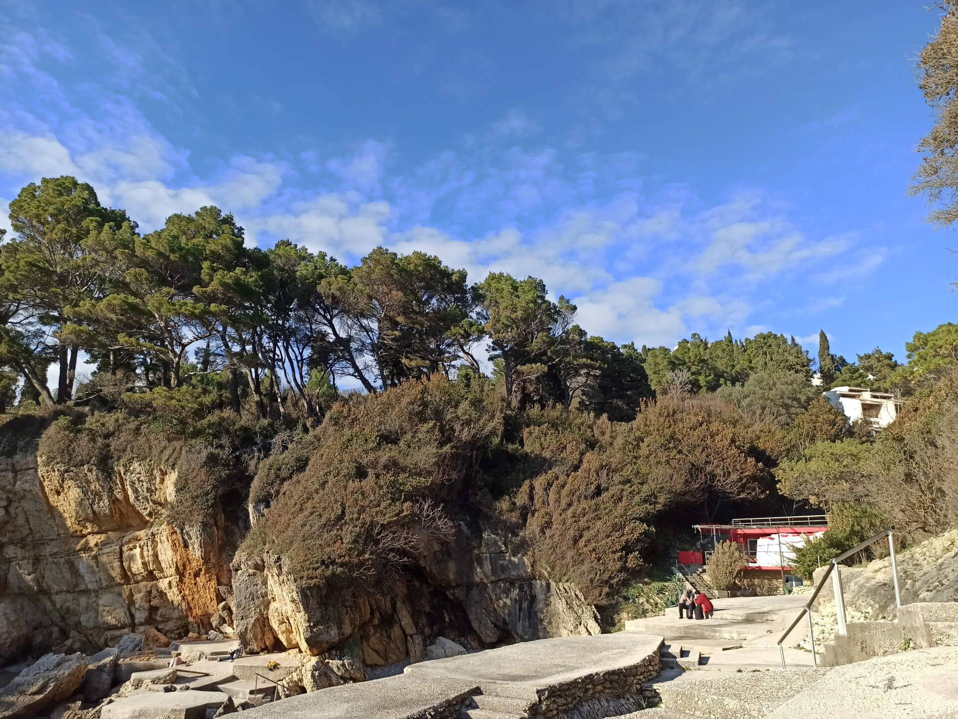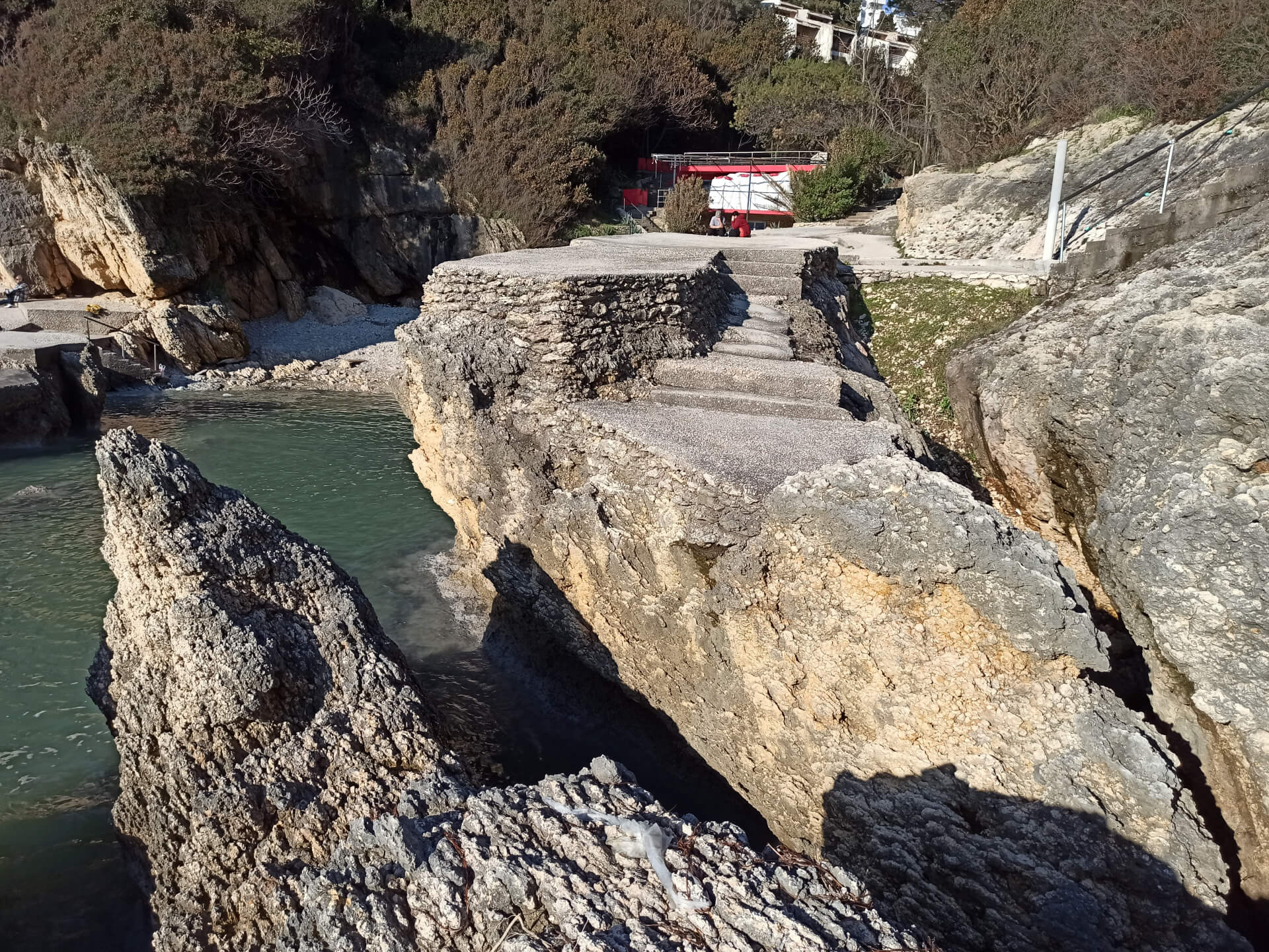 At a low season, when the water gets colder but it's still possible to swim, there could be less people and everything is free. There is a very small stony beach and a few concrete platforms that are made to give an opportunity to put there a sunbed or towel and enjoy sunbathing. There are specifically made stairs that allow to go to swim in the sea. If you swim from the beach - the bottom is pretty stony and there are big rocks in the sea but there are no sea urchins.