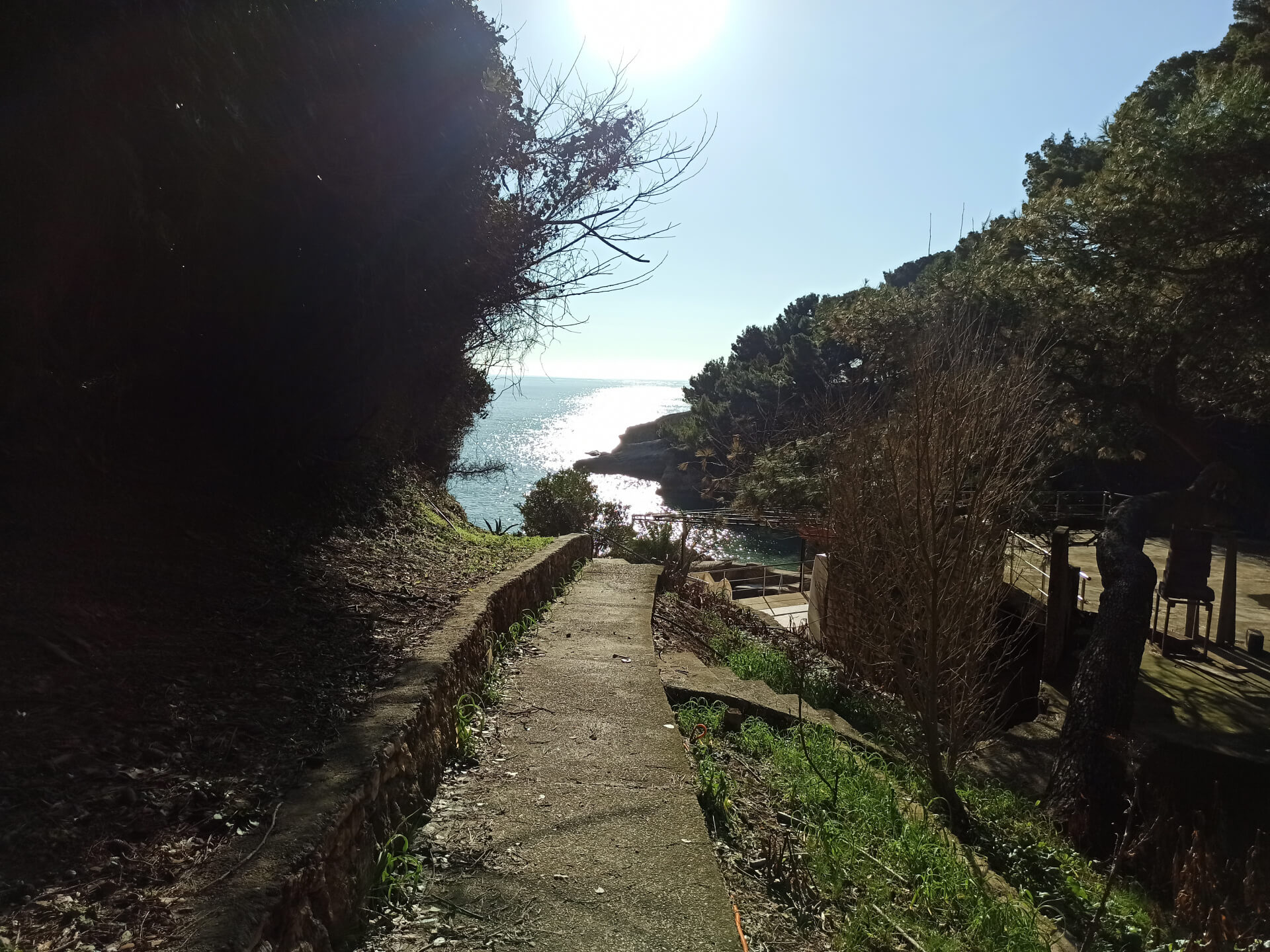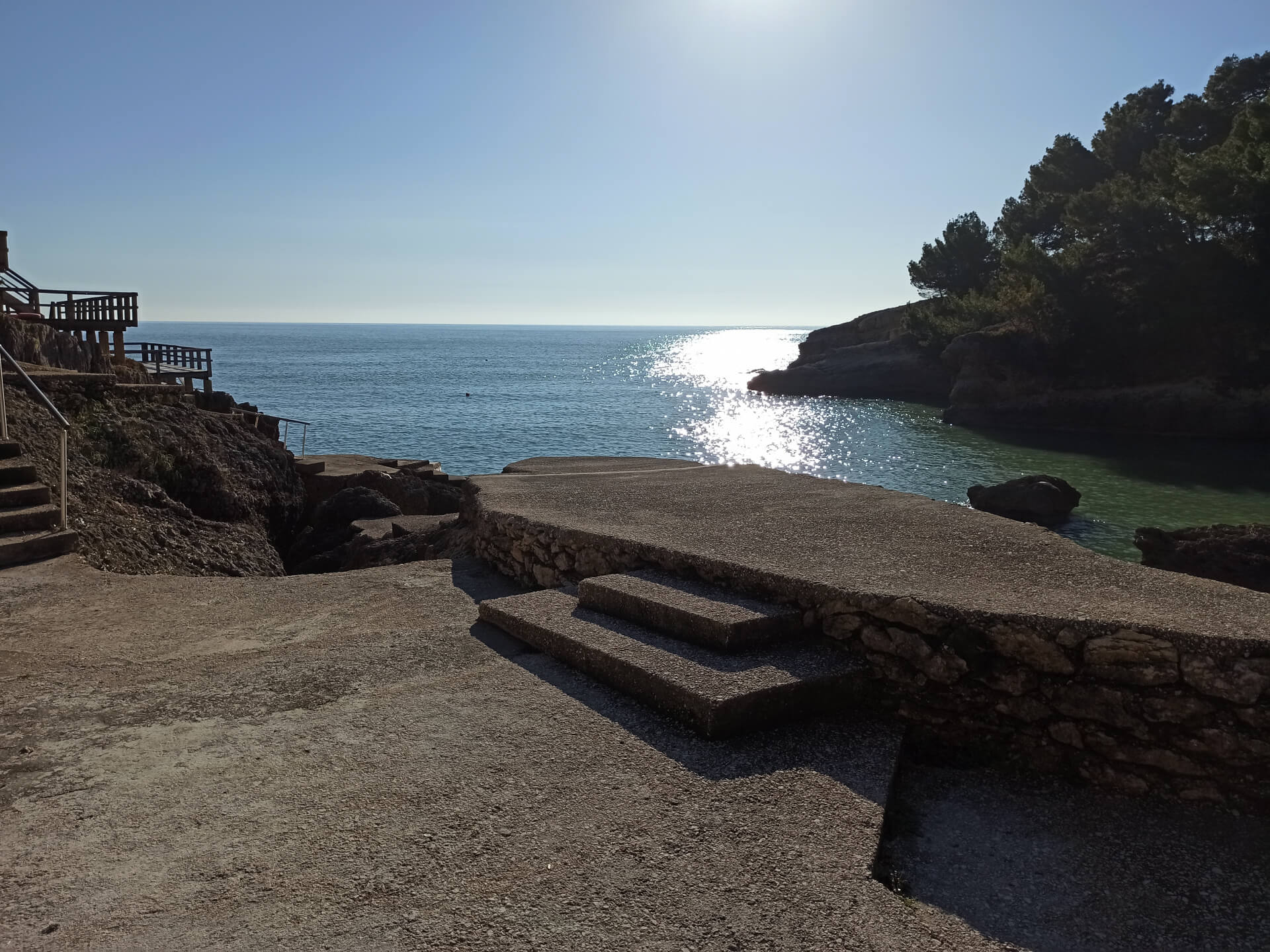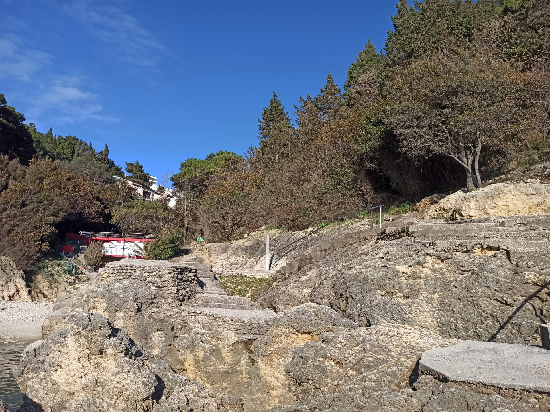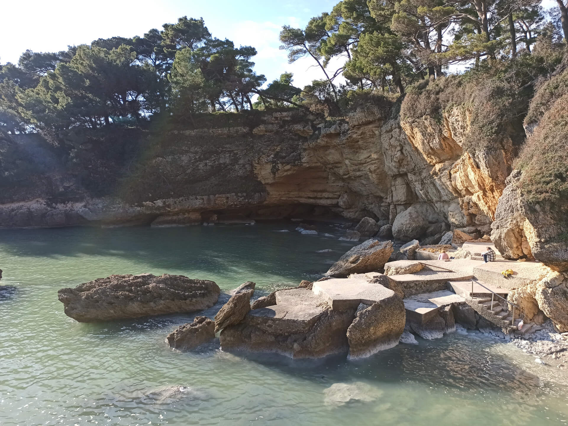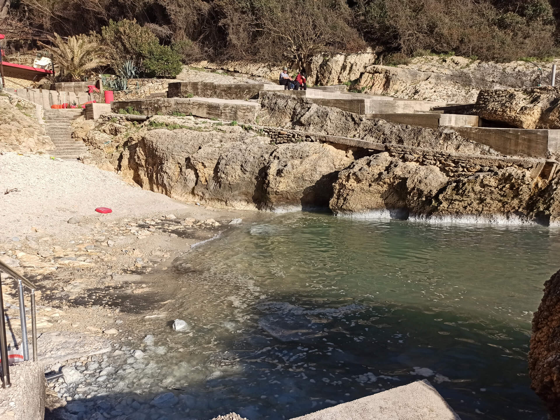 At a low season, when the water gets colder but it's still possible to swim, there could be less people and everything is free. There is a very small stony beach and a few concrete platforms that are made to give an opportunity to put there a sunbed or towel and enjoy sunbathing. There are specifically made stairs that allow to go to swim in the sea. If you swim from the beach - the bottom is pretty stony and there are big rocks in the sea but there are no sea urchins.