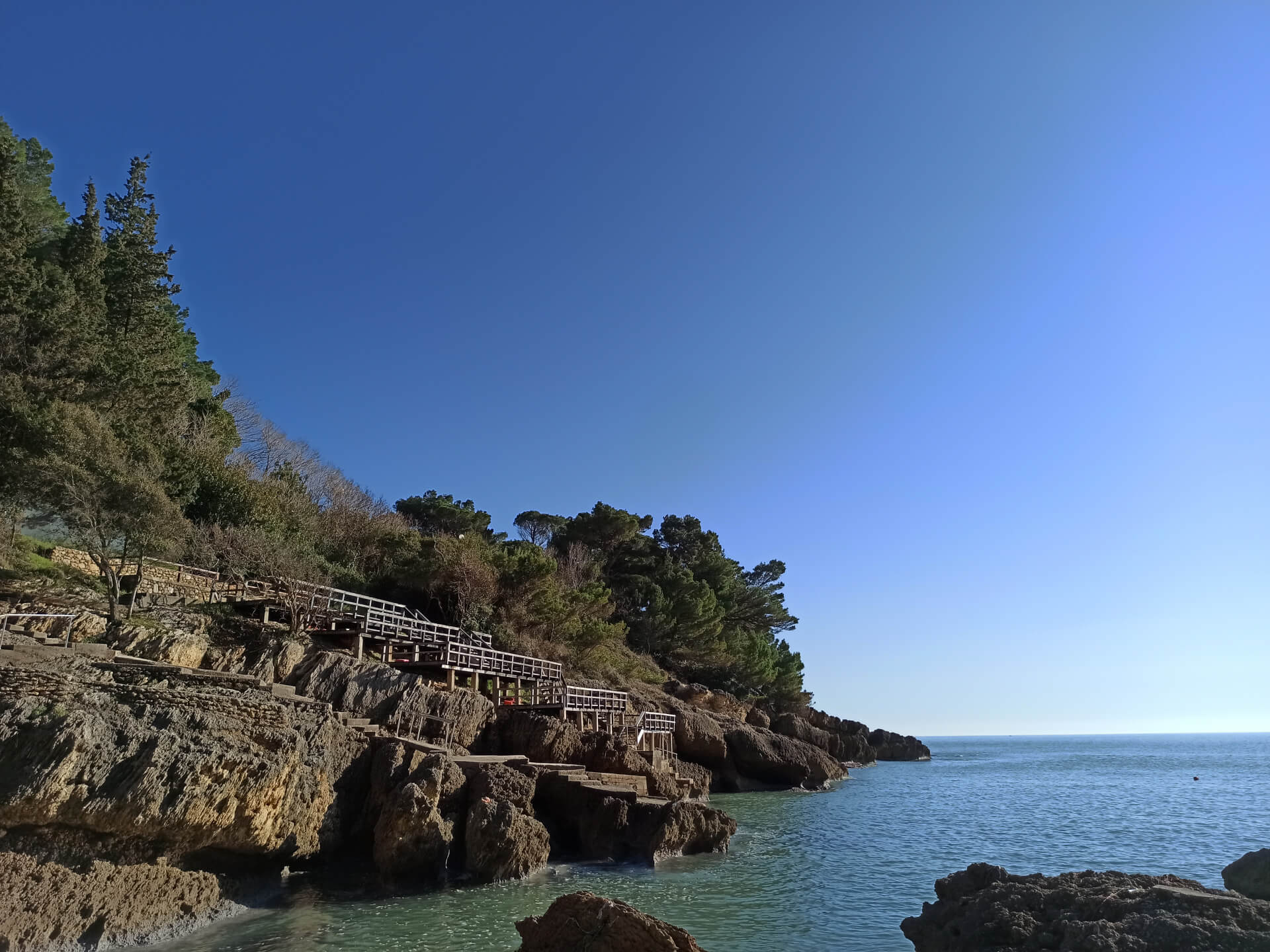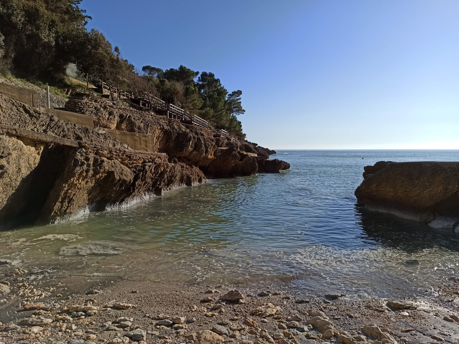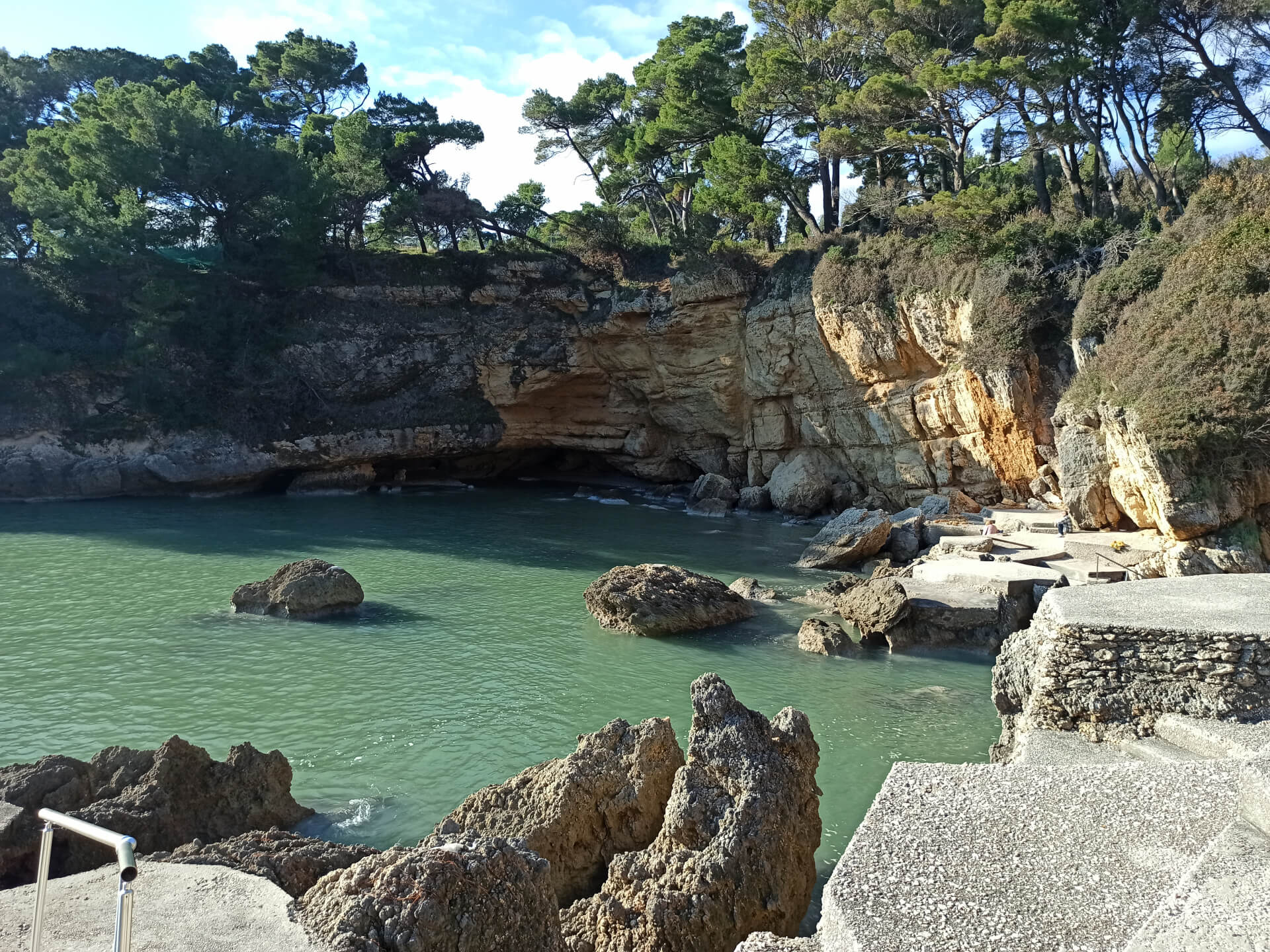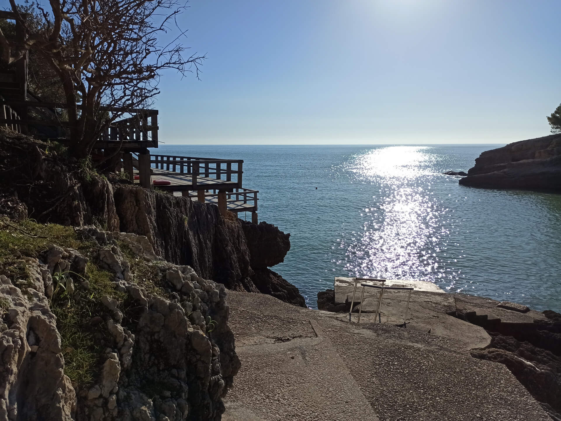 At a low season, when the water gets colder but it's still possible to swim, there could be less people and everything is free. There is a very small stony beach and a few concrete platforms that are made to give an opportunity to put there a sunbed or towel and enjoy sunbathing. There are specifically made stairs that allow to go to swim in the sea. If you swim from the beach - the bottom is pretty stony and there are big rocks in the sea but there are no sea urchins.