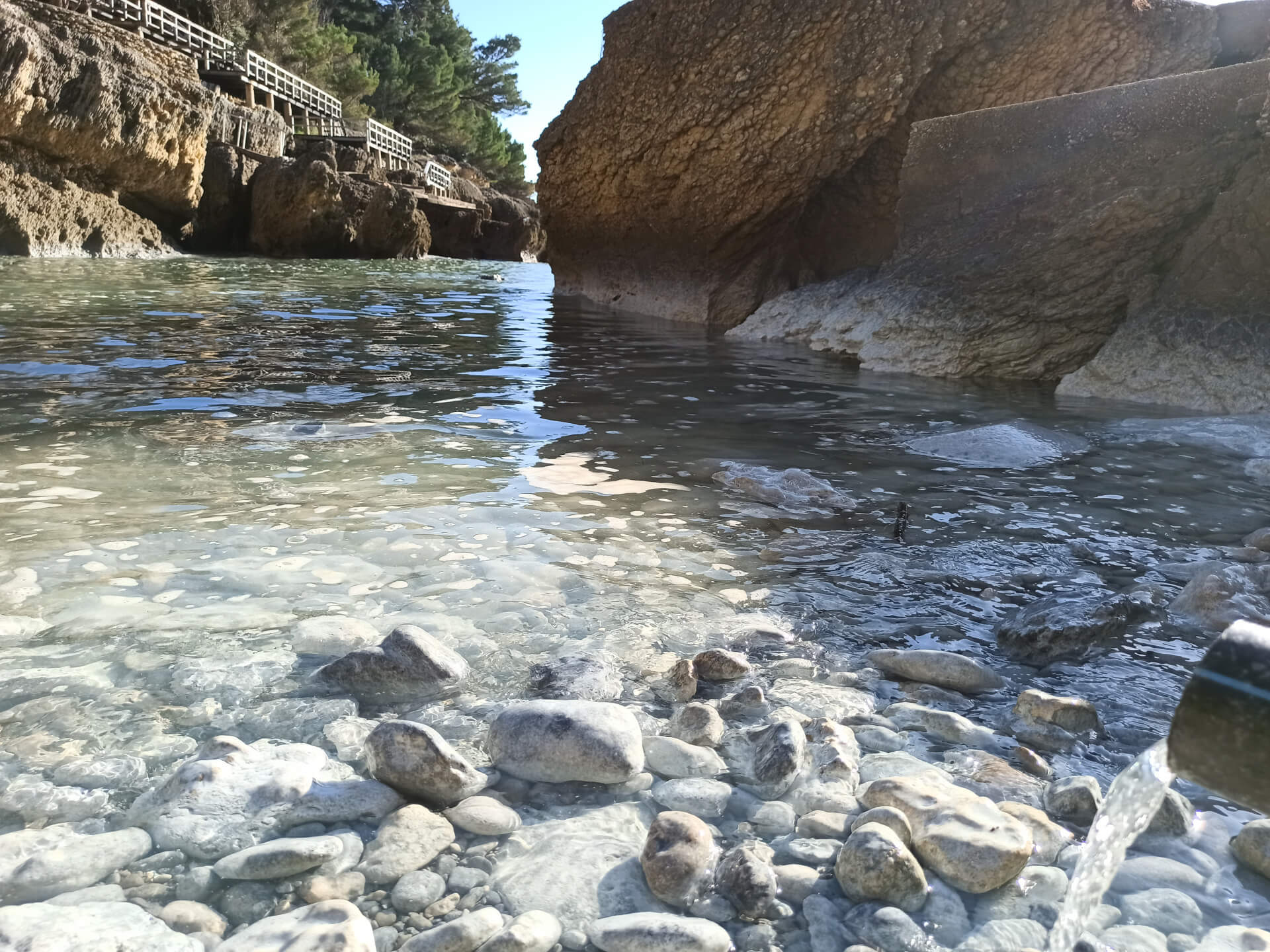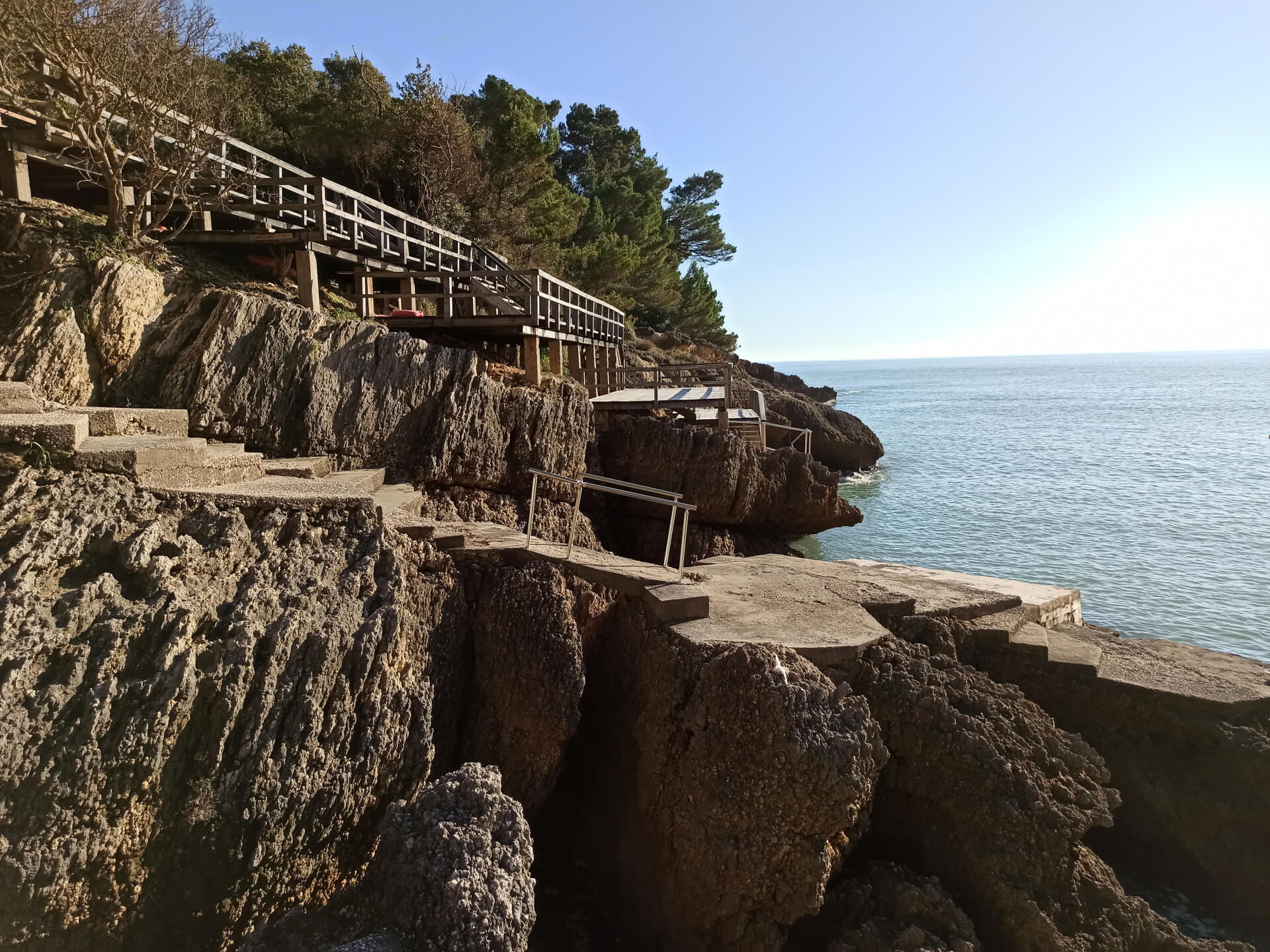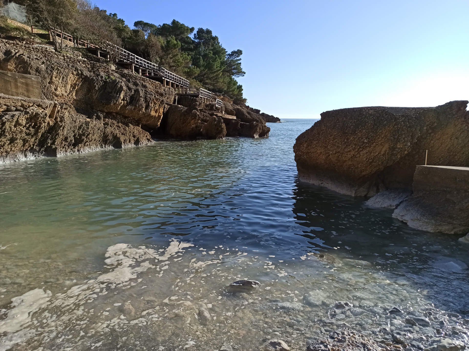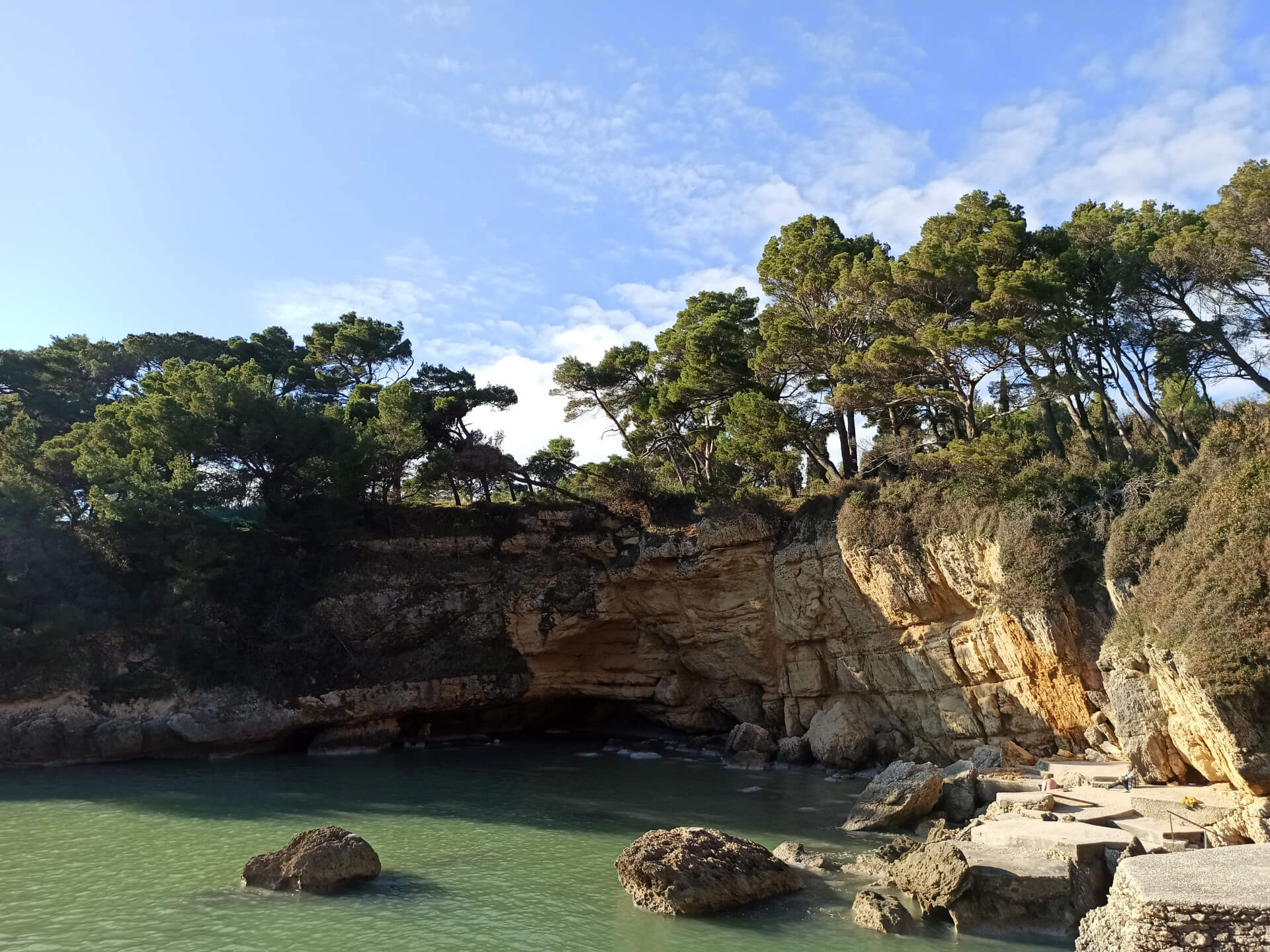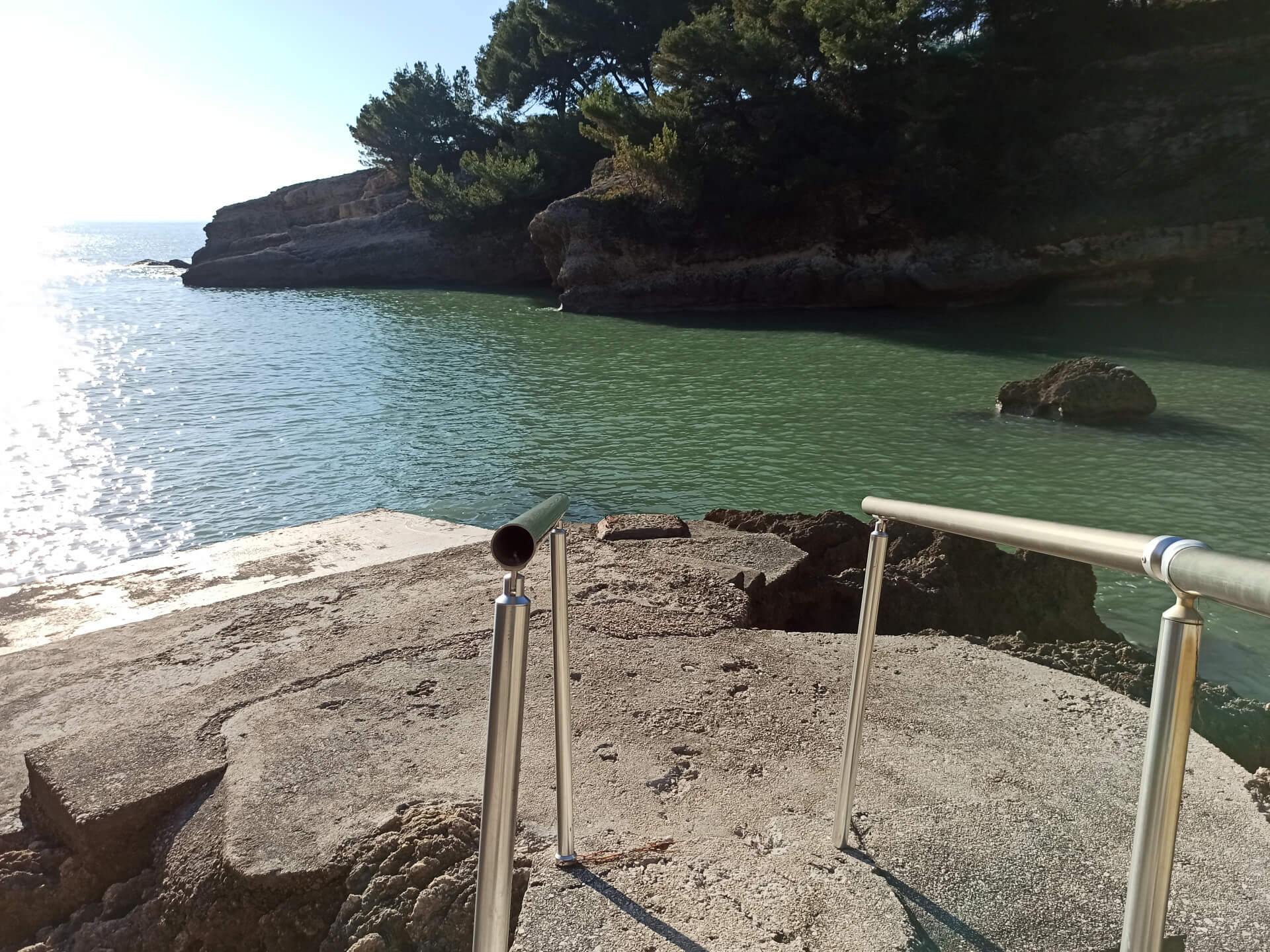 At a low season, when the water gets colder but it's still possible to swim, there could be less people and everything is free. There is a very small stony beach and a few concrete platforms that are made to give an opportunity to put there a sunbed or towel and enjoy sunbathing. There are specifically made stairs that allow to go to swim in the sea. If you swim from the beach - the bottom is pretty stony and there are big rocks in the sea but there are no sea urchins.