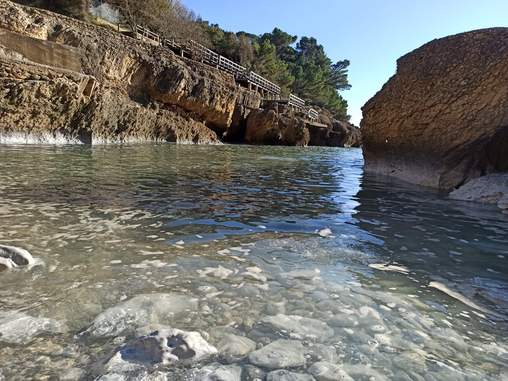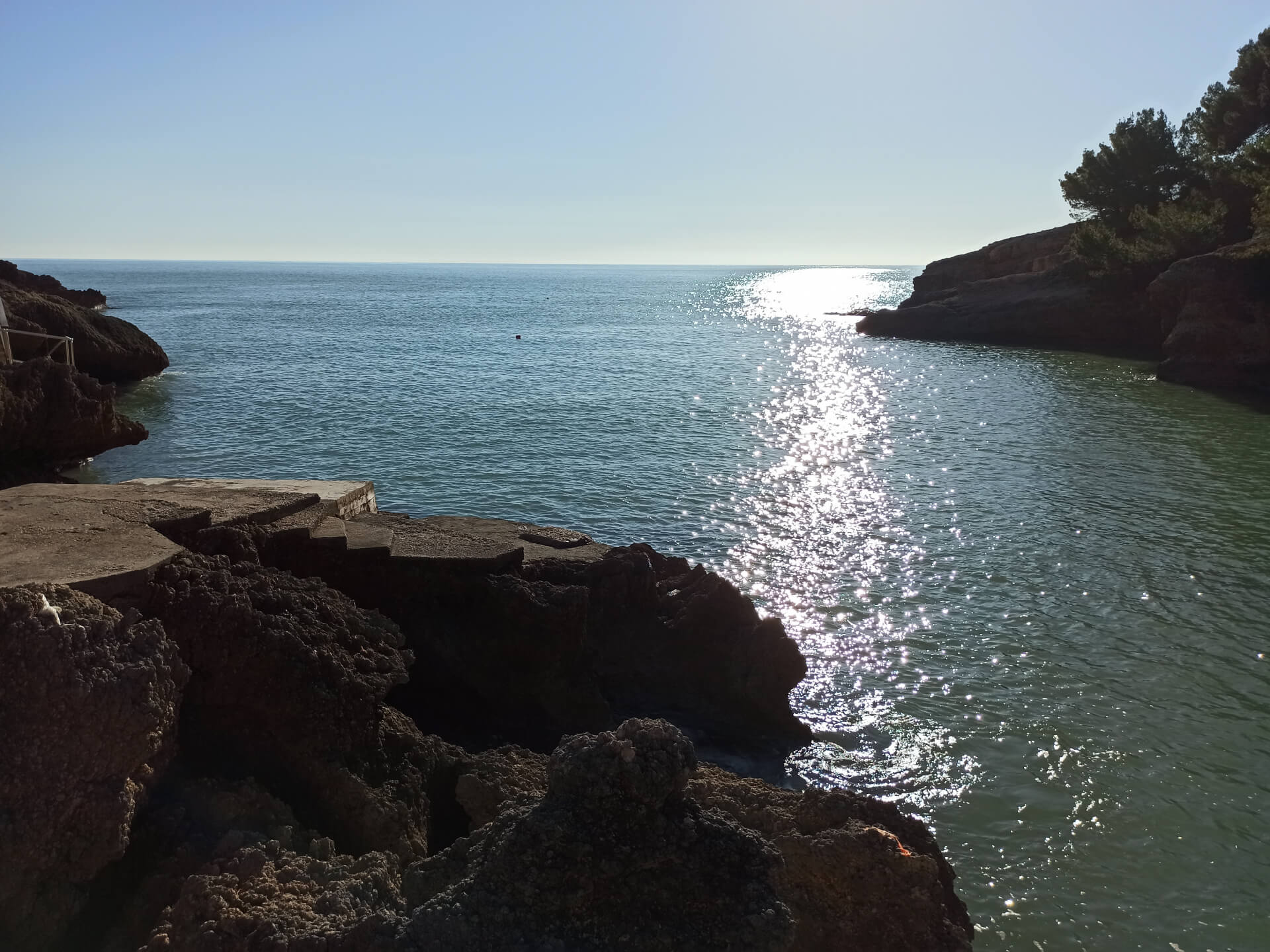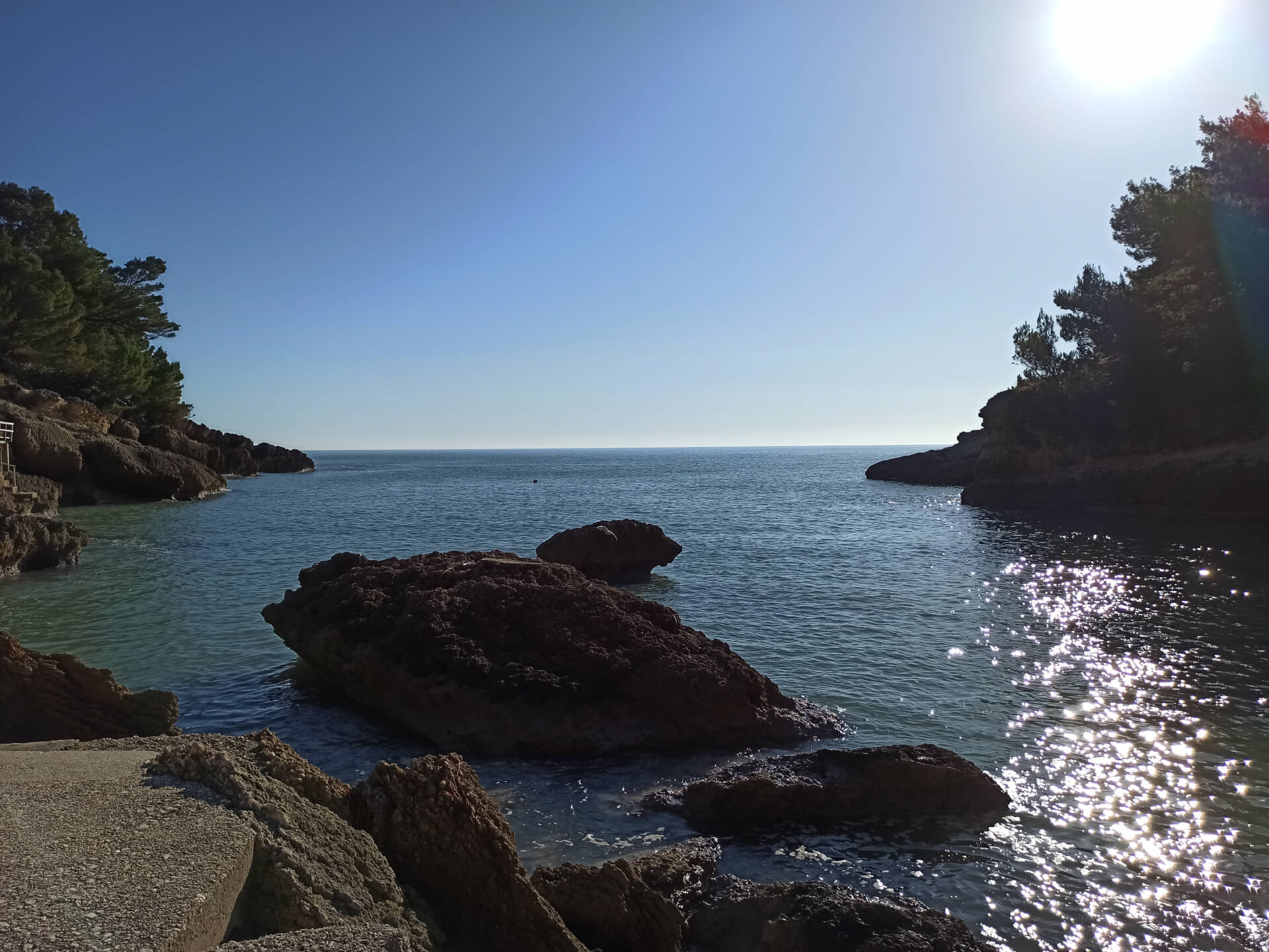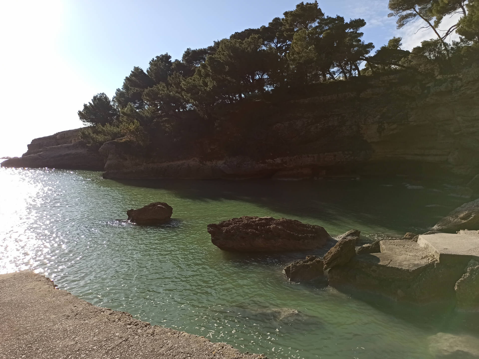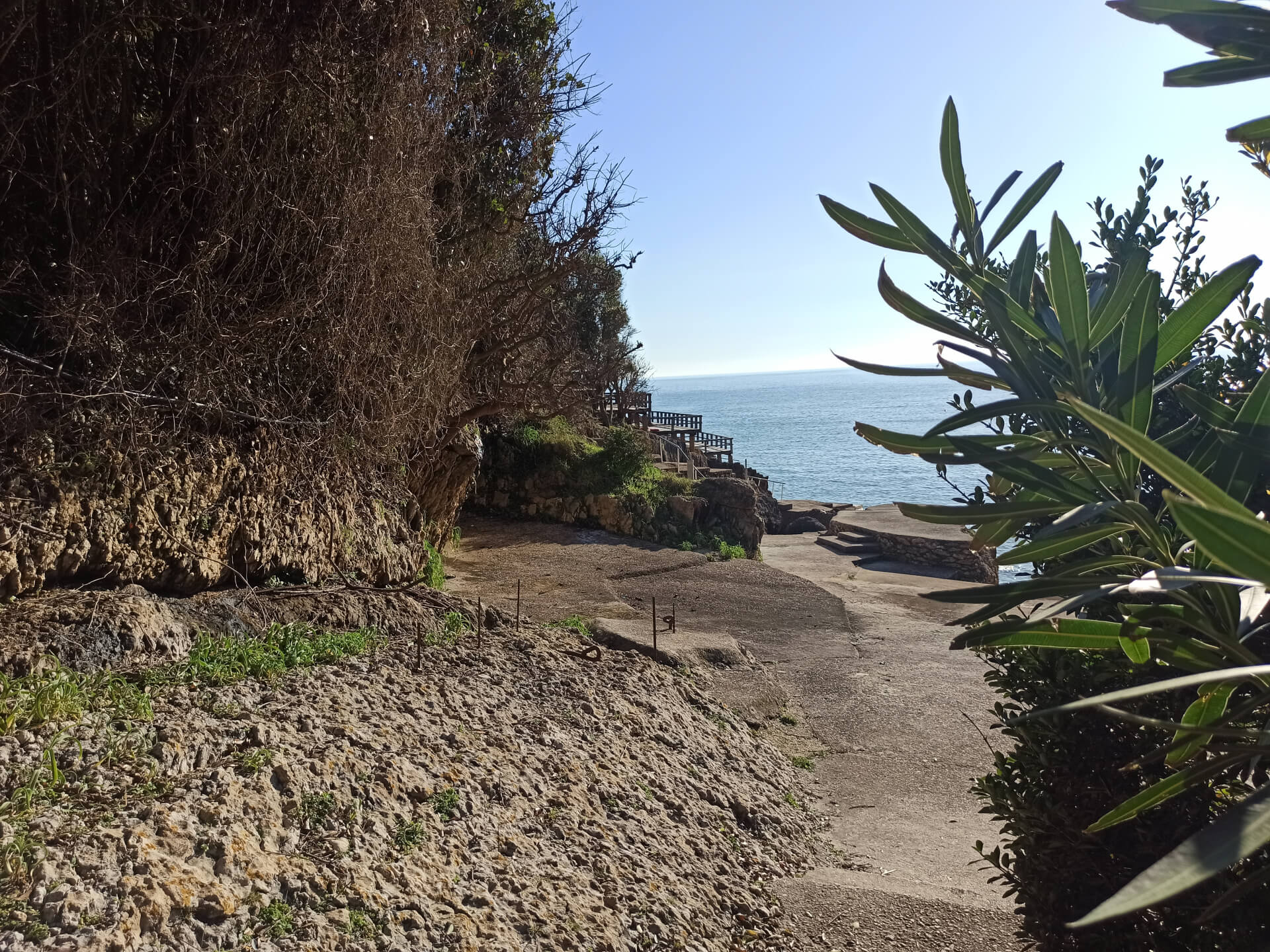 At a low season, when the water gets colder but it's still possible to swim, there could be less people and everything is free. There is a very small stony beach and a few concrete platforms that are made to give an opportunity to put there a sunbed or towel and enjoy sunbathing. There are specifically made stairs that allow to go to swim in the sea. If you swim from the beach - the bottom is pretty stony and there are big rocks in the sea but there are no sea urchins.