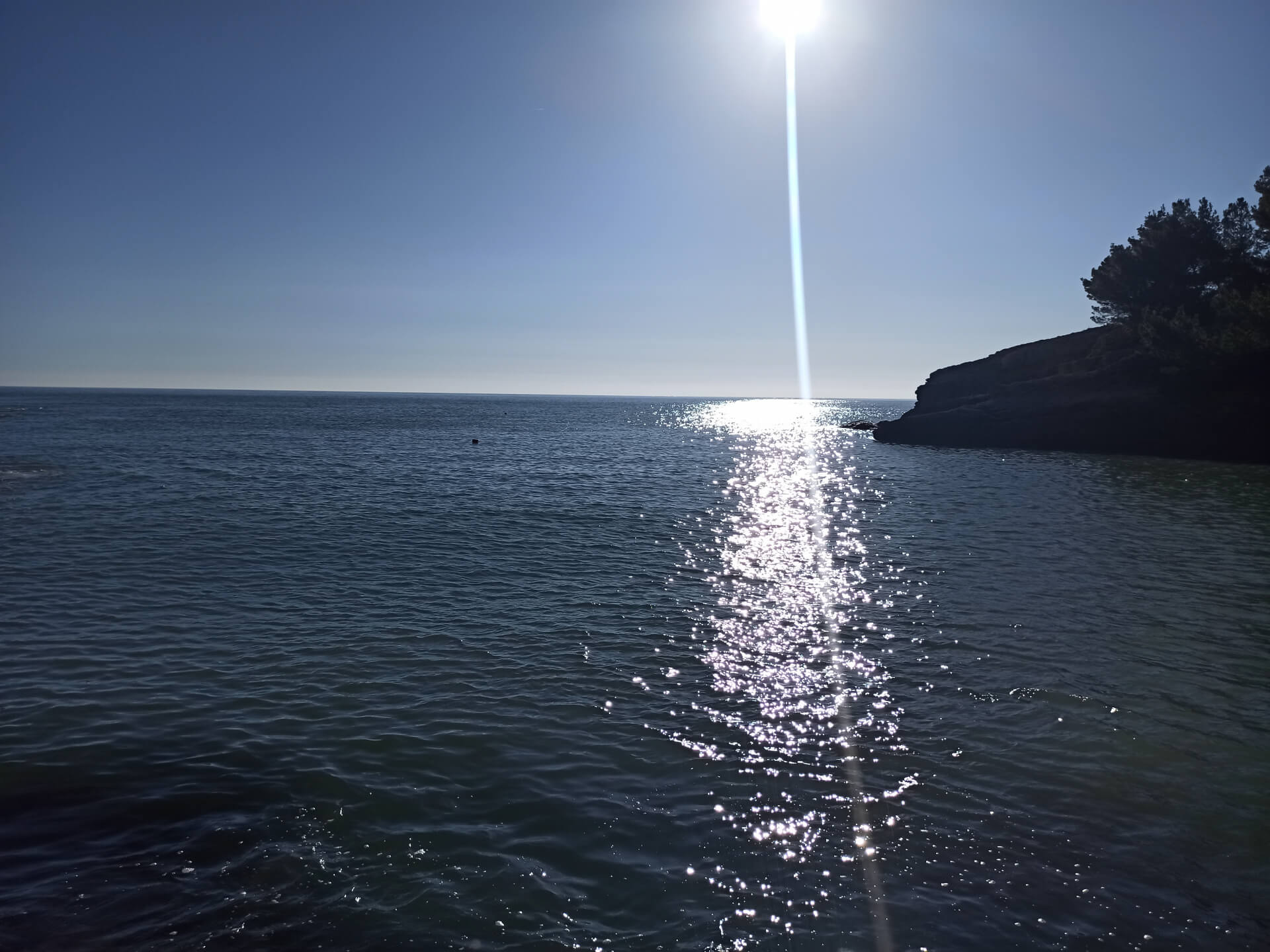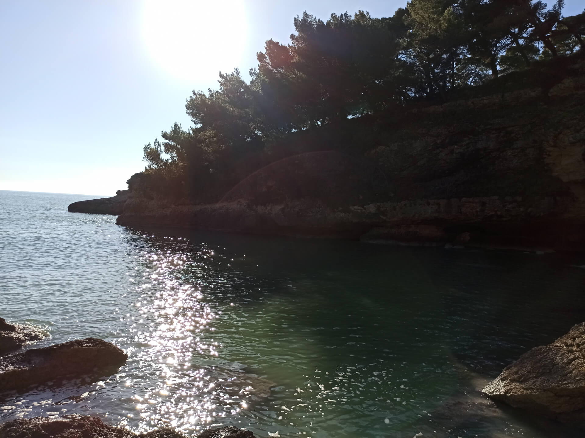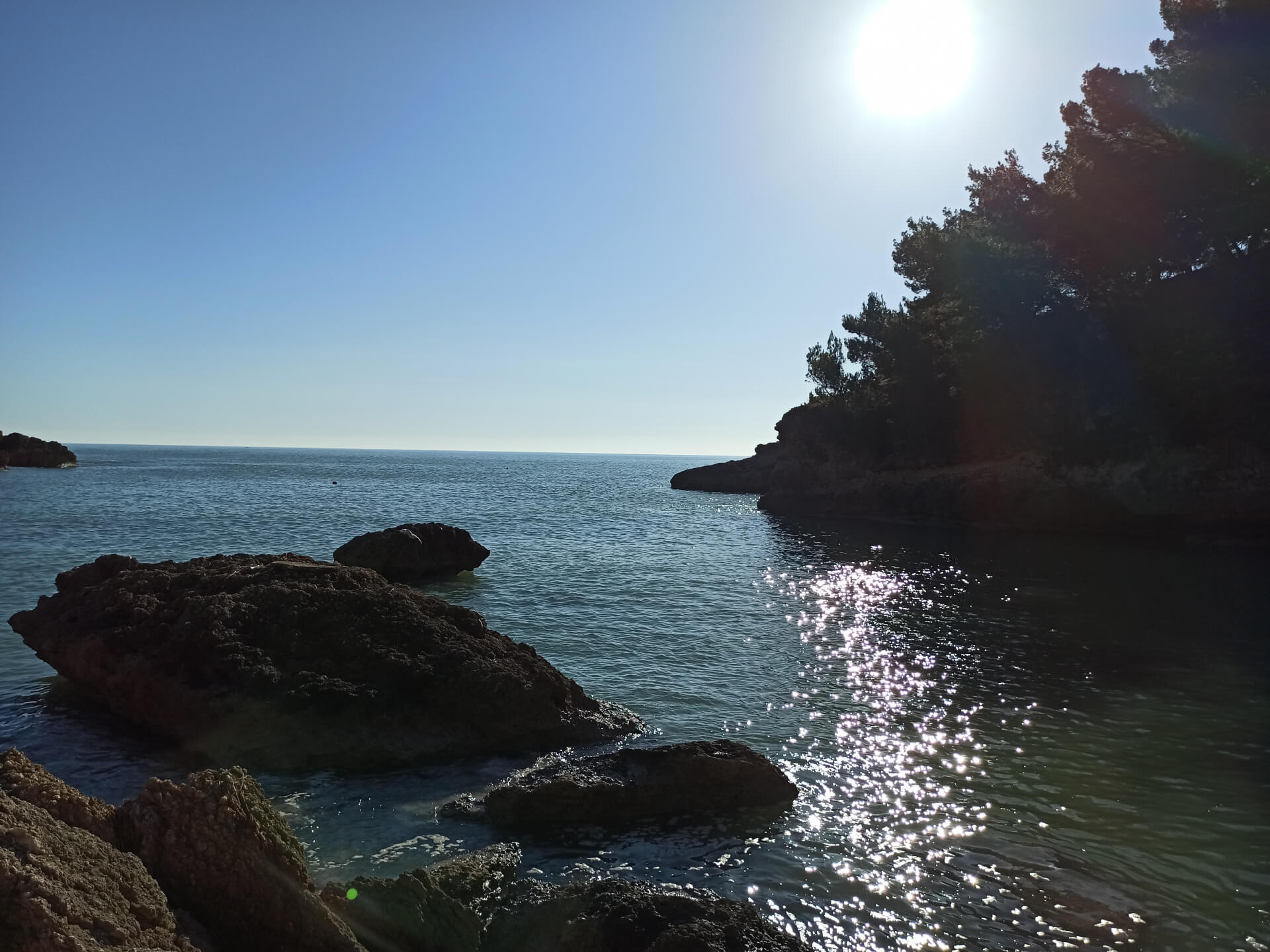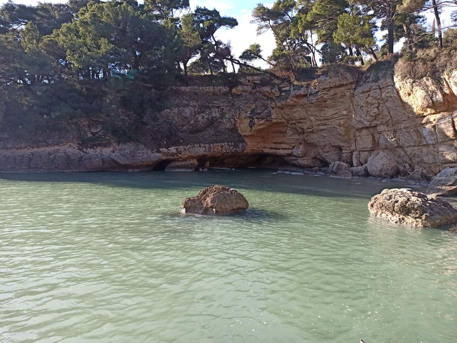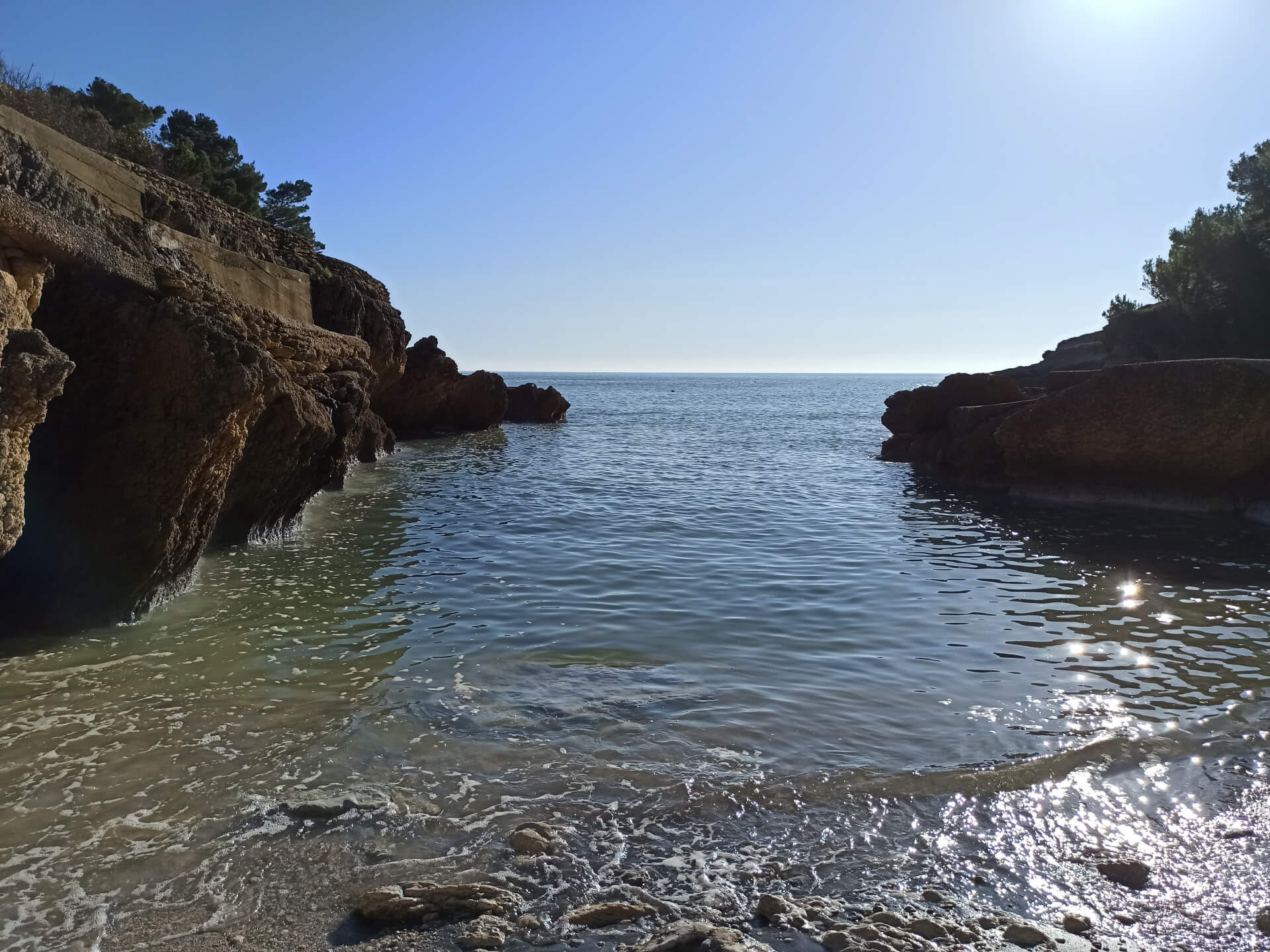At a low season, when the water gets colder but it's still possible to swim, there could be less people and everything is free. There is a very small stony beach and a few concrete platforms that are made to give an opportunity to put there a sunbed or towel and enjoy sunbathing. There are specifically made stairs that allow to go to swim in the sea. If you swim from the beach - the bottom is pretty stony and there are big rocks in the sea but there are no sea urchins.