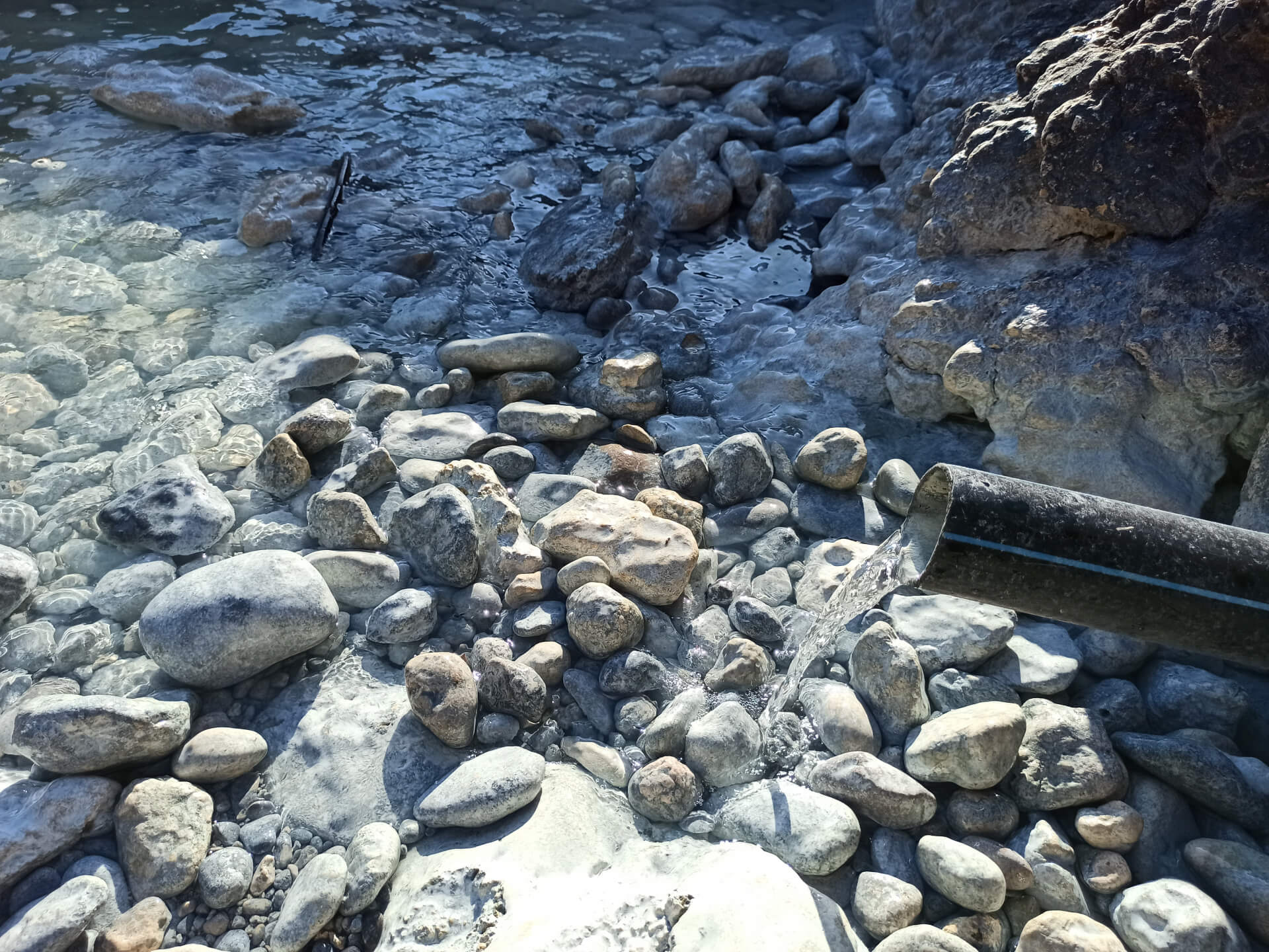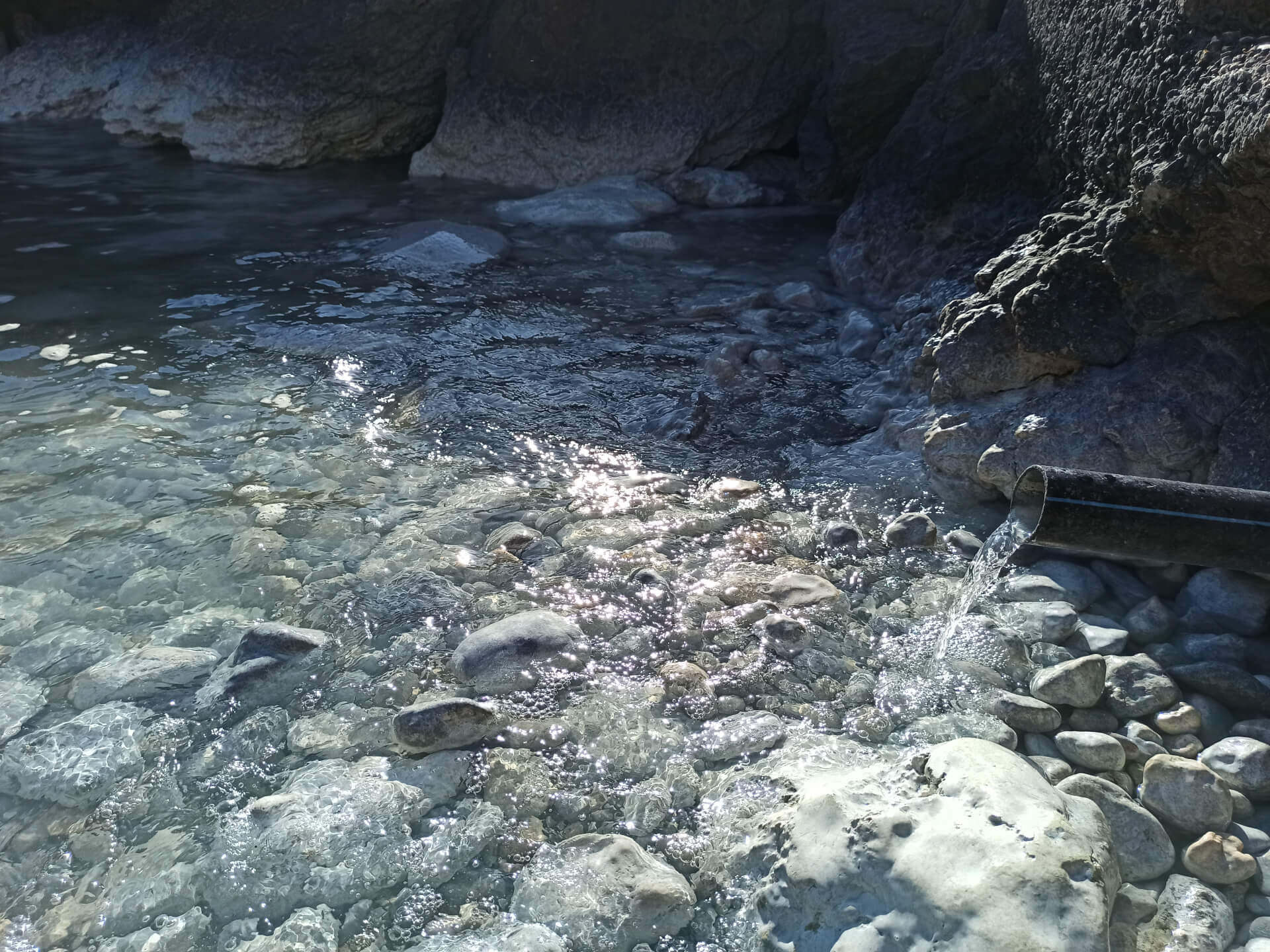 The sulphur spring, that goes directly to the sea, colors the water making it a bit lighter and muddy. The spring has a specific smell. But in general the water is very clear and clean there. Surrounded by rocks and hills, the view is pretty amazing. Pine trees around add lovely smell of pure nature. The atmosphere on the beach is very peaceful and conducive to healing. Many women come with empty bottles and you can fill your own bottles with this water from the spring, you can take it with you. You can drench yourself with its water from the bottles or swim directly in the sea. It is allowed to swim there in a swimsuit or half-naked, or fully naked. It's really up to you. There is a cave there where you can swim and explore. There is a specific woman who works there and controls so no one man won't go into the beach.
