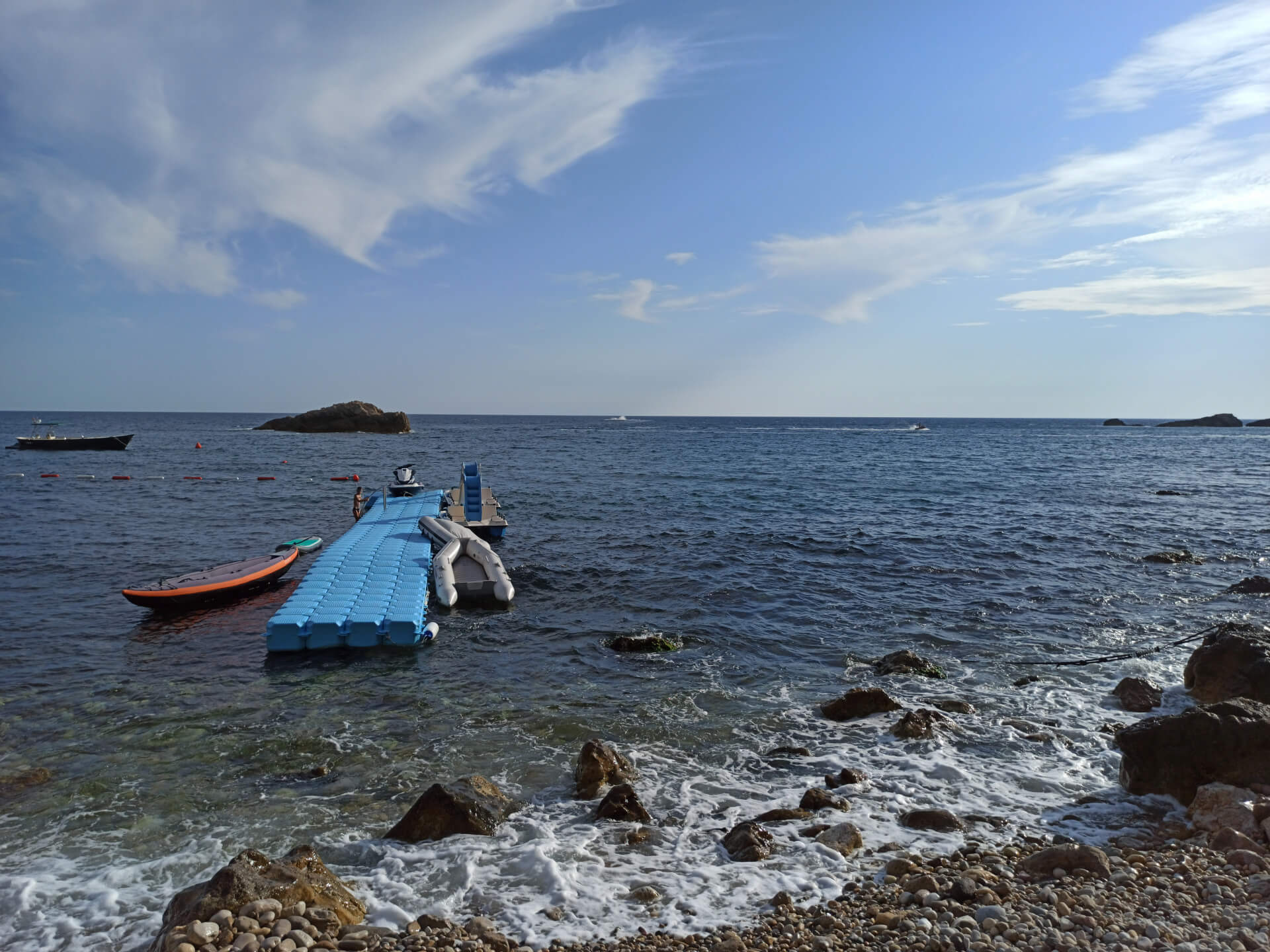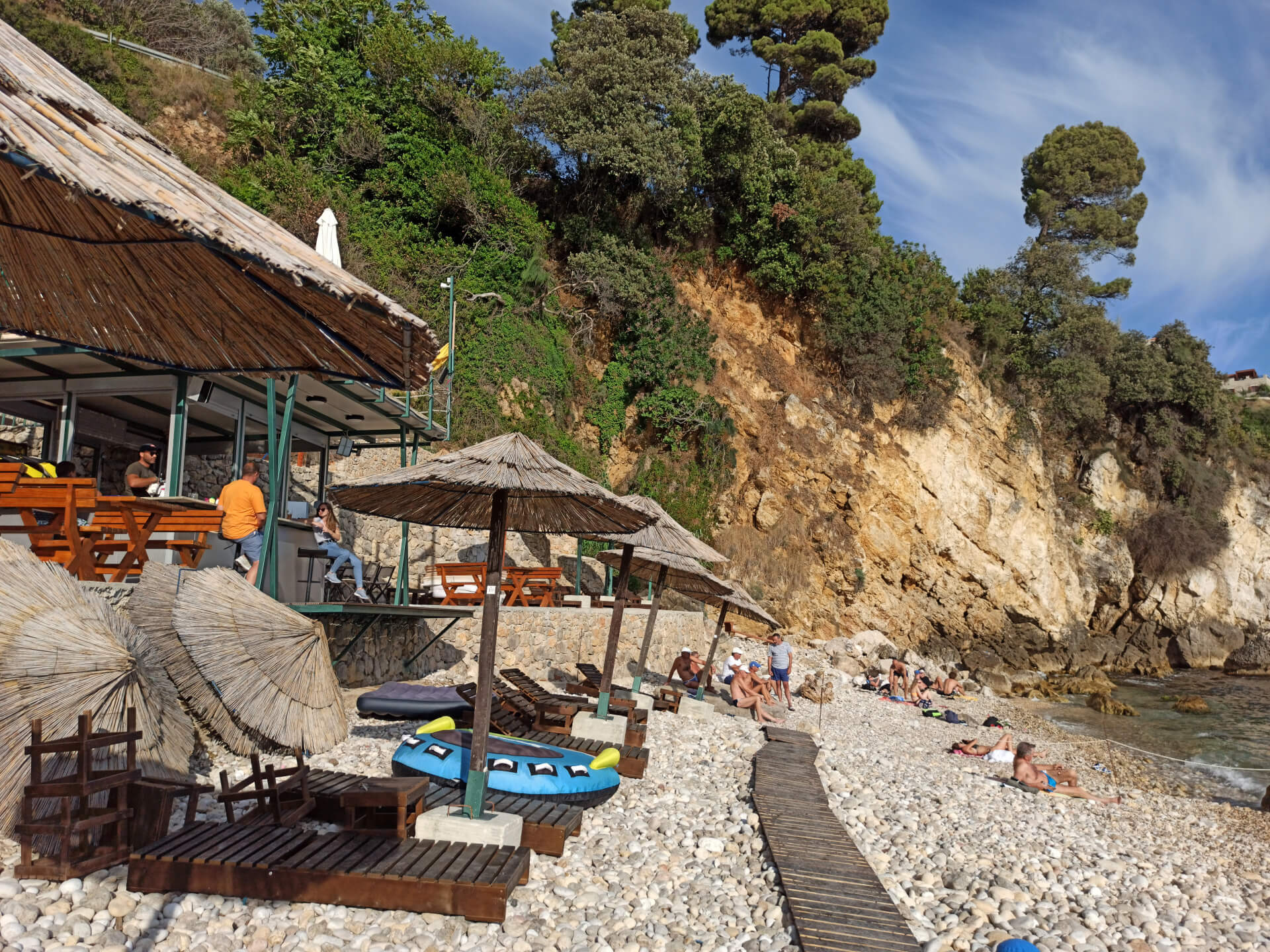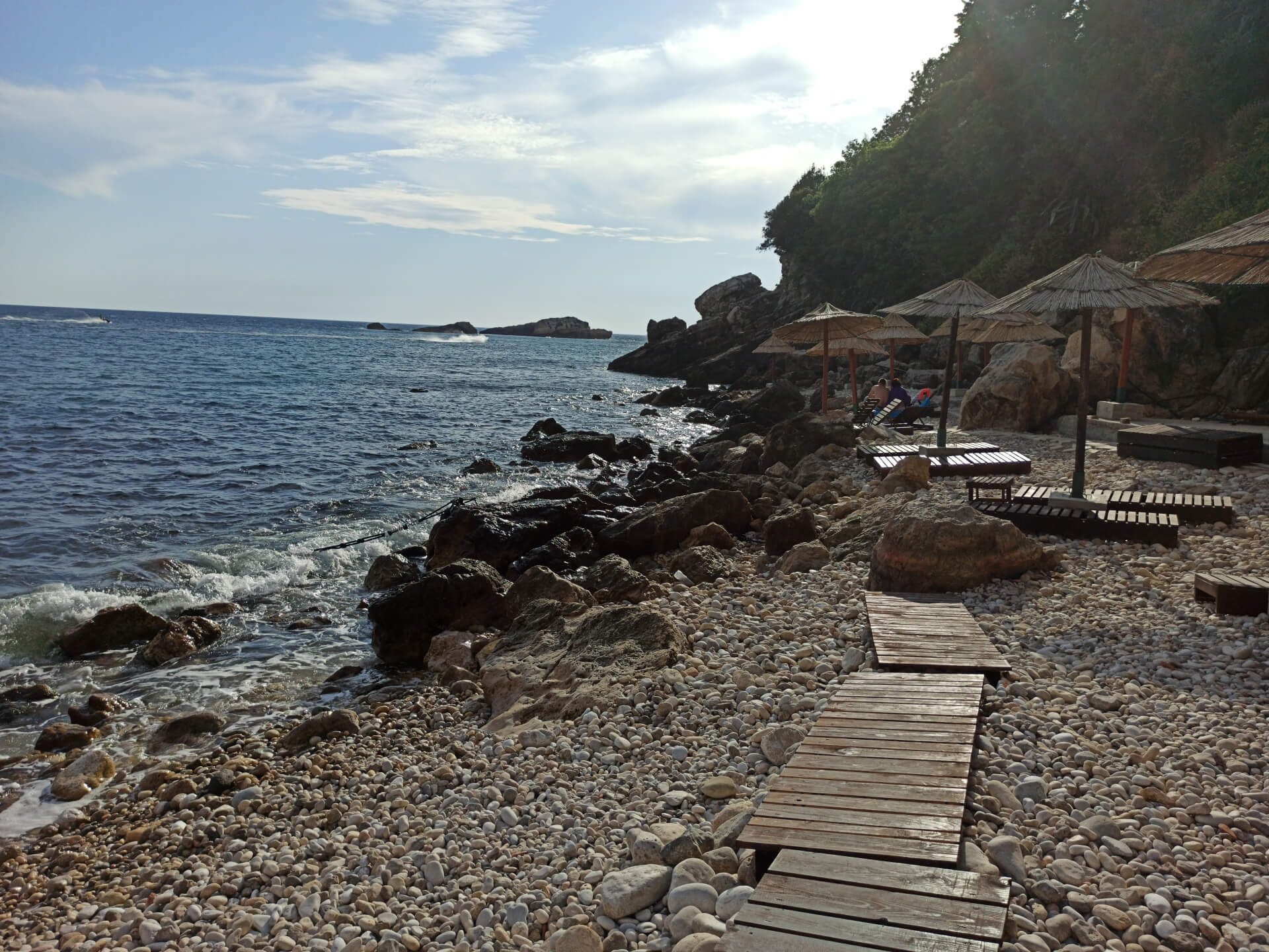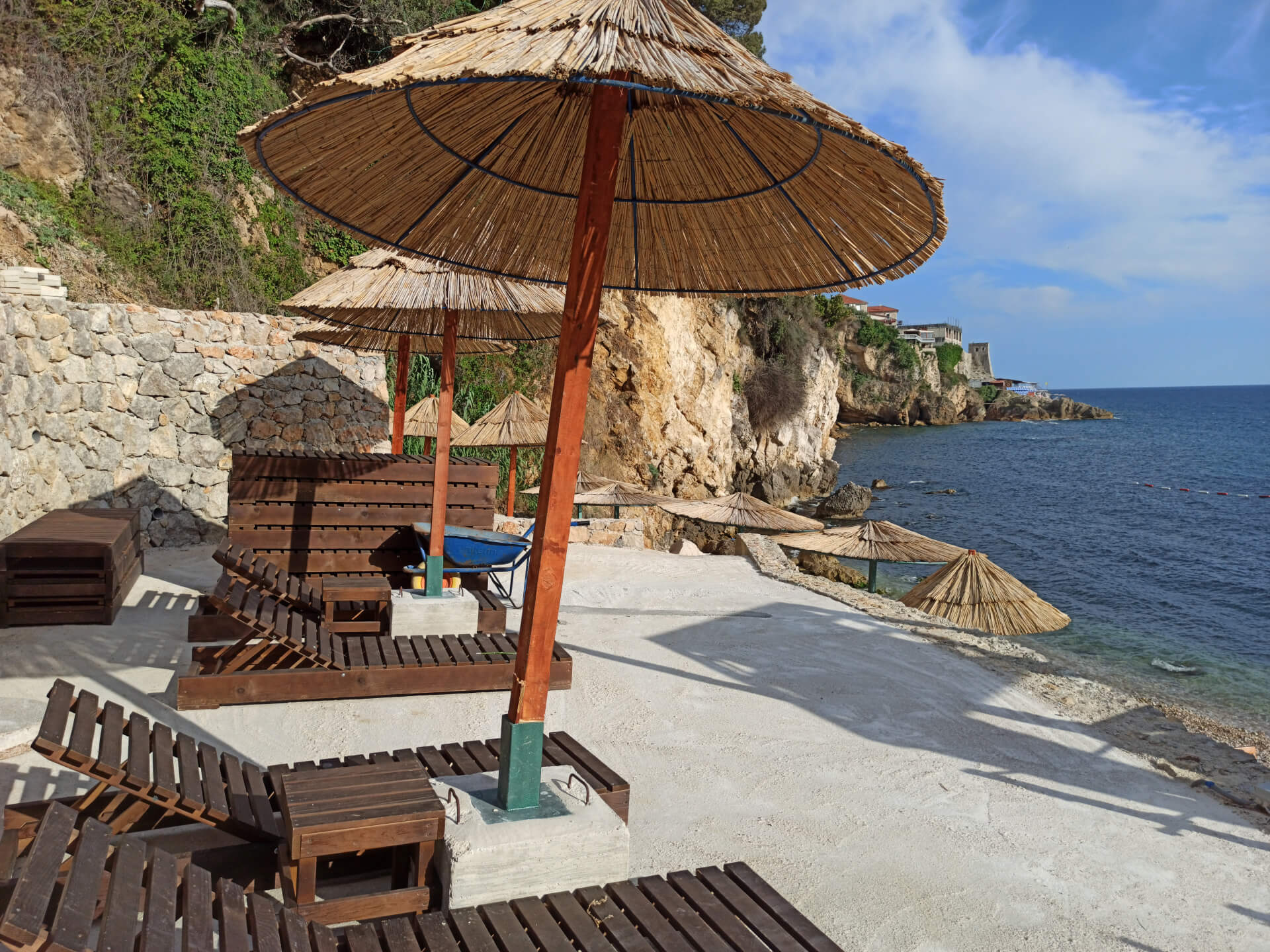 There are sunbeds you can rent and even few closed ones, with curtains. The beach is good for swimming and snorkeling. Since it's a stony beach, the water is very clear and clean there. The color of the water is fantastic and you can see it when you go down to the beach, watching it from the top. It's nice to observe it from the road first to find out if there are many people or not.