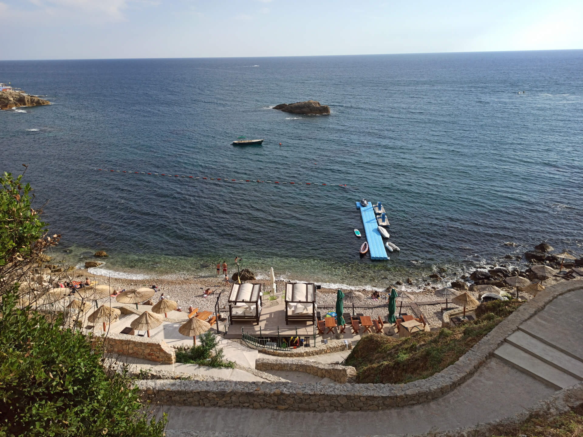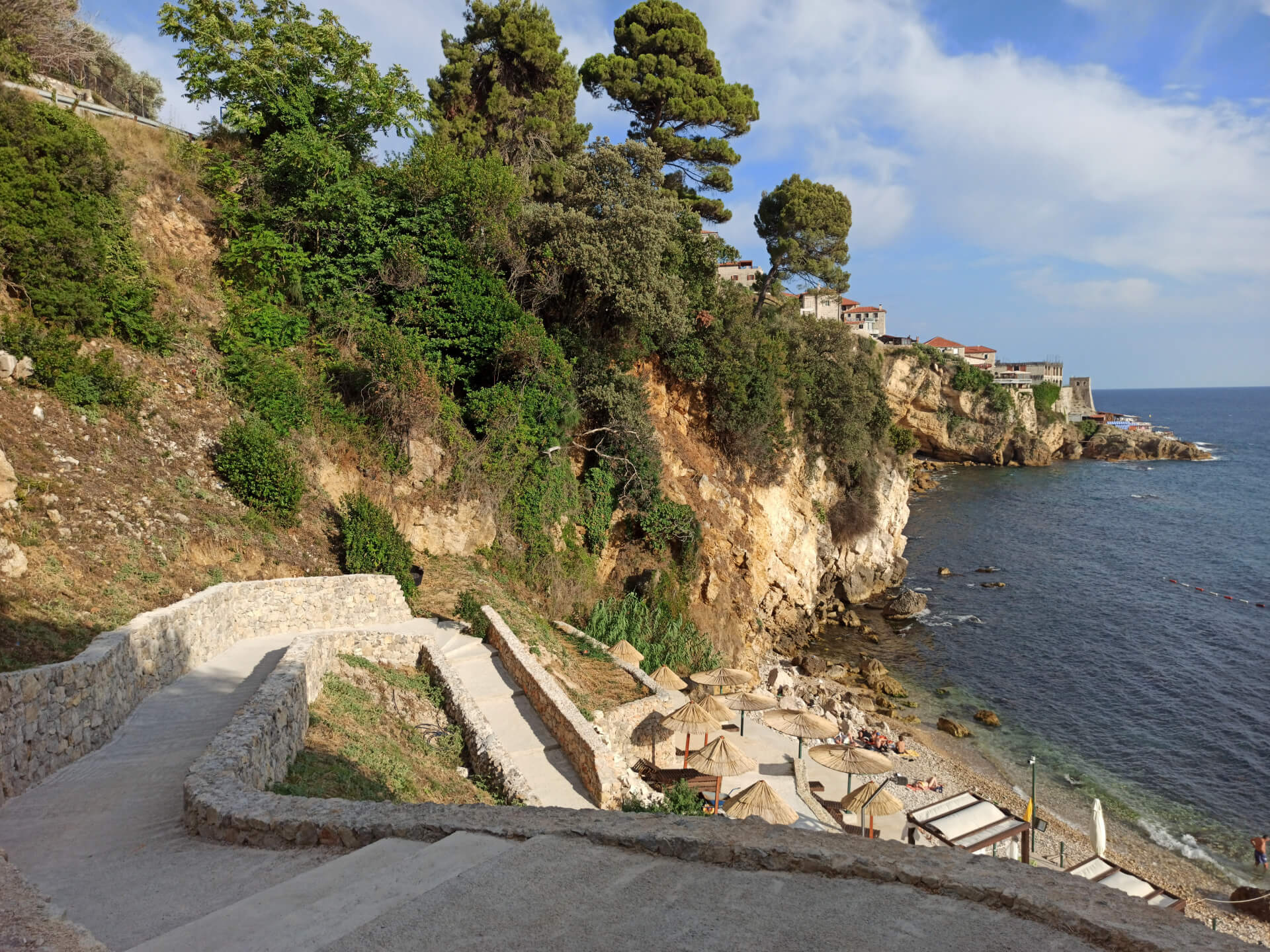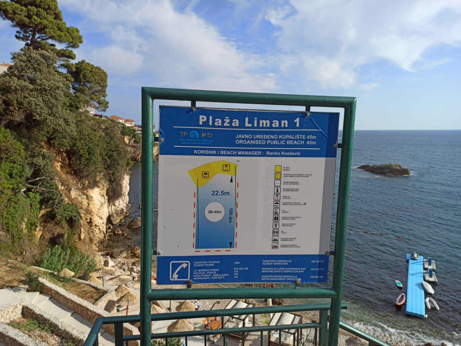 Liman 1 Beach is a small beach, located in Ulcinj near the old town. You go a bit up the mountain, passing by the cemetery, and you will see the sign - Liman 1 Beach. You climb down to the beach by stony winding good road. The beach is pretty small, surrounded by mountains, located in a lovely small bay. The view is really beautiful. The beach is divide to two parts - free and paid one. There is a beach bar where you can buy drinks and some food.