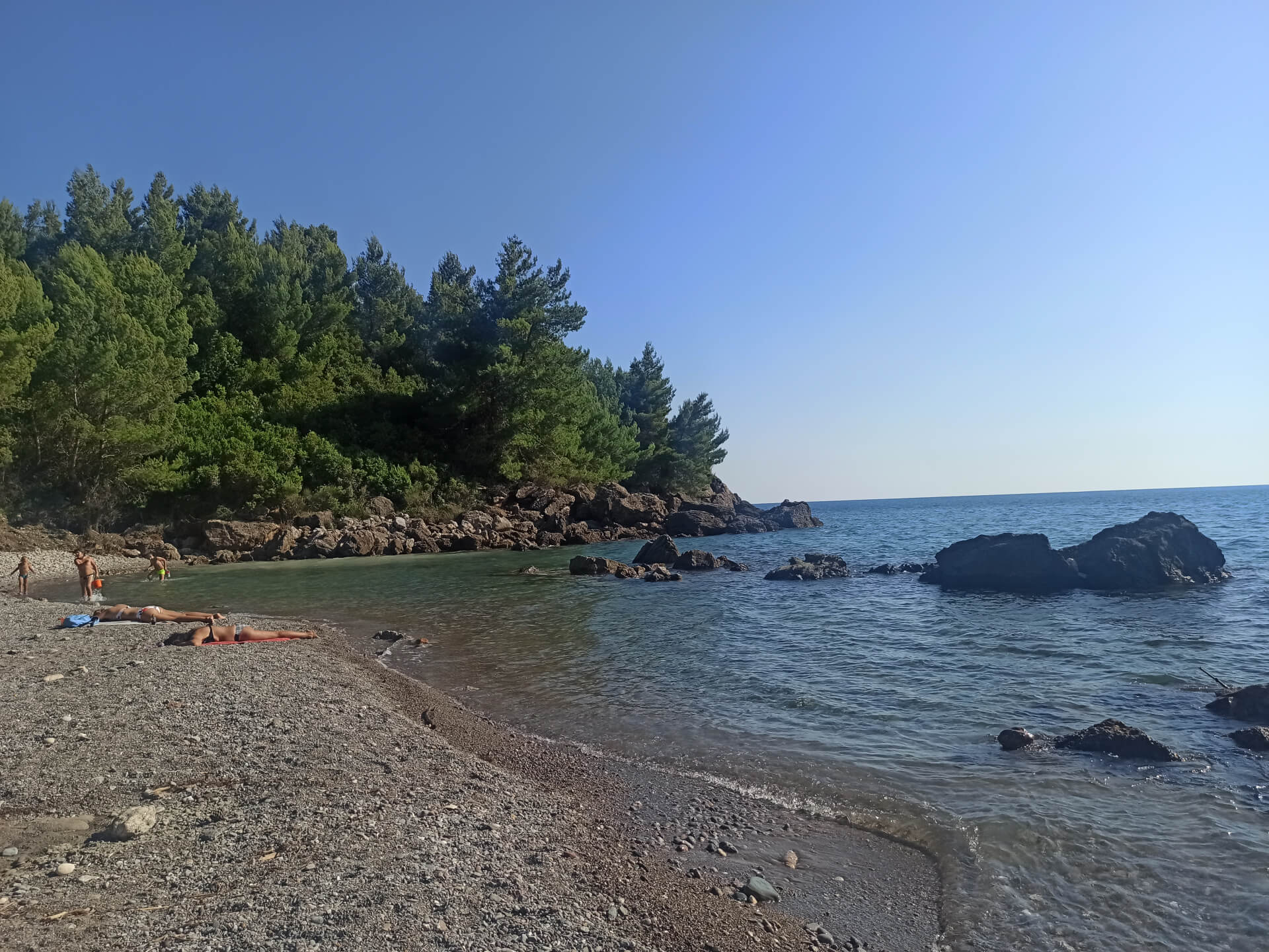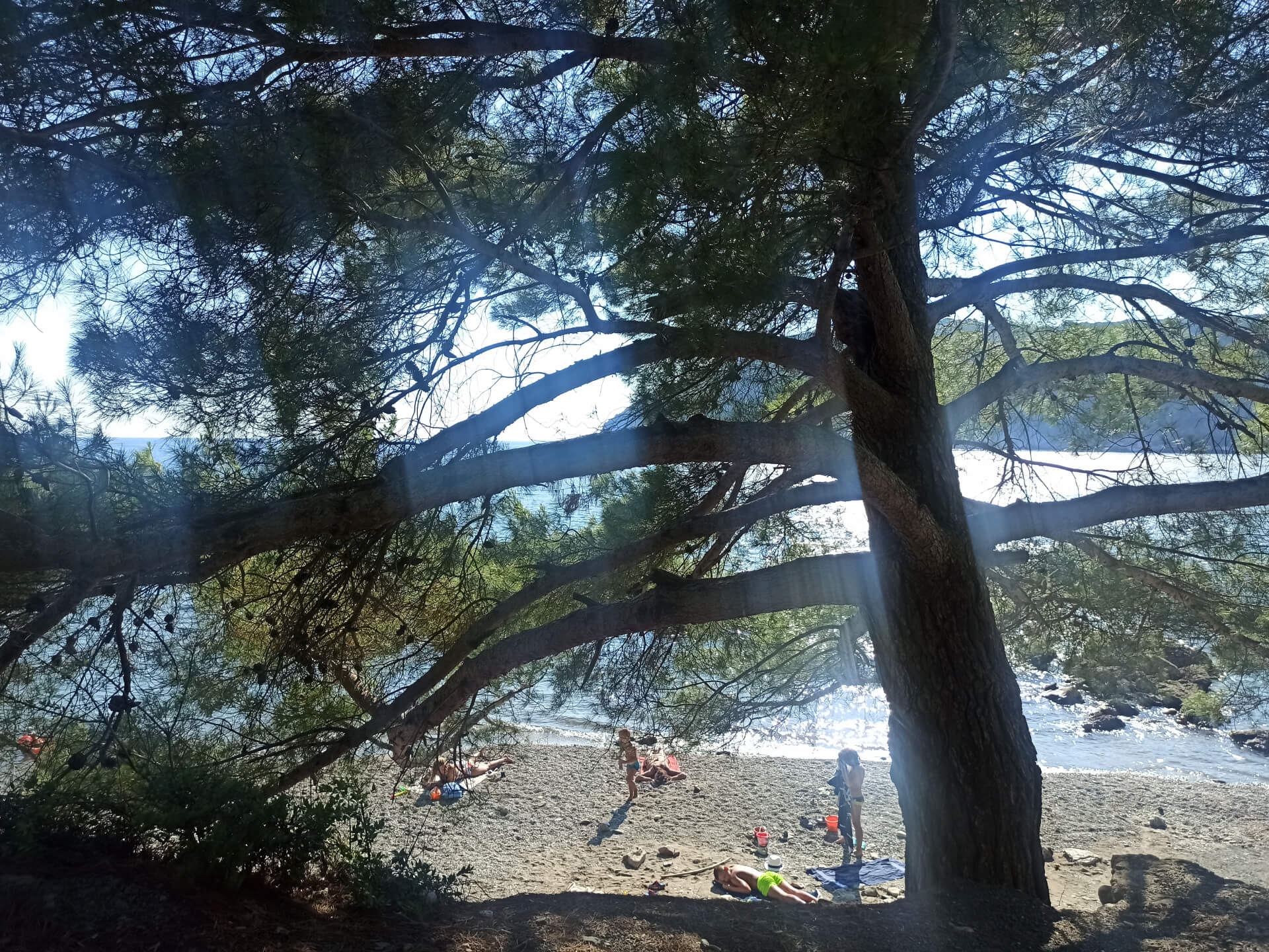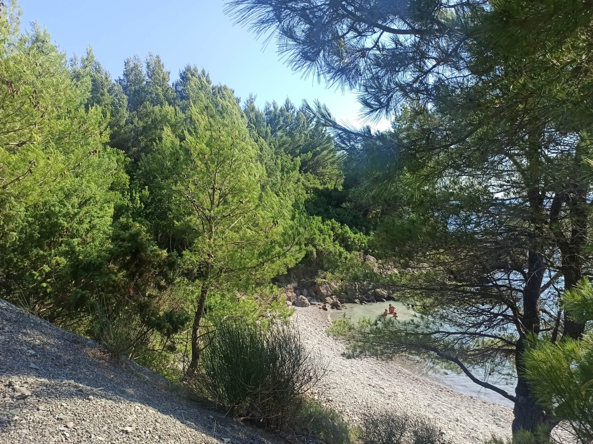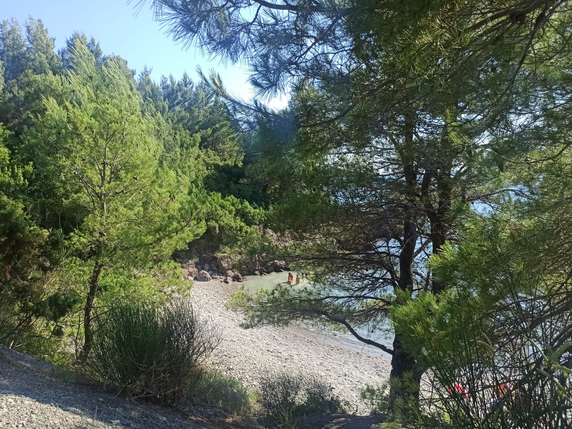 Walking through deep shadow of the forest is very refreshing at a hot summer day and balancing for nervous system. It's better to have swimming shoes swimming in the sea as the beach is rocky and there could be urchins. The beach itself isn't very big and not the most incredible - there is pebble and stones all around. But swimming and breathing fresh pine air is very healthy and inspiring. Because of its location there won't be any people even at a high season that's why it's a big adventure to escape from the crowds.