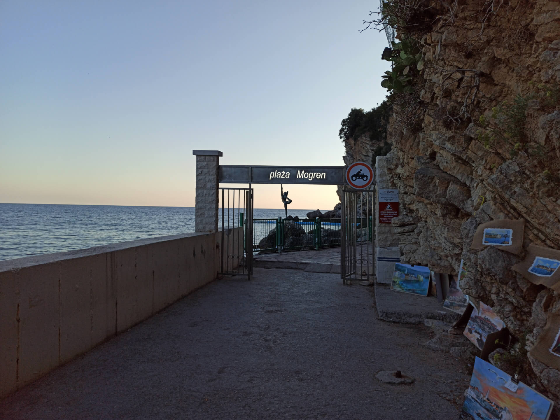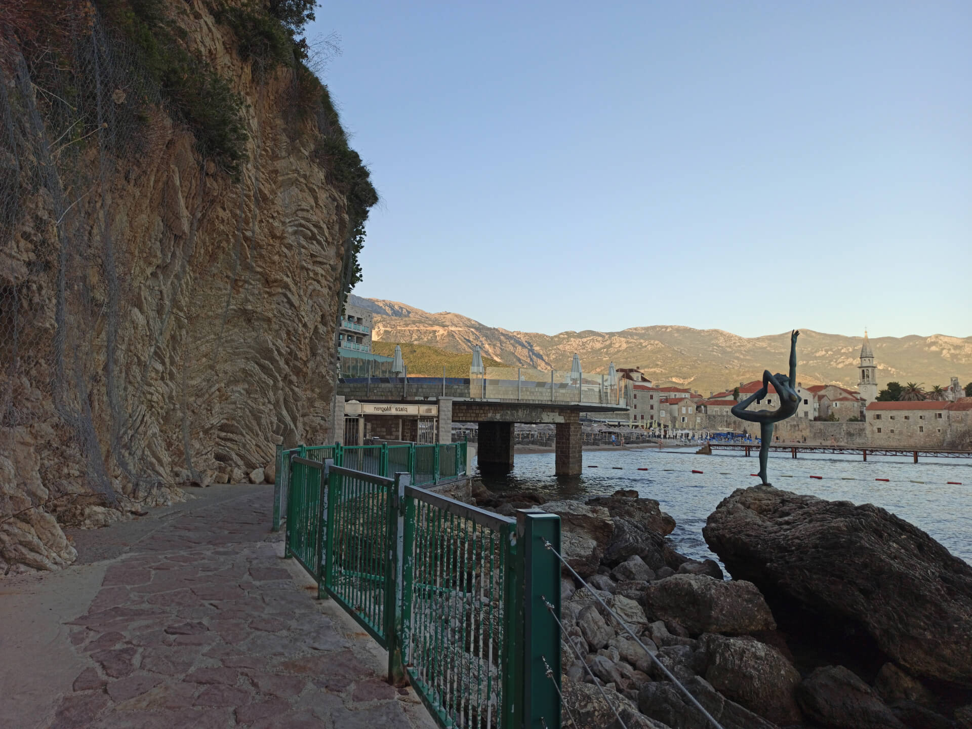 Mogren Beach is a very interesting and lovely beach. You can get there walking along the cliffs about 150meters from Old Town Budva. So the only way to get there - is but walk. On the road to that beach, you will see one of the most famous sights in Budva - Ballet Dancer Statue. The statue is located on the stone in front of Old Town Budva and it's perfect for fantastic photos. The road is only a very narrow but very nice one. So even tourists with kids and baby carriages can reach the beach.