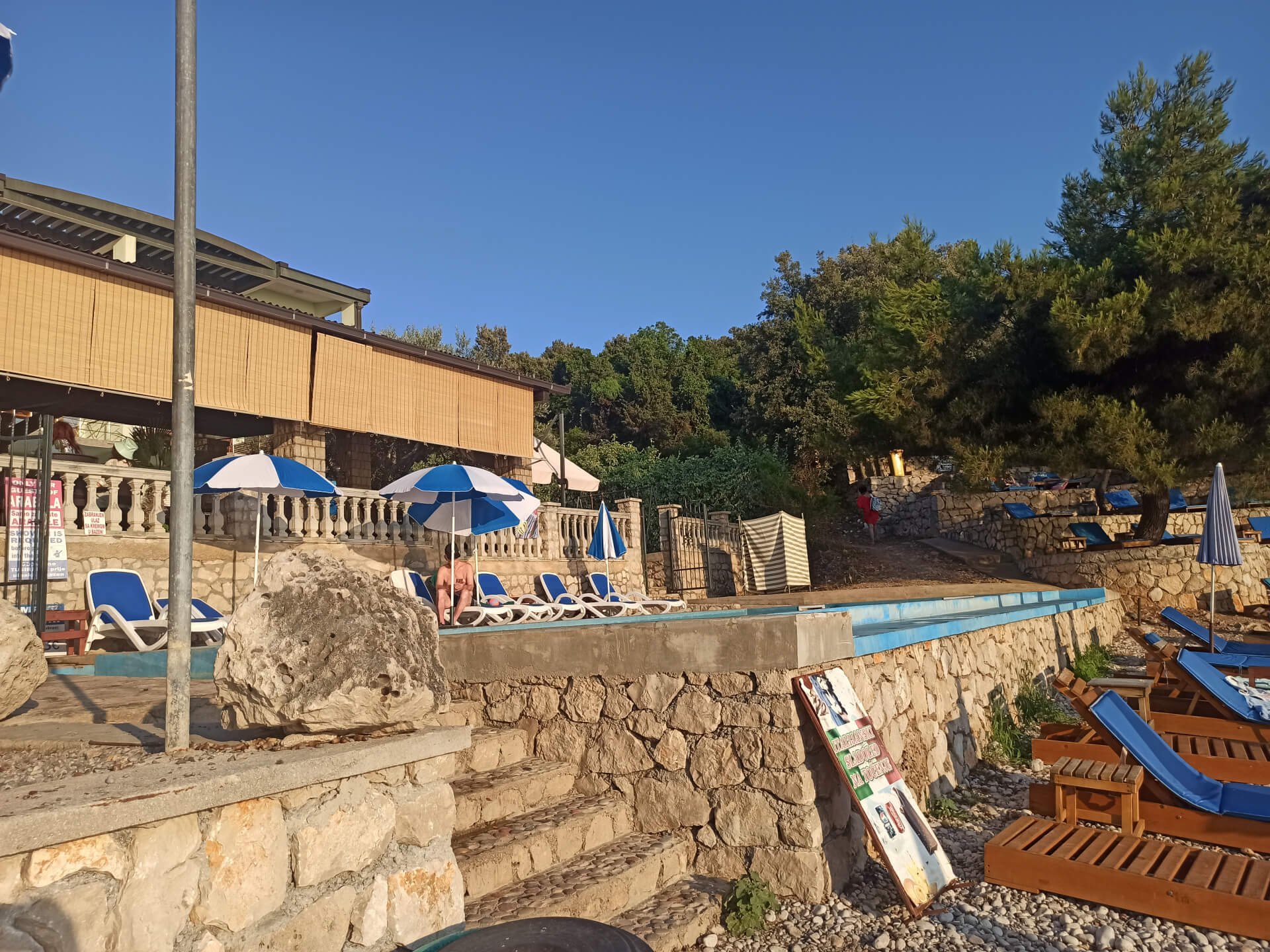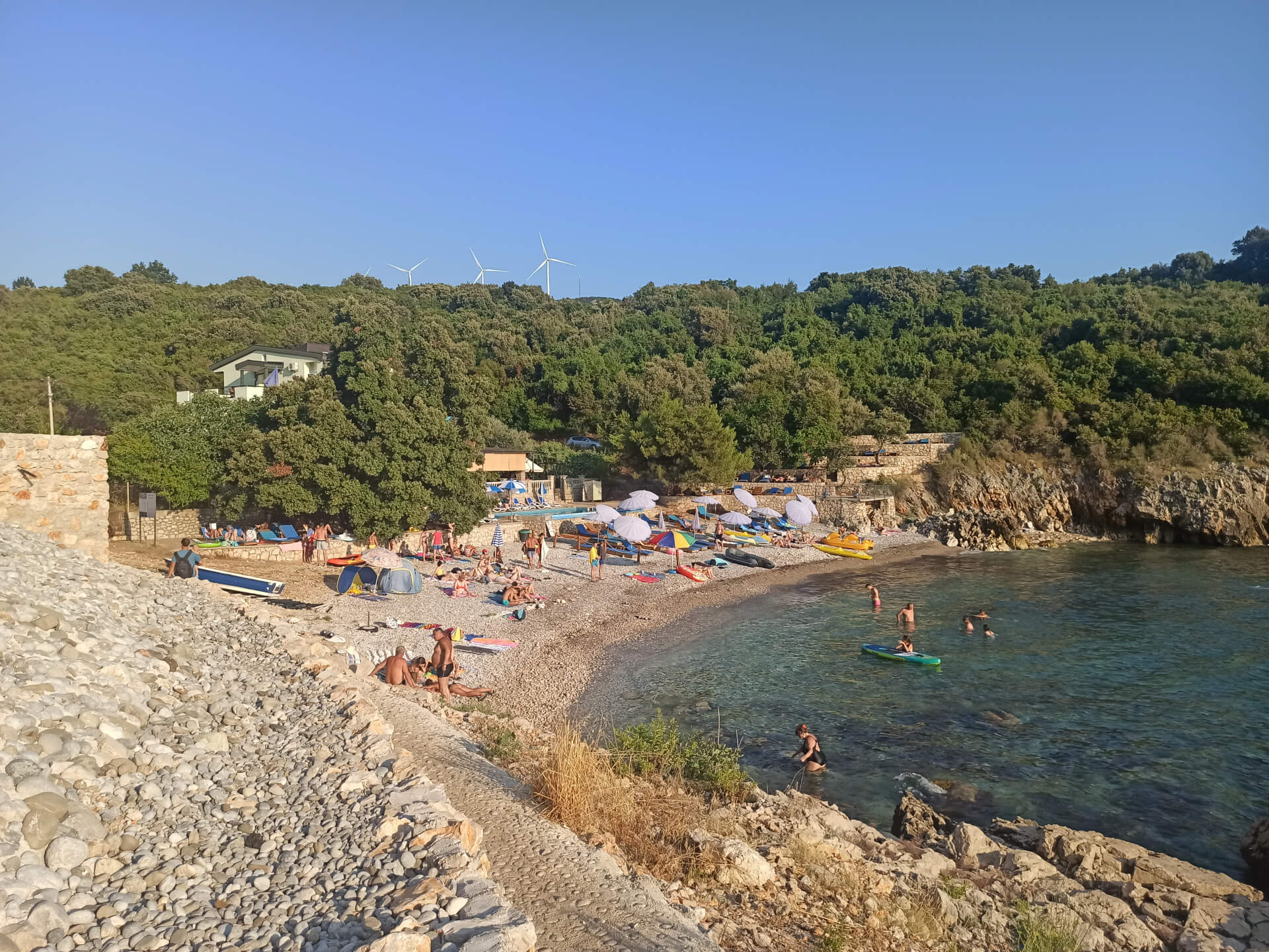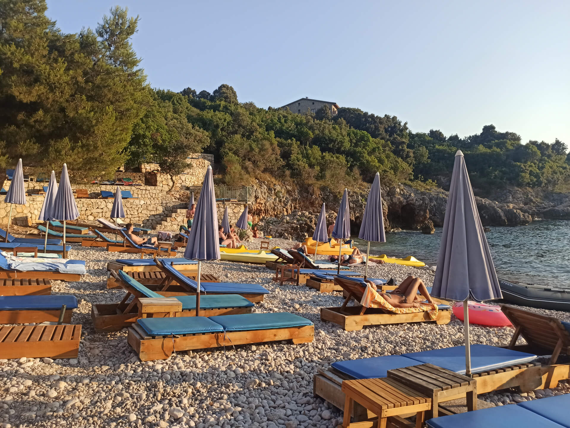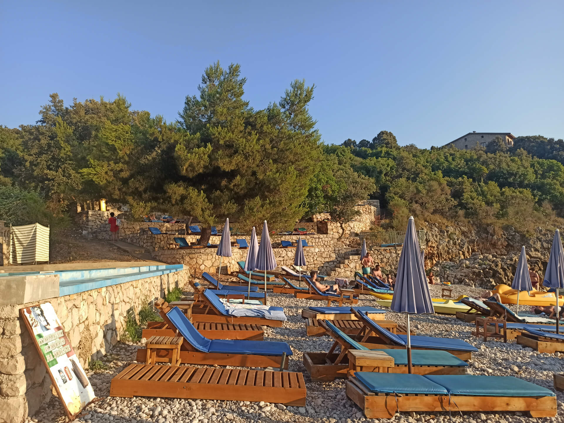 As all beaches in Montenegro at high season, according to the law, half beach is covered with paid umbrellas and sunbeds and the other half - for free touristic usage. There are also two concrete platforms from which you can jump into the water. And the other one is covered with beach equipment and you can rent sunbeds to rest in a natural shadow of the trees.