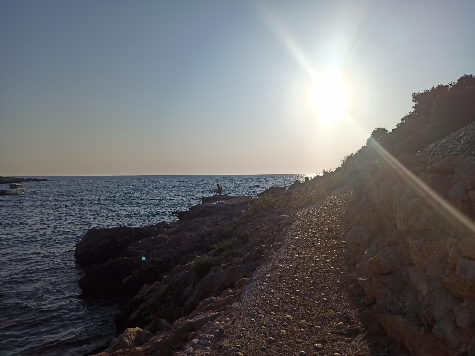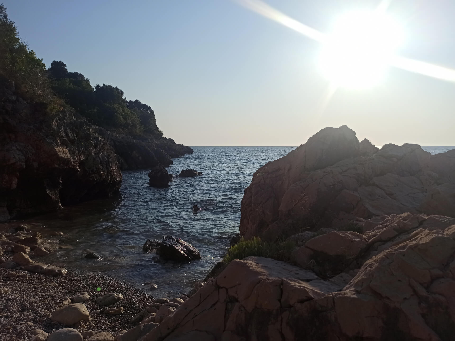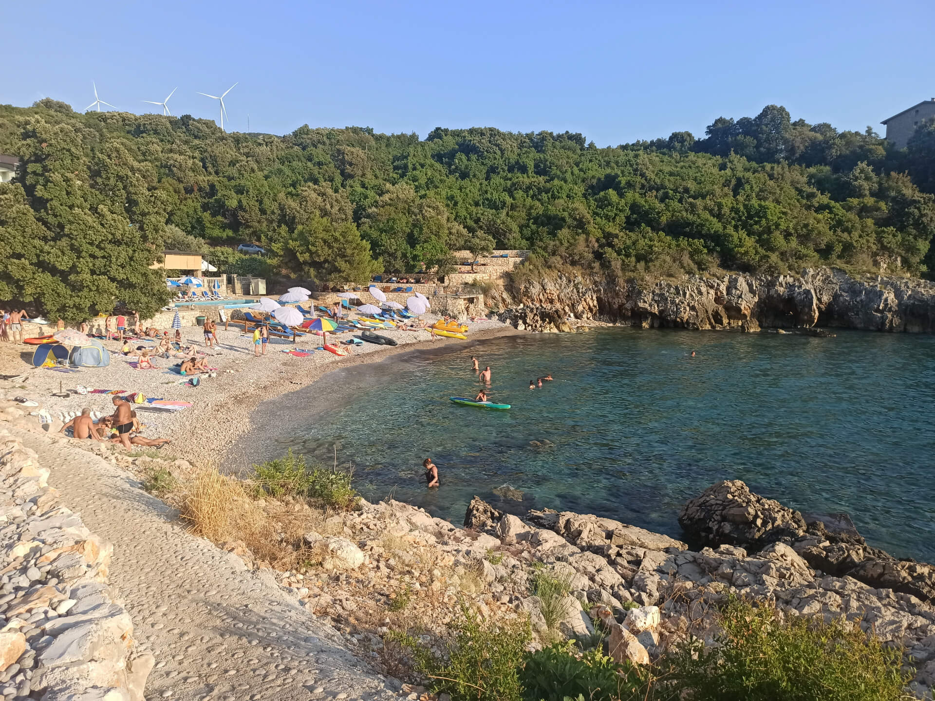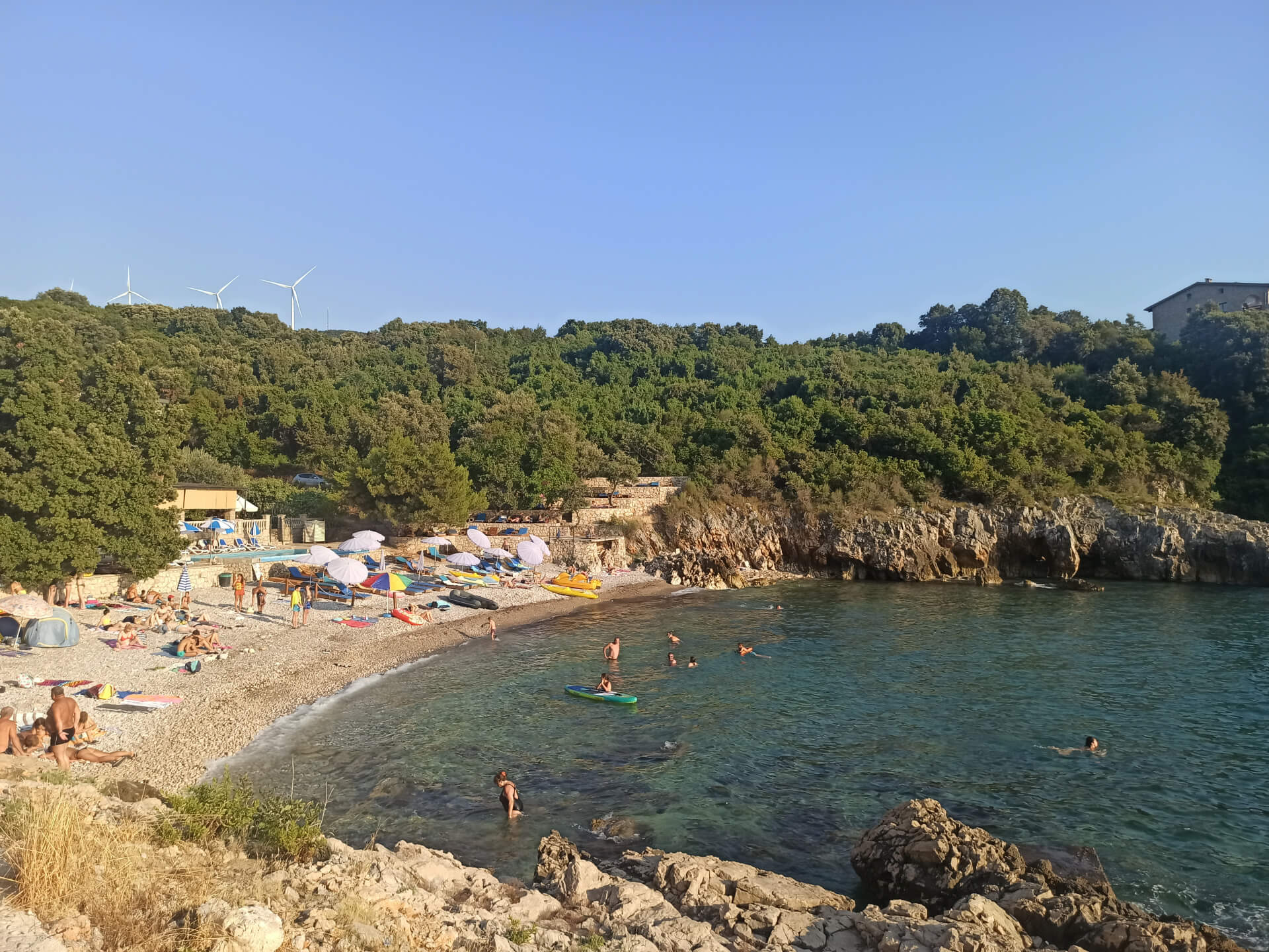 As all beaches in Montenegro at high season, according to the law, half beach is covered with paid umbrellas and sunbeds and the other half - for free touristic usage. There are also two concrete platforms from which you can jump into the water. And the other one is covered with beach equipment and you can rent sunbeds to rest in a natural shadow of the trees.
