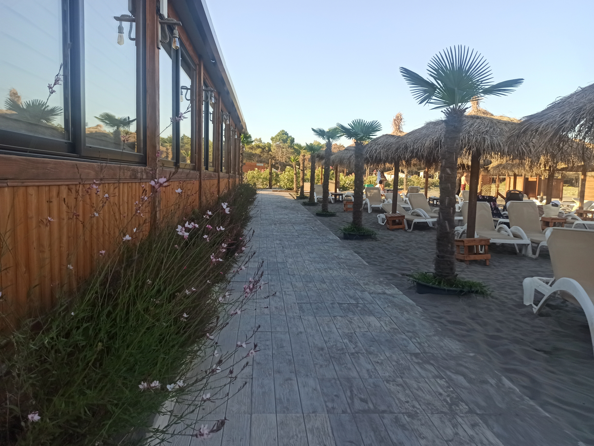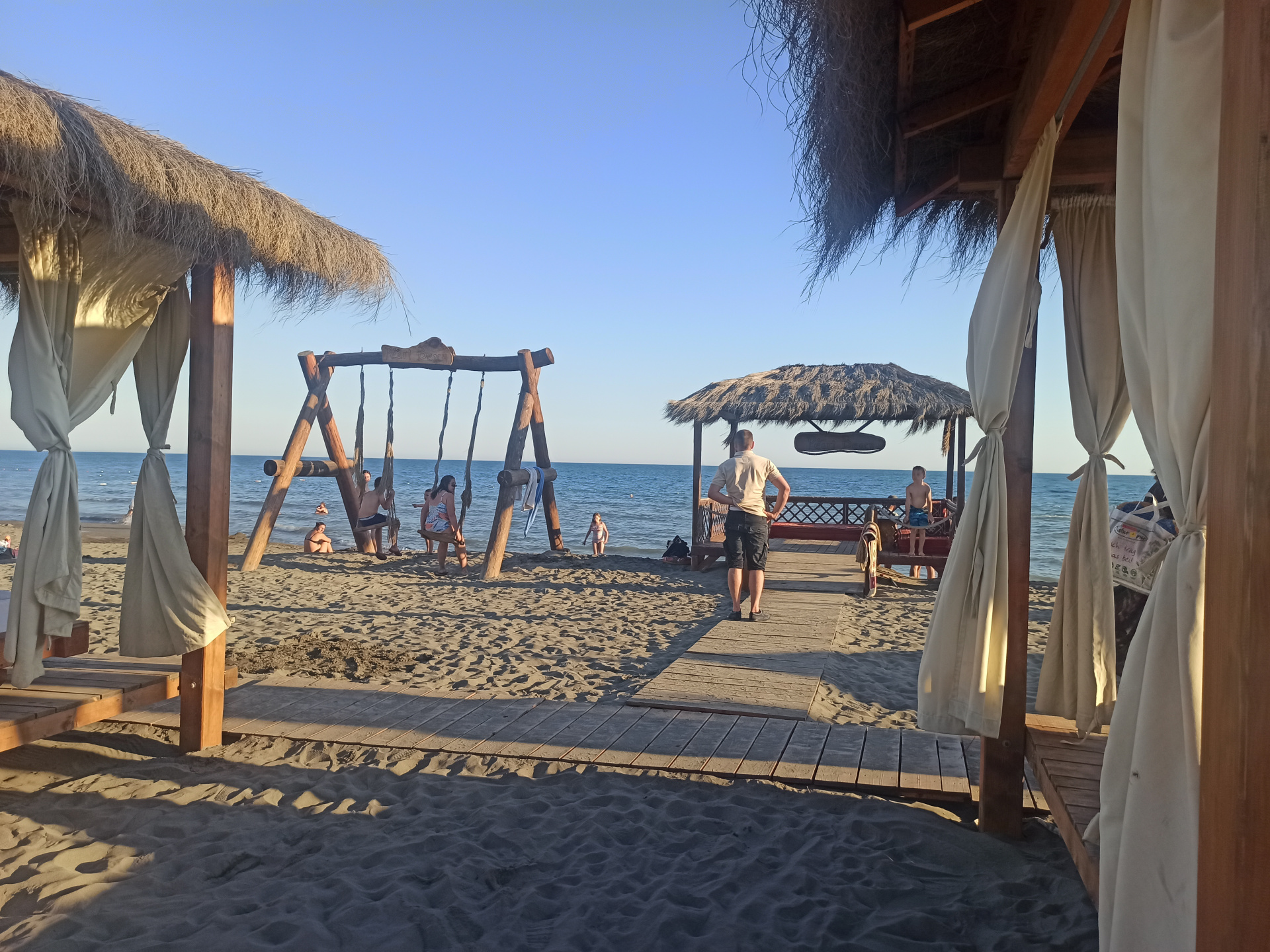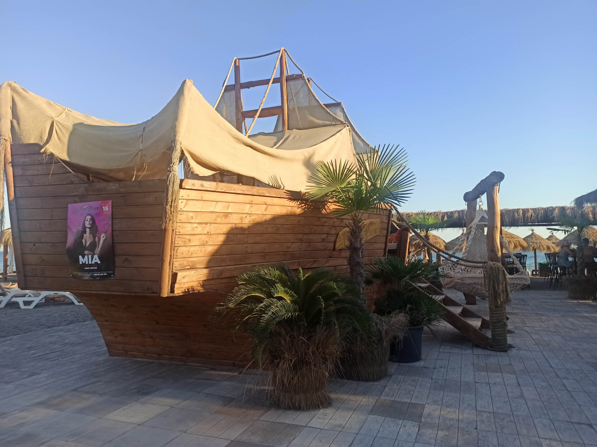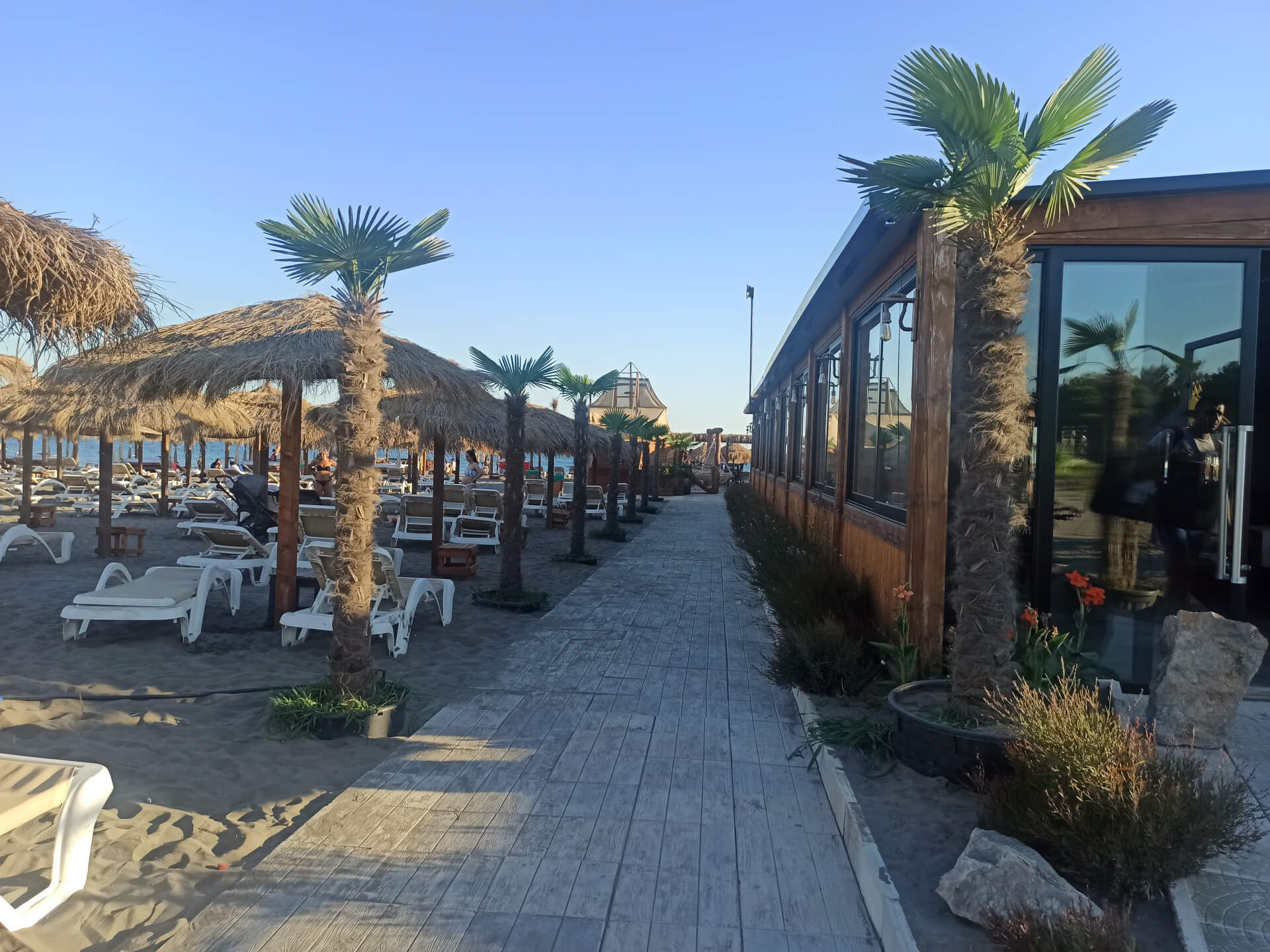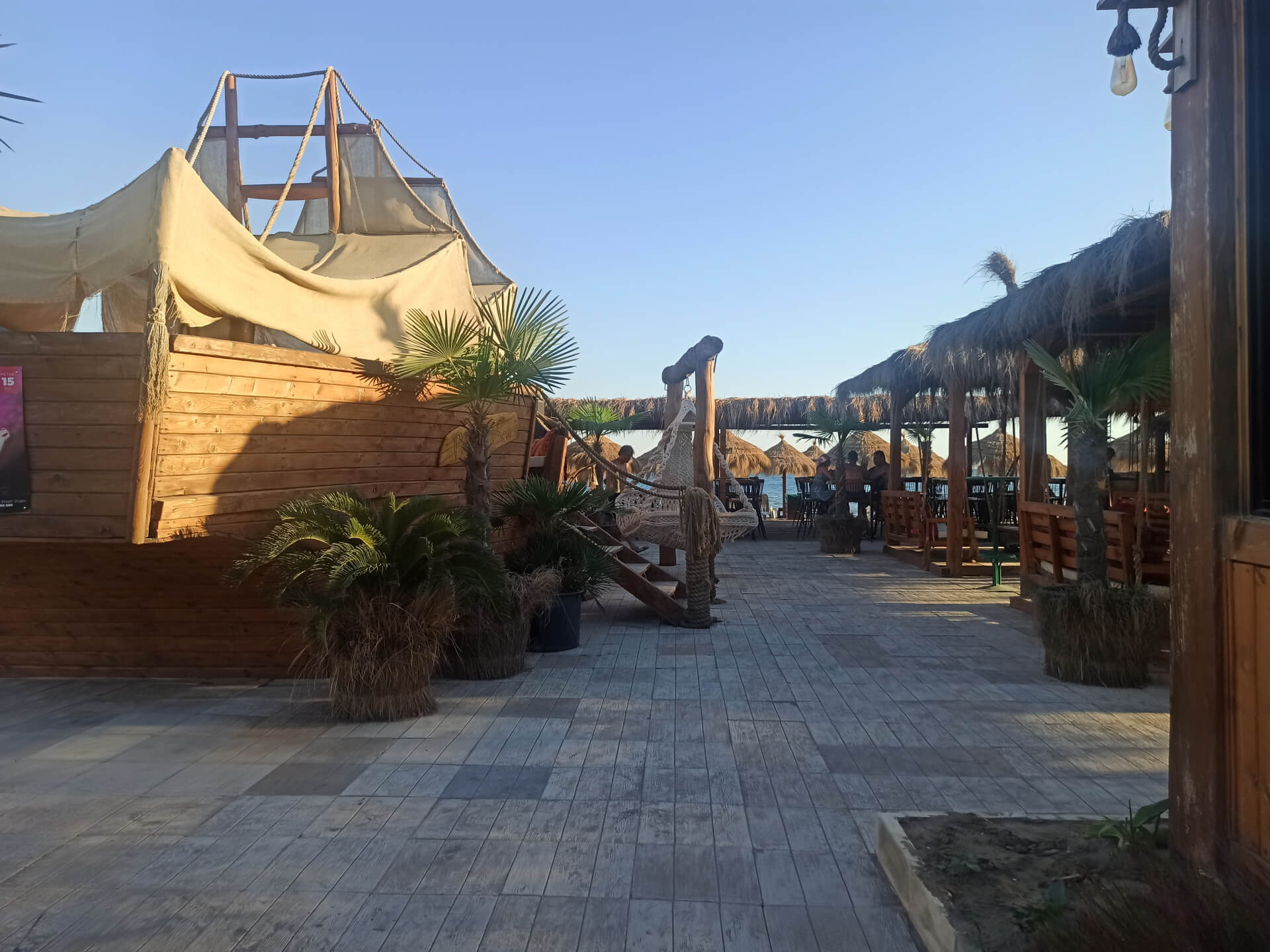 The beach has unique ships at the entrance to the beach for cars and the other one at the beach next to the bar. They make the beach look unique and wonderful. As other beaches there is a wonderful playground for kids. Of course, beach has showers, toilets, changing rooms, big parking. The trail to the beach is decorated with beautiful natural flowers and cozy lights.