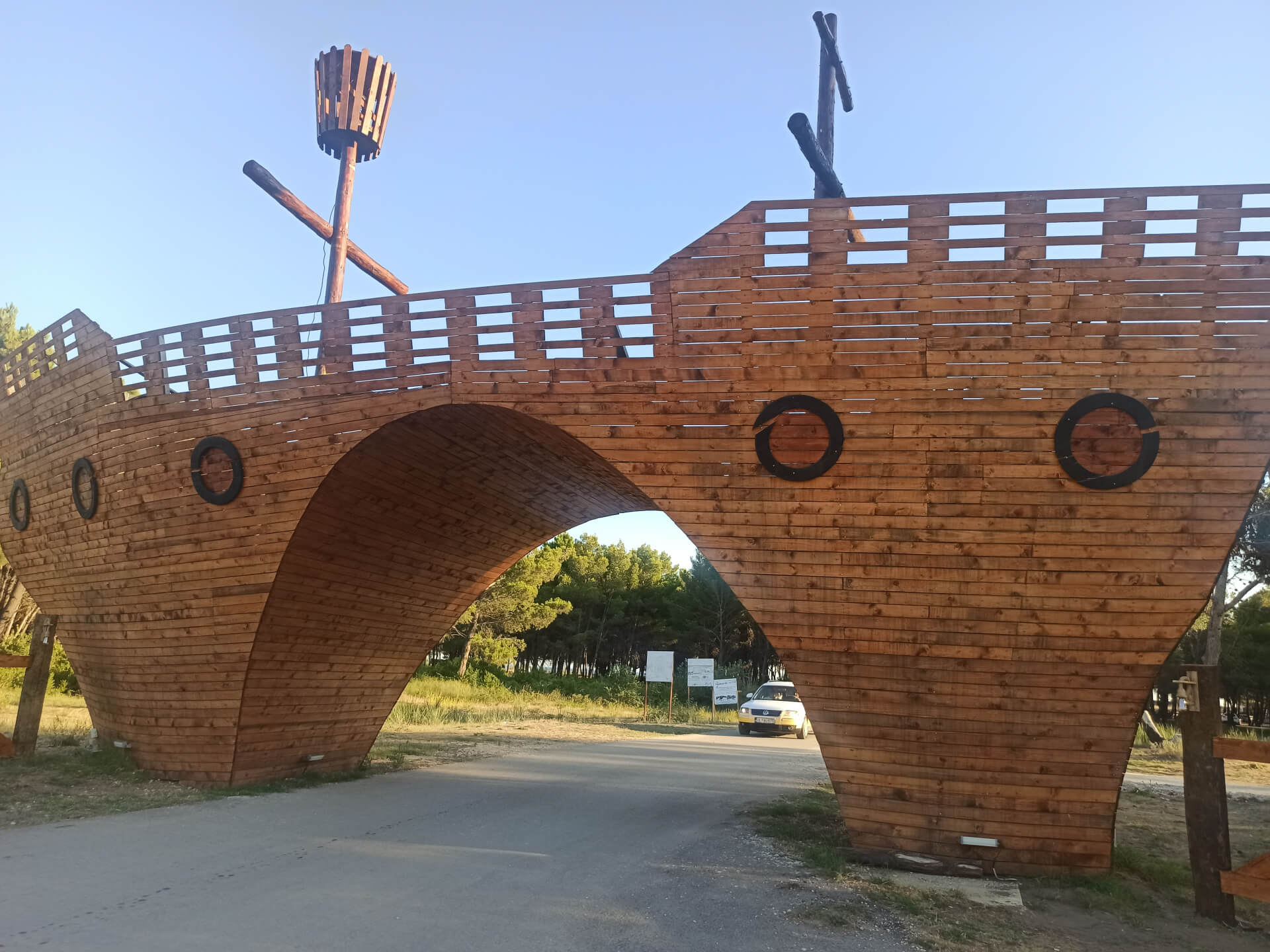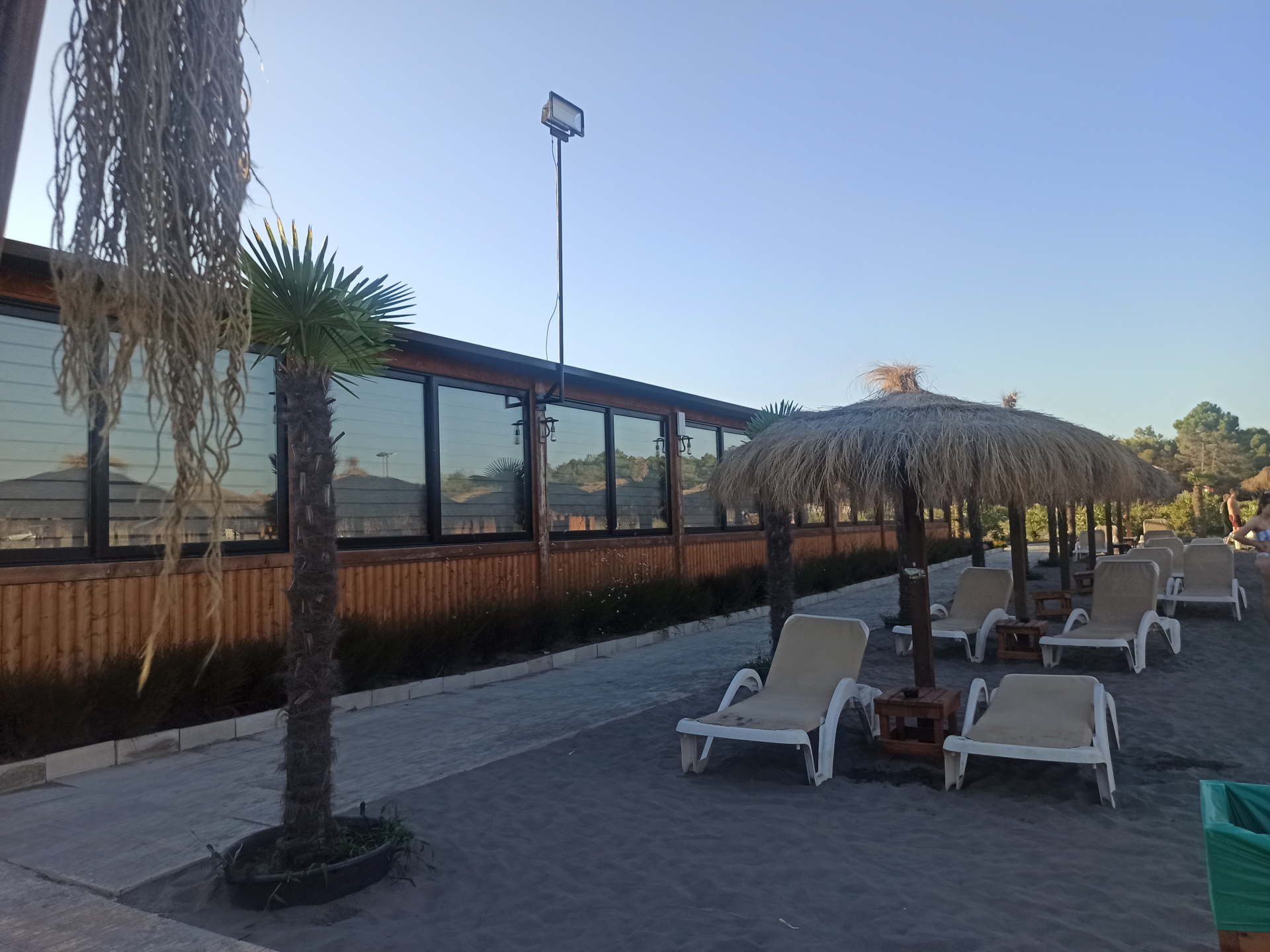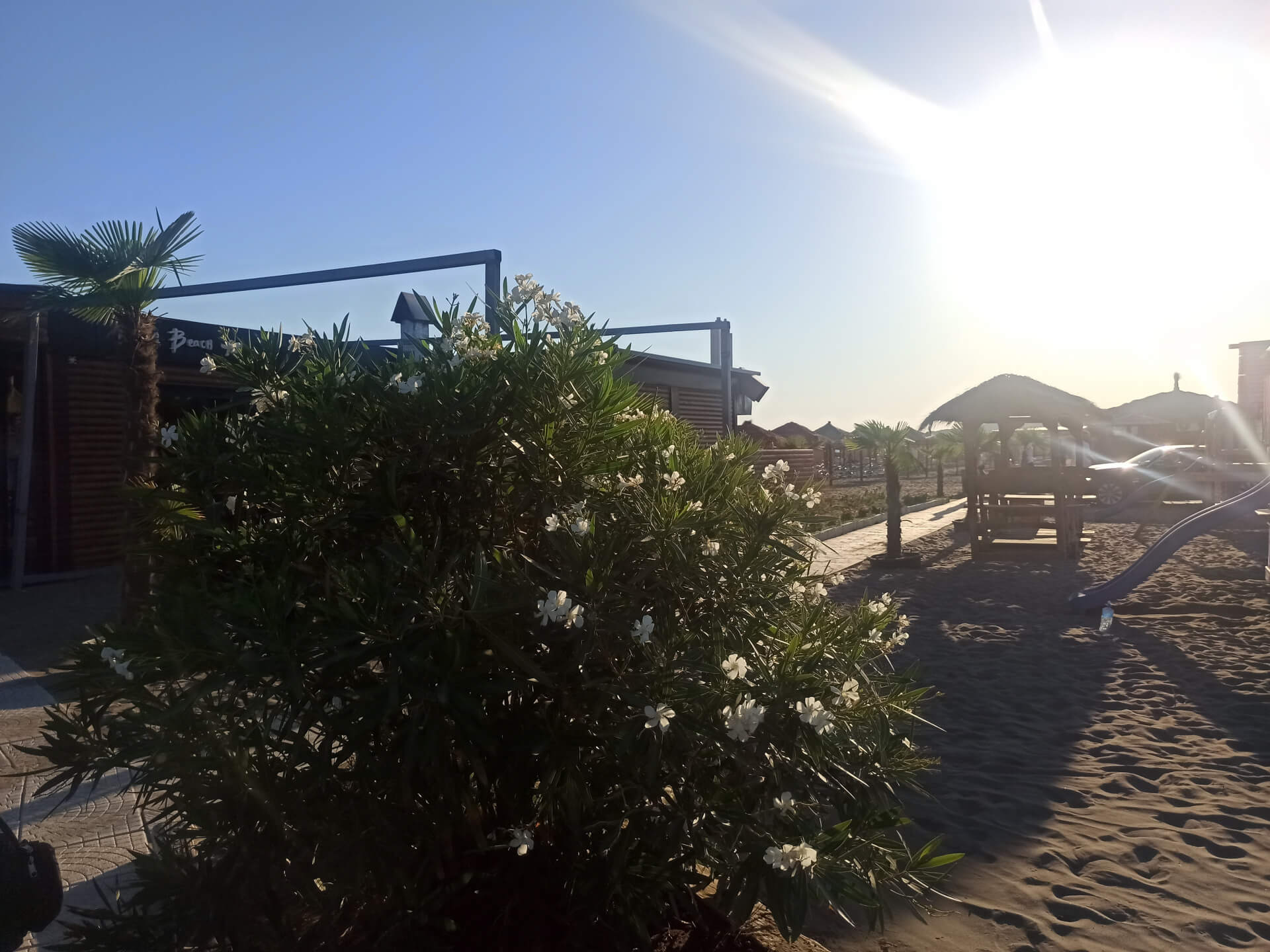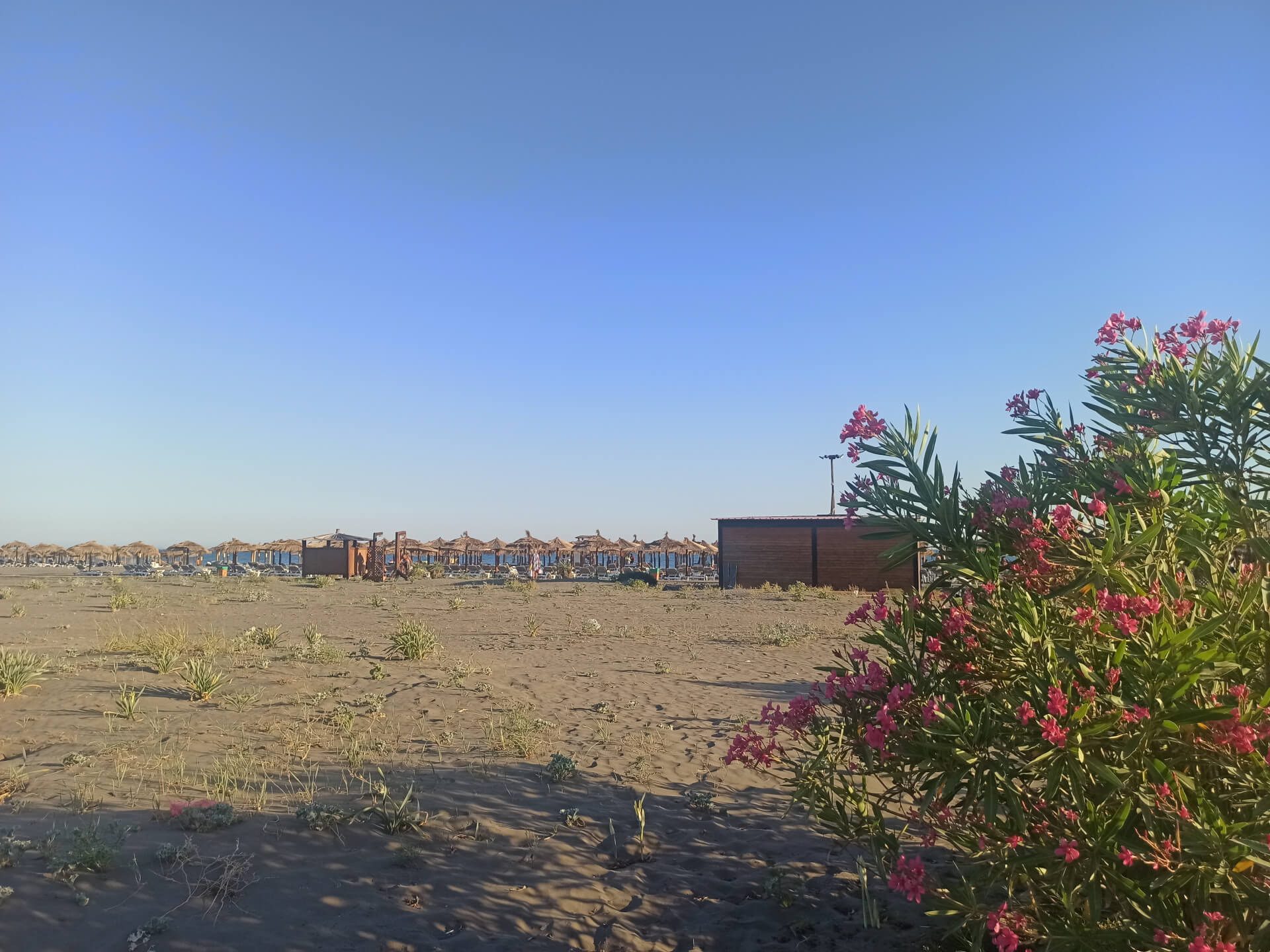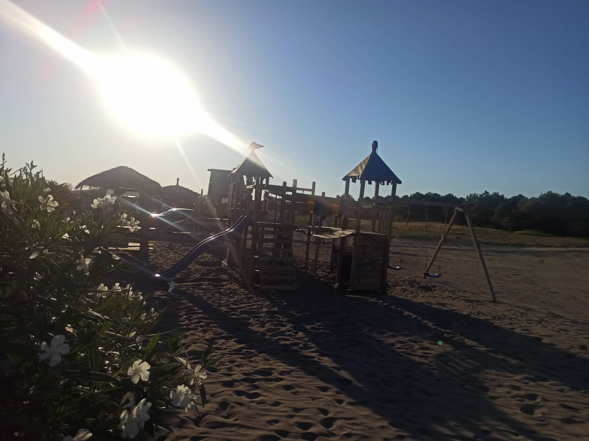 The beach has unique ships at the entrance to the beach for cars and the other one at the beach next to the bar. They make the beach look unique and wonderful. As other beaches there is a wonderful playground for kids. Of course, beach has showers, toilets, changing rooms, big parking. The trail to the beach is decorated with beautiful natural flowers and cozy lights.