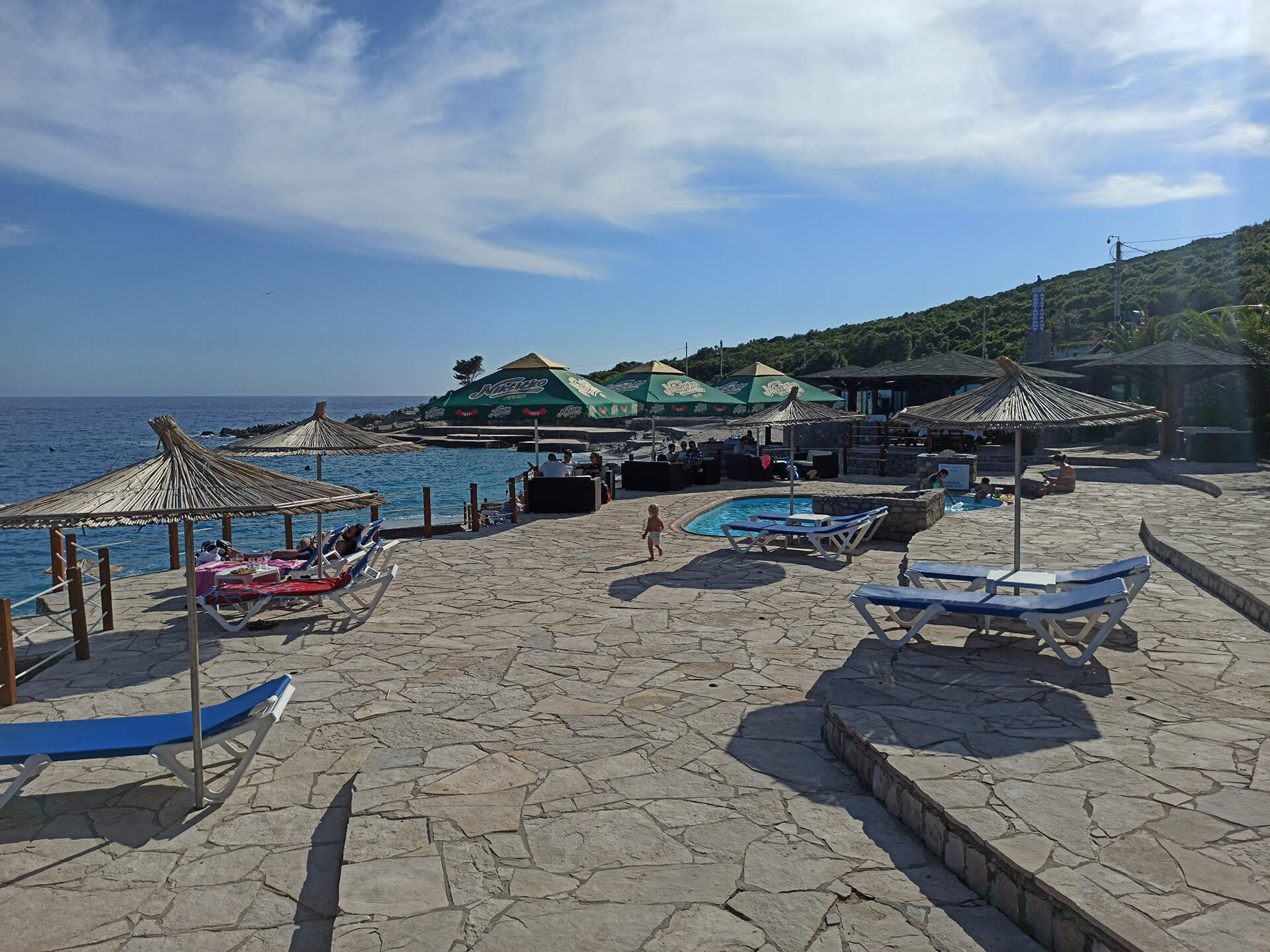 The beach bar-restaurant offers delicious local dishes and drinks, including fish meals at very good prices. There are a lot of sunbeds so you could spend time there and not burn in the summer heat. It's a perfect choice for different tourists including families with kids who definitely will find what to do there.