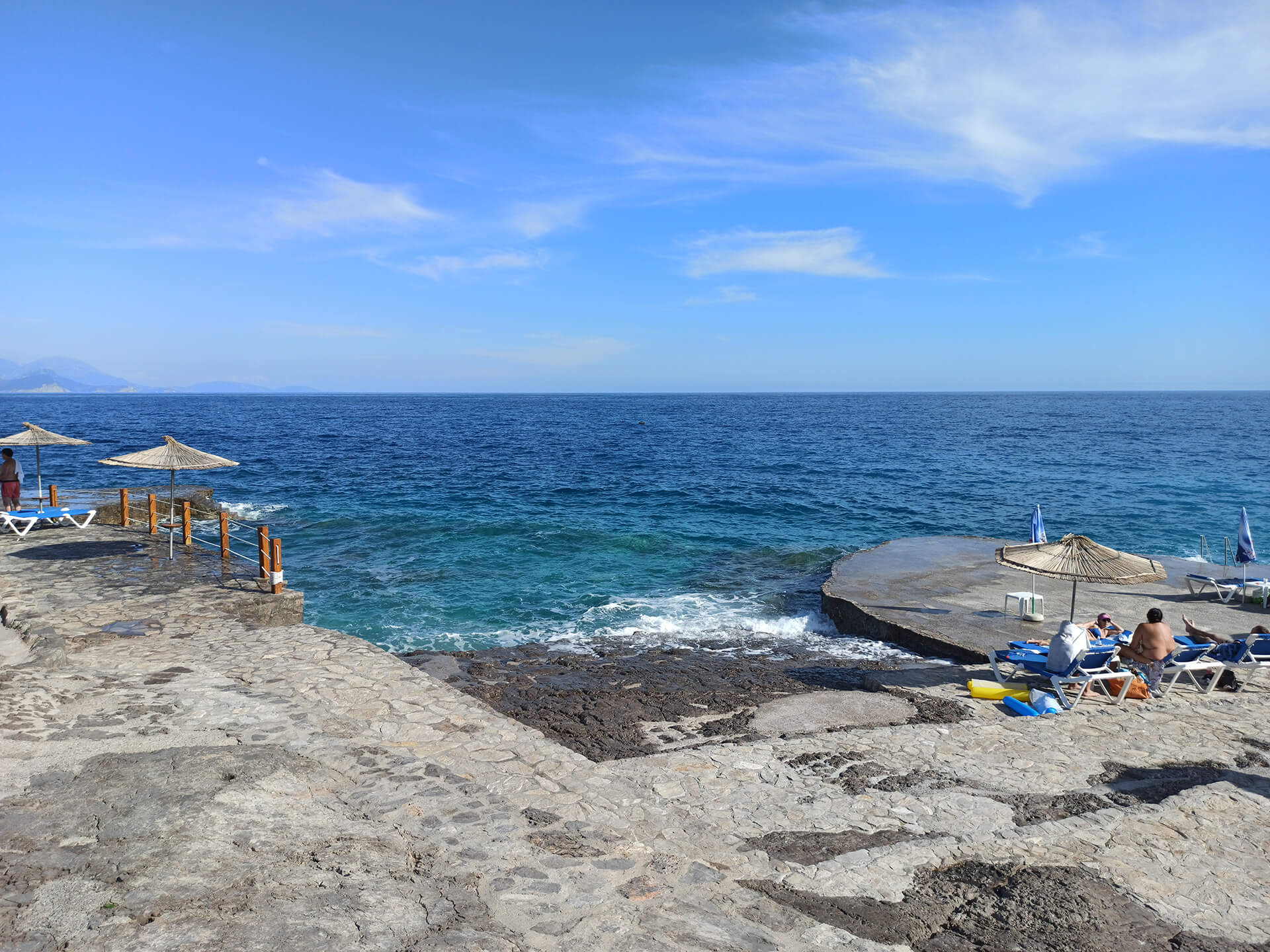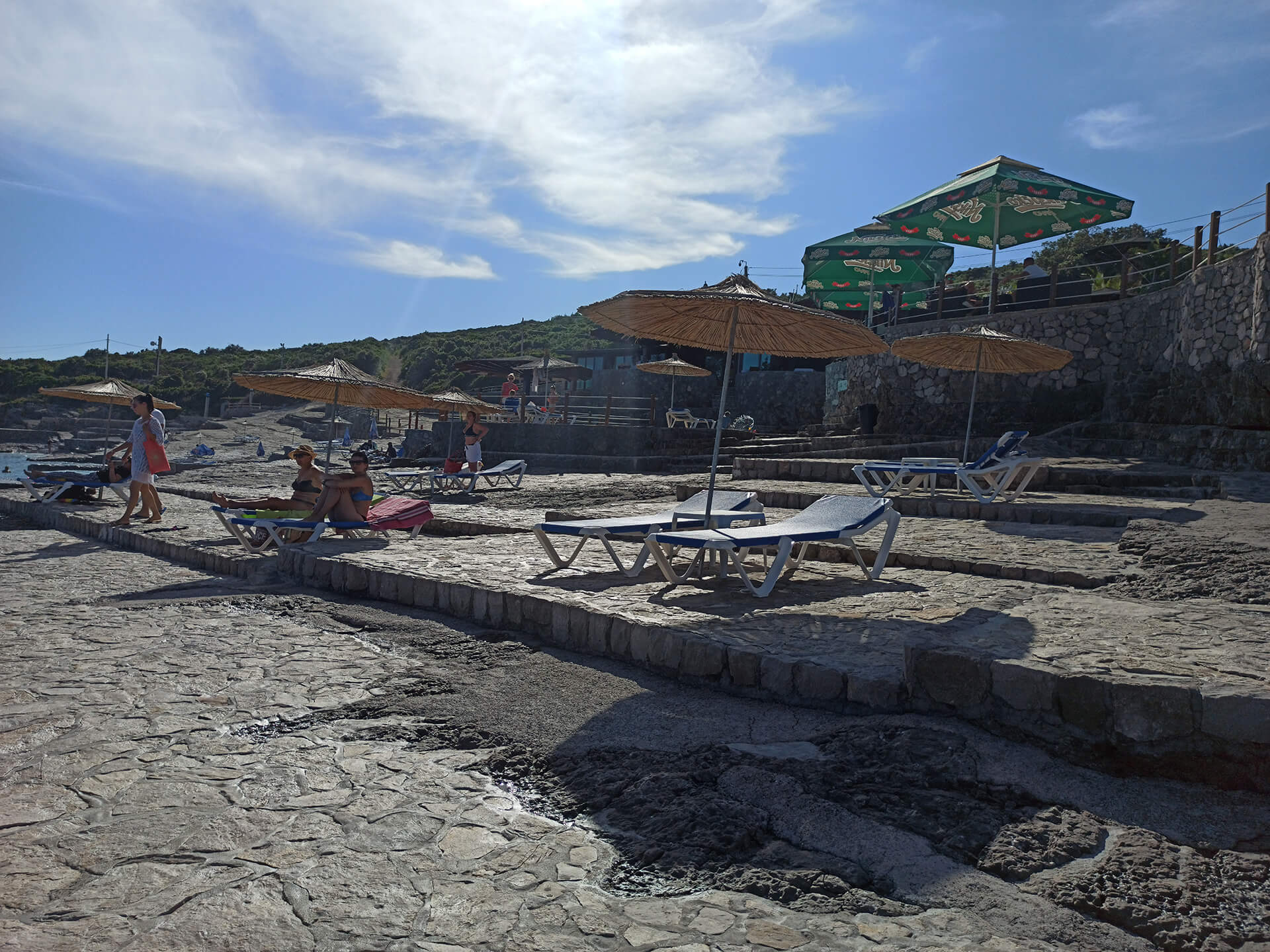 It's located in a picturesque place, surrounded by cliffs. The name of the beach means that there is a concrete surface everywhere so the entrance to the sea is also from concrete and there are stairs so you could go to the sea to swim.
