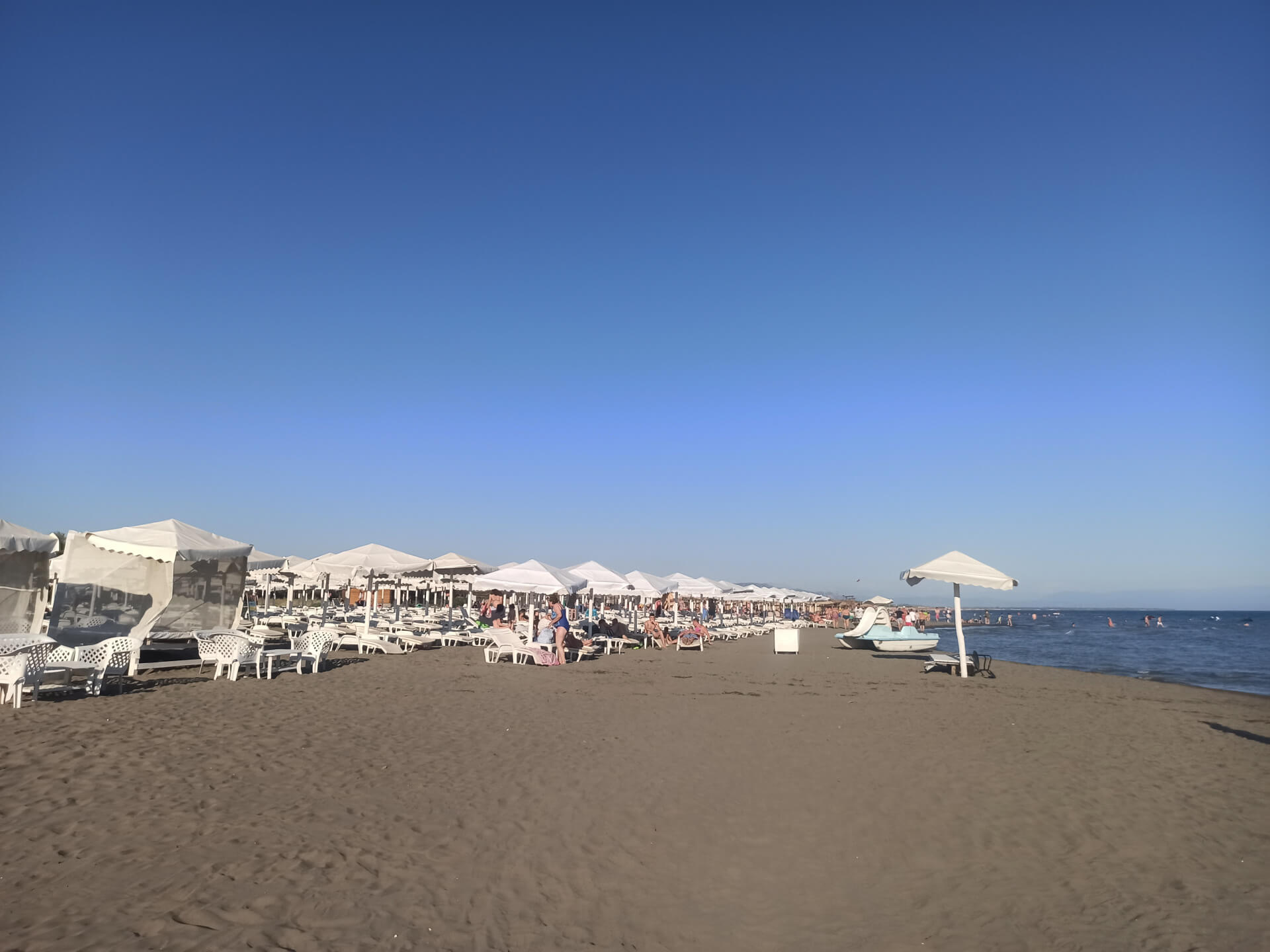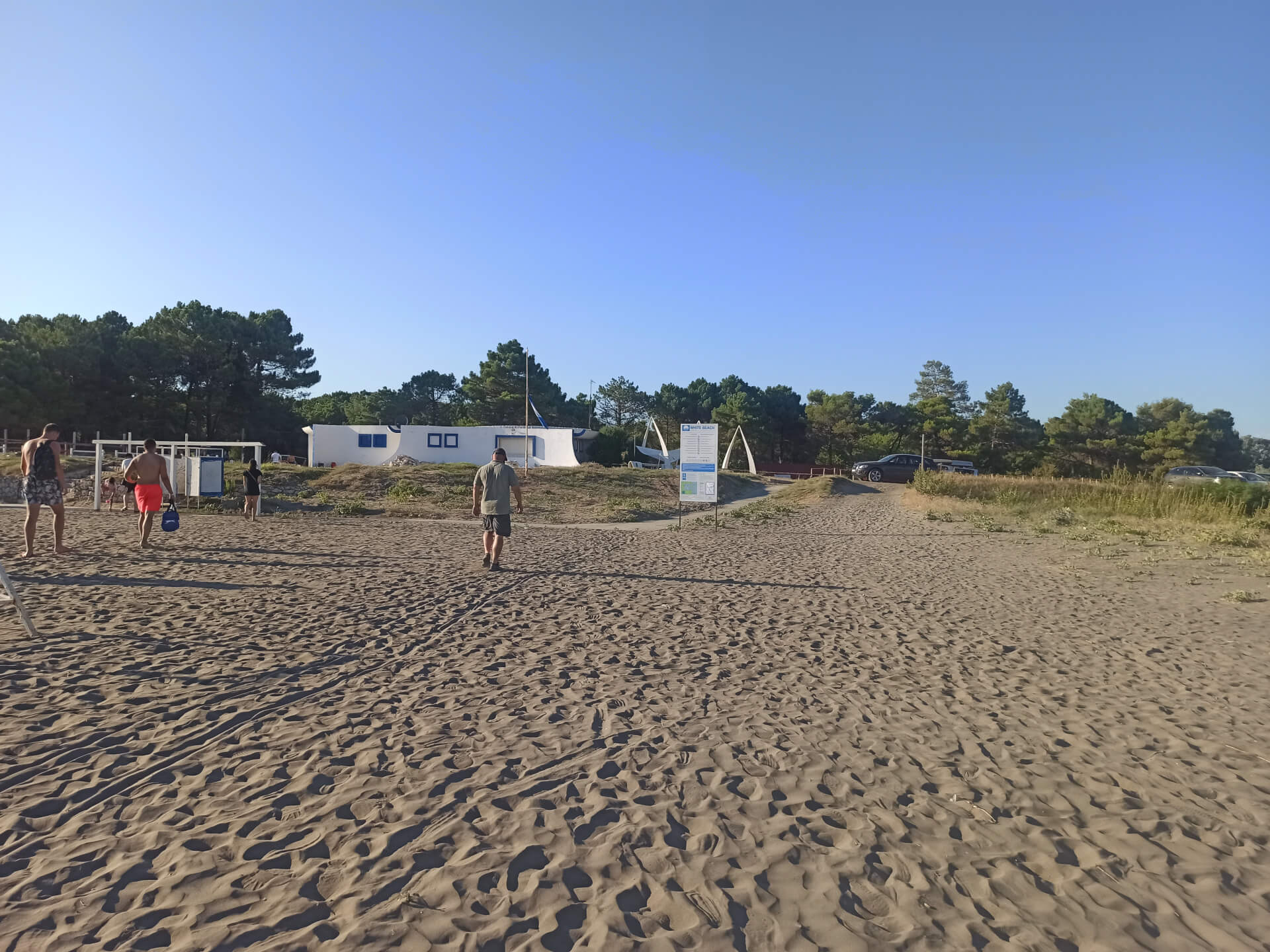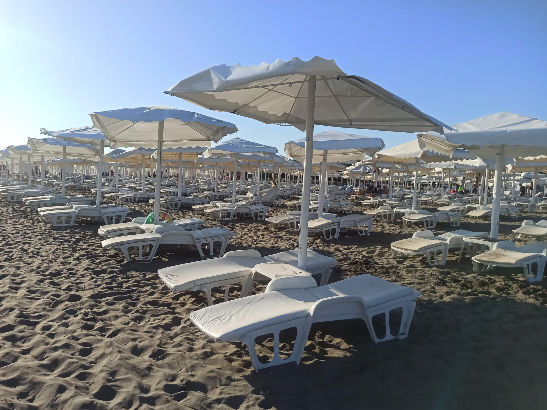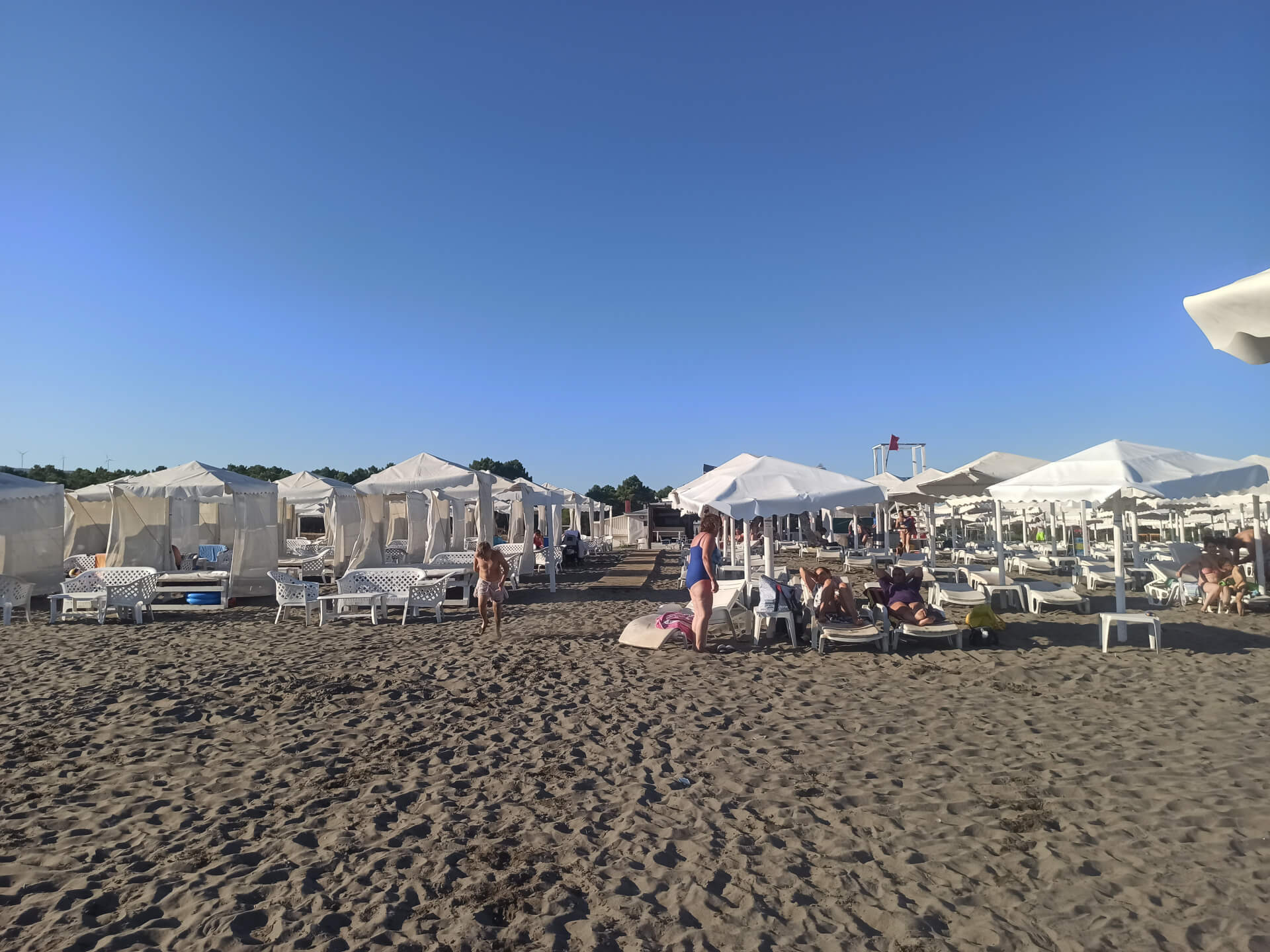Blue Flag. Blue Flag is a sign of a good quality beach with great services. The beach has beautiful white beach furniture - white loungers, sunbeds and umbrellas that you can rent to chill at this lovely sandy beach. The beach has toilets, showers, changing rooms, playground and parking.