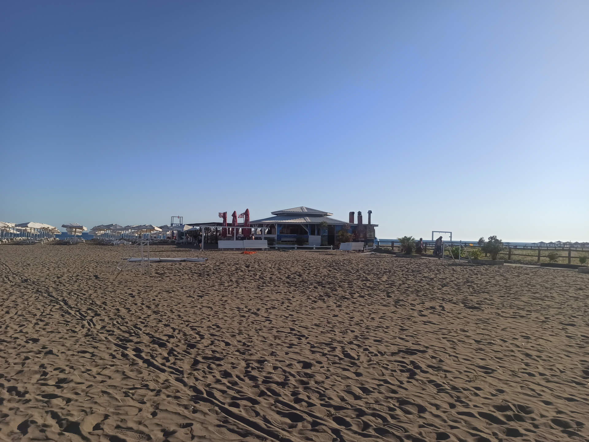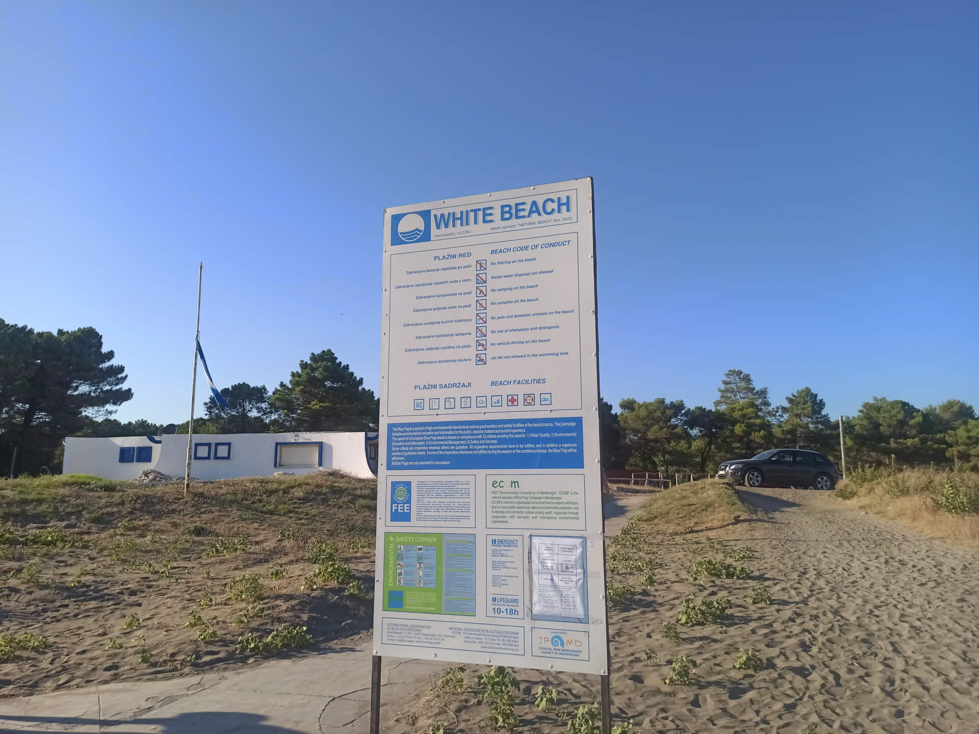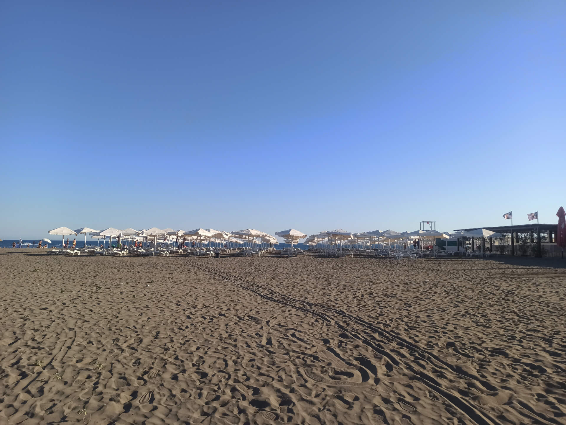 Blue Flag. Blue Flag is a sign of a good quality beach with great services. The beach has beautiful white beach furniture - white loungers, sunbeds and umbrellas that you can rent to chill at this lovely sandy beach. The beach has toilets, showers, changing rooms, playground and parking.