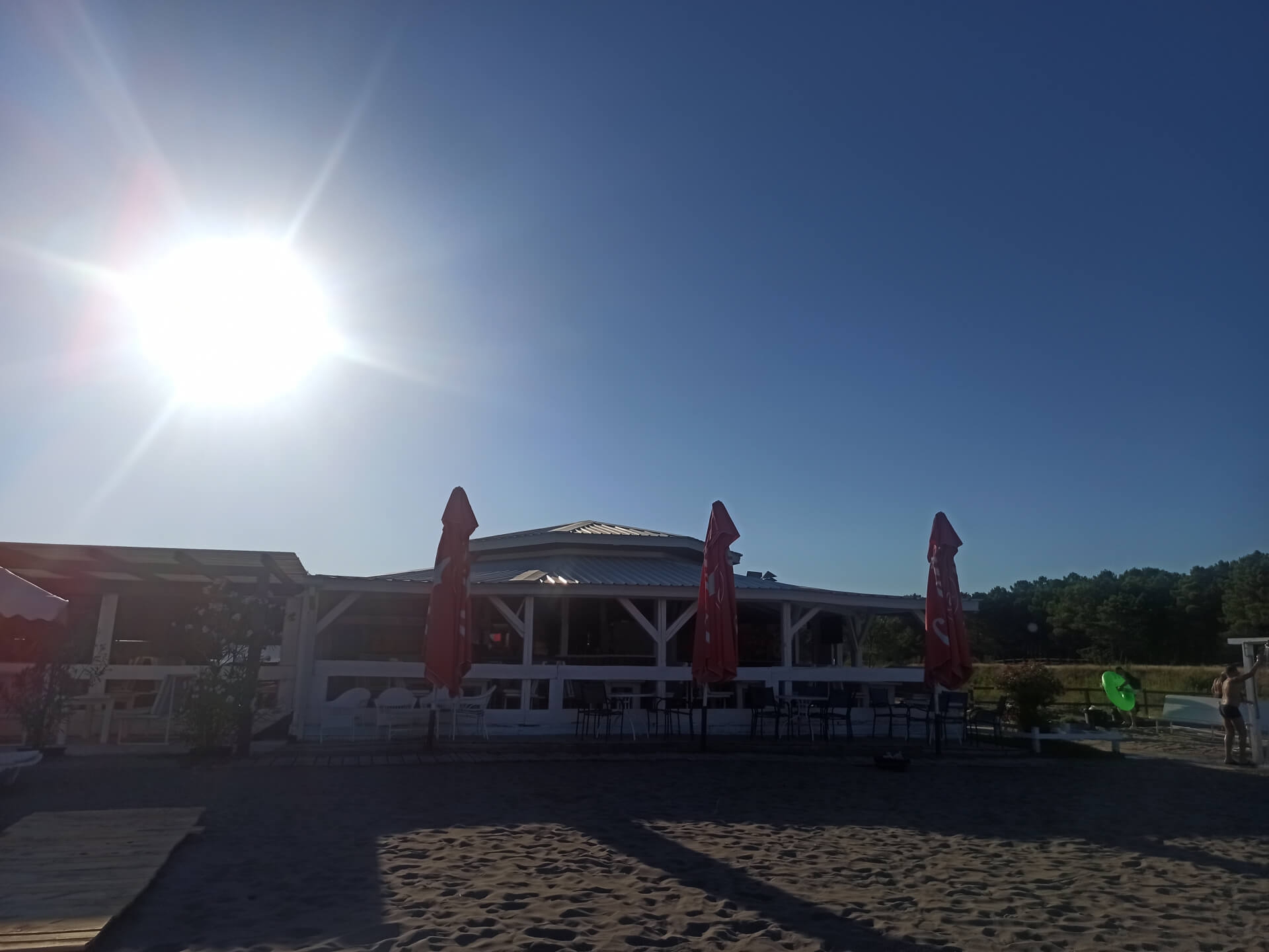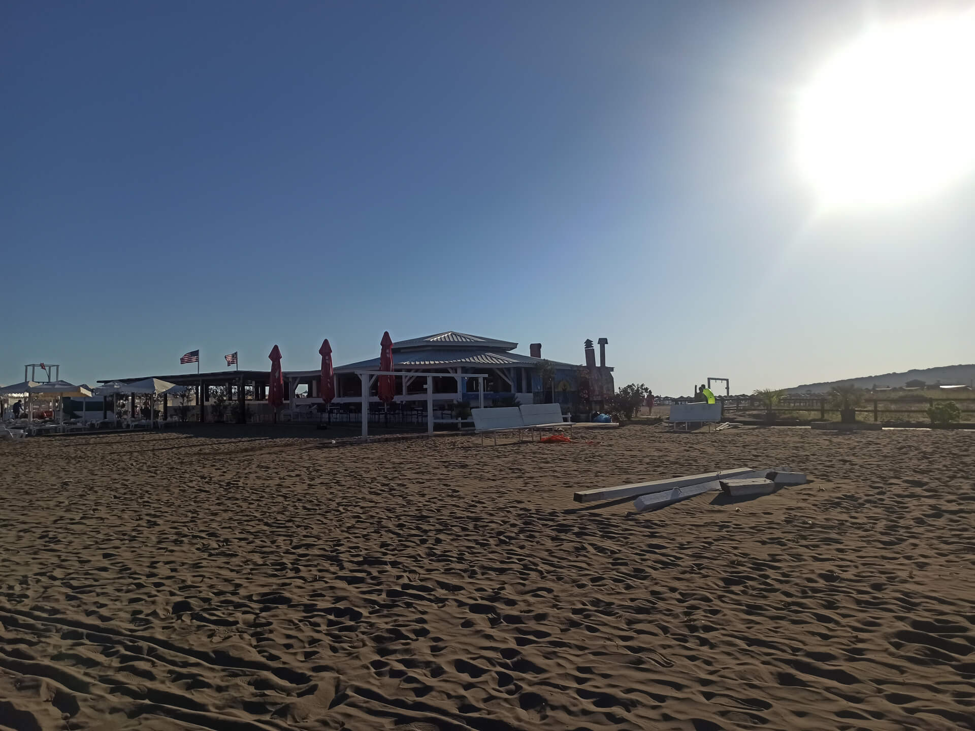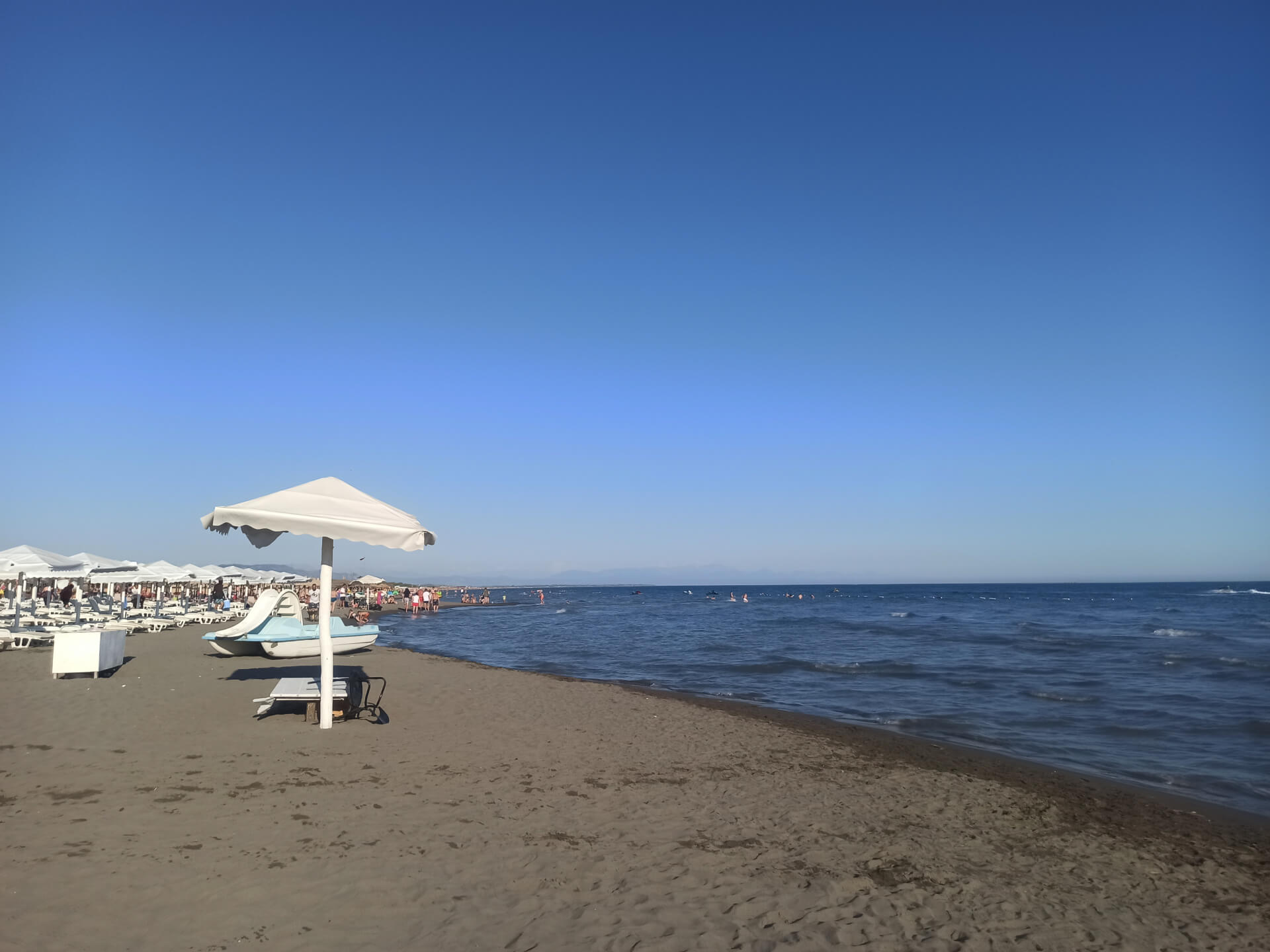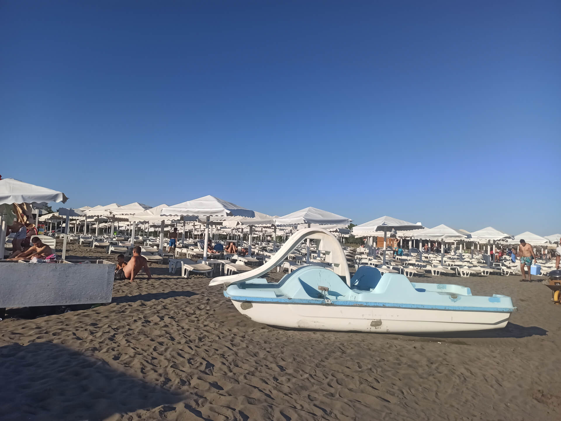 Blue Flag. Blue Flag is a sign of a good quality beach with great services. The beach has beautiful white beach furniture - white loungers, sunbeds and umbrellas that you can rent to chill at this lovely sandy beach. The beach has toilets, showers, changing rooms, playground and parking.