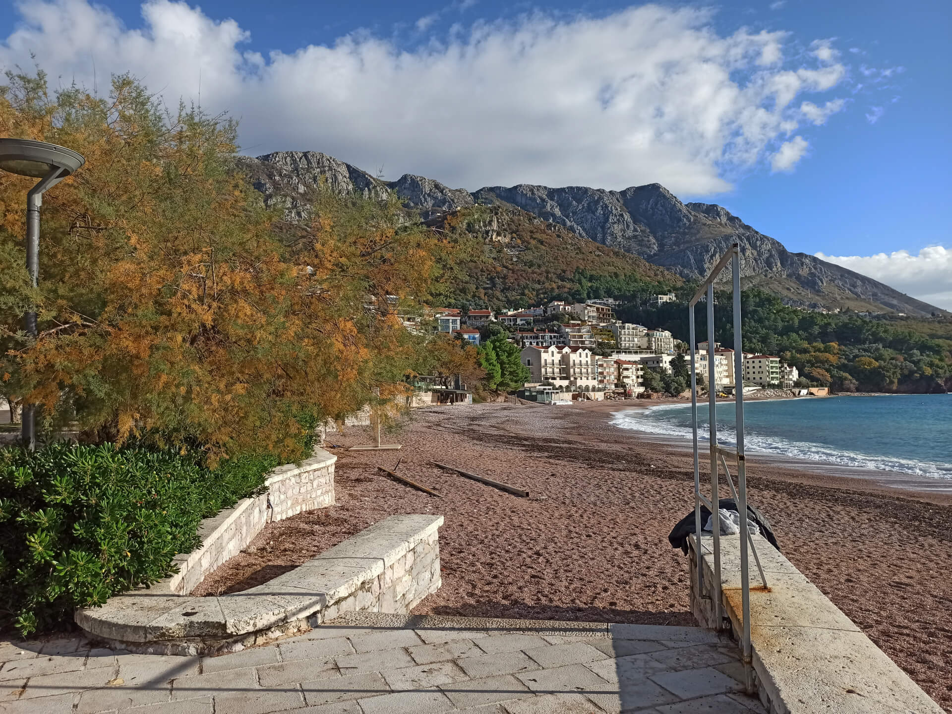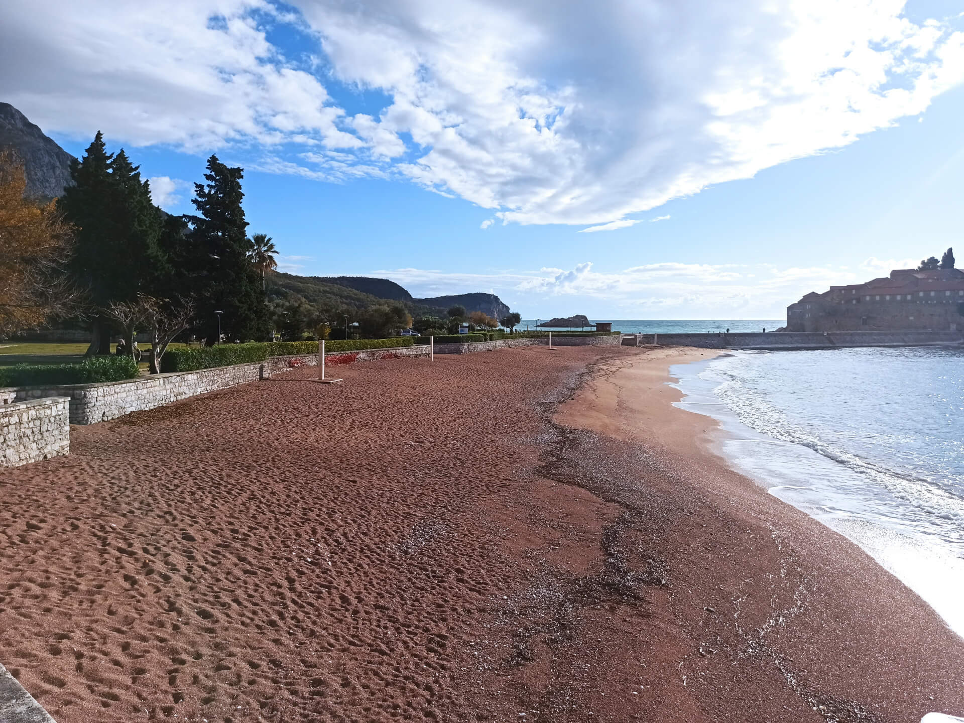 Sveti Stefan, surrounded by mountains. There are two absolutely amazing beaches from the both sides of the park - one of them is a free one and the second one - is paid one - for the guests of Sveti Stefan island and other luxurous tourists.