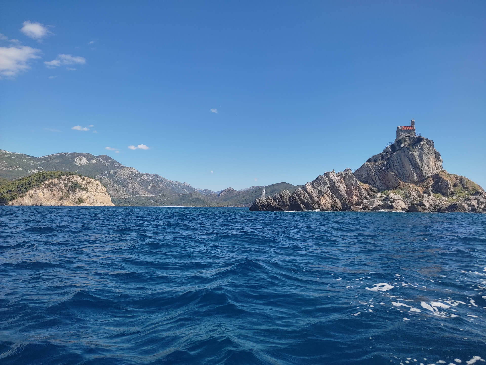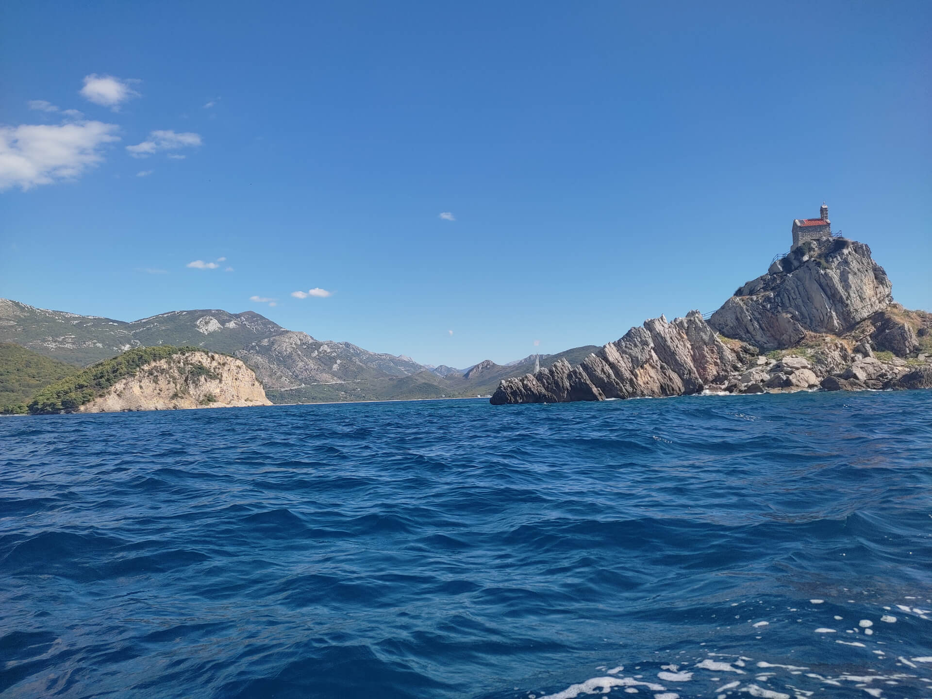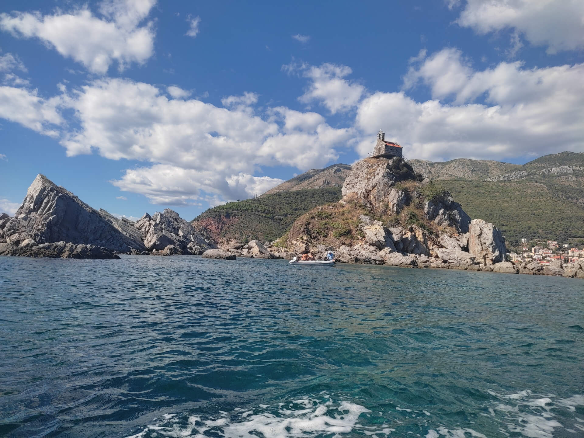 Petrovac beach. It's one of two islands that creates a beautiful coastline and famous landscape view. The island has a tiny church at the top of the hill. The legend says that the boat was wrecked at the island and for the gratitude for being saved, the sailors built there a church. If you make a wish and ring the bell in the church, your wish will come true.